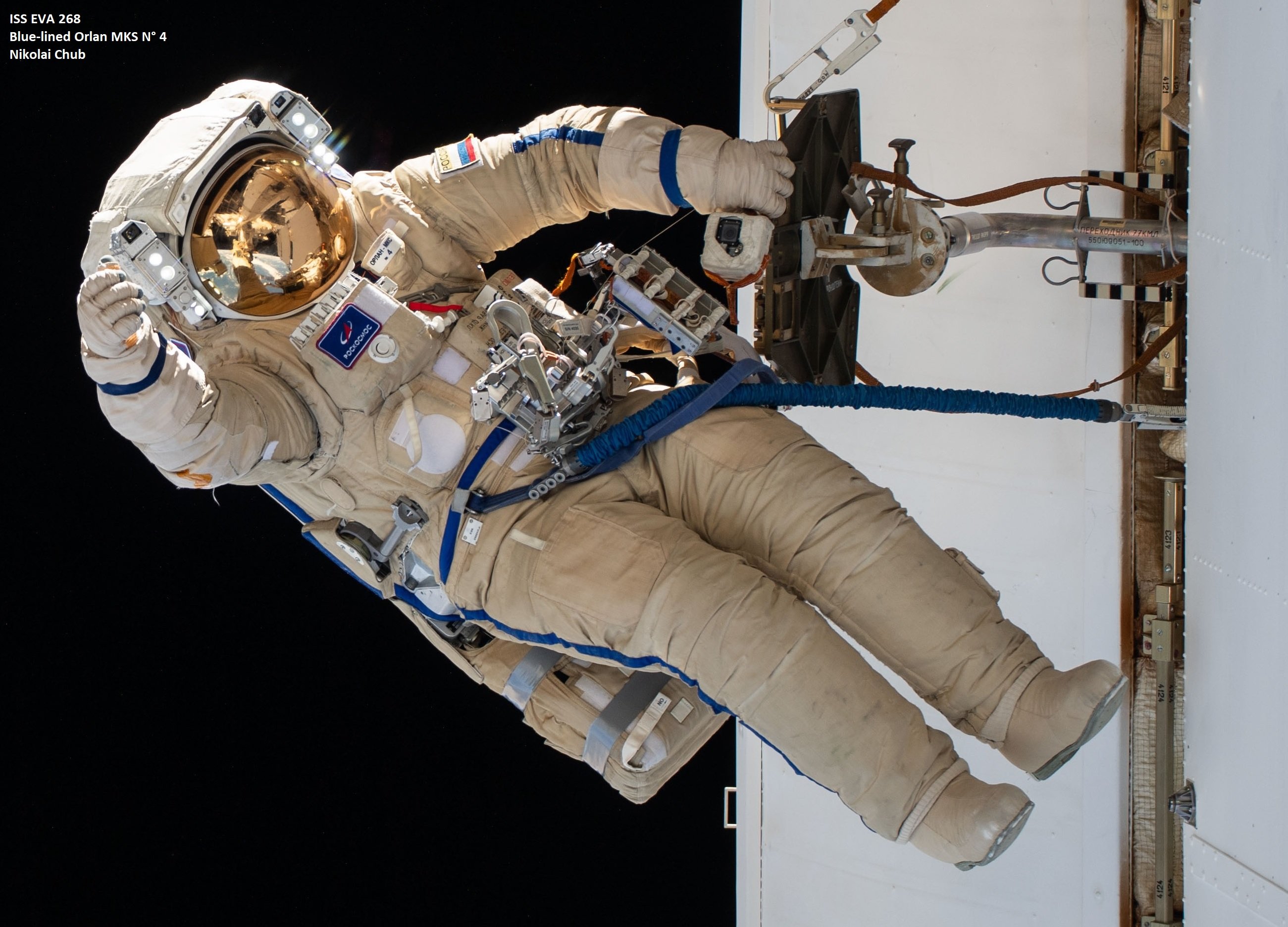 Colleague spacewalker, female Italian ESA astronaut Samantha Cristoforetti in the blue-striped Orlan MKS n° 4 spacesuit, wore an Omega Speedmaster on the lefthand and a quartz-movement "Orient" wrist watch on het righthand forearm. (Orient? identified in SWFG - Space Watches Facebook Group)
