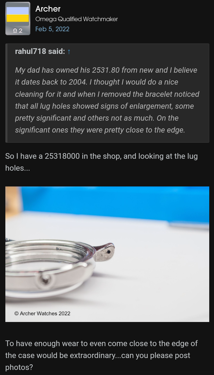 My dad has owned his 2531.80 from new and I believe it dates back to 2004. I thought I would do a nice cleaning for it and when I removed the bracelet noticed that all lug holes showed signs of enlargement, some pretty significant and others not as much. On the significant ones they were pretty close to the edge. It’s only stayed on the bracelet this whole time and he’s not one for swapping straps. My guess is time + dirt was the cause.