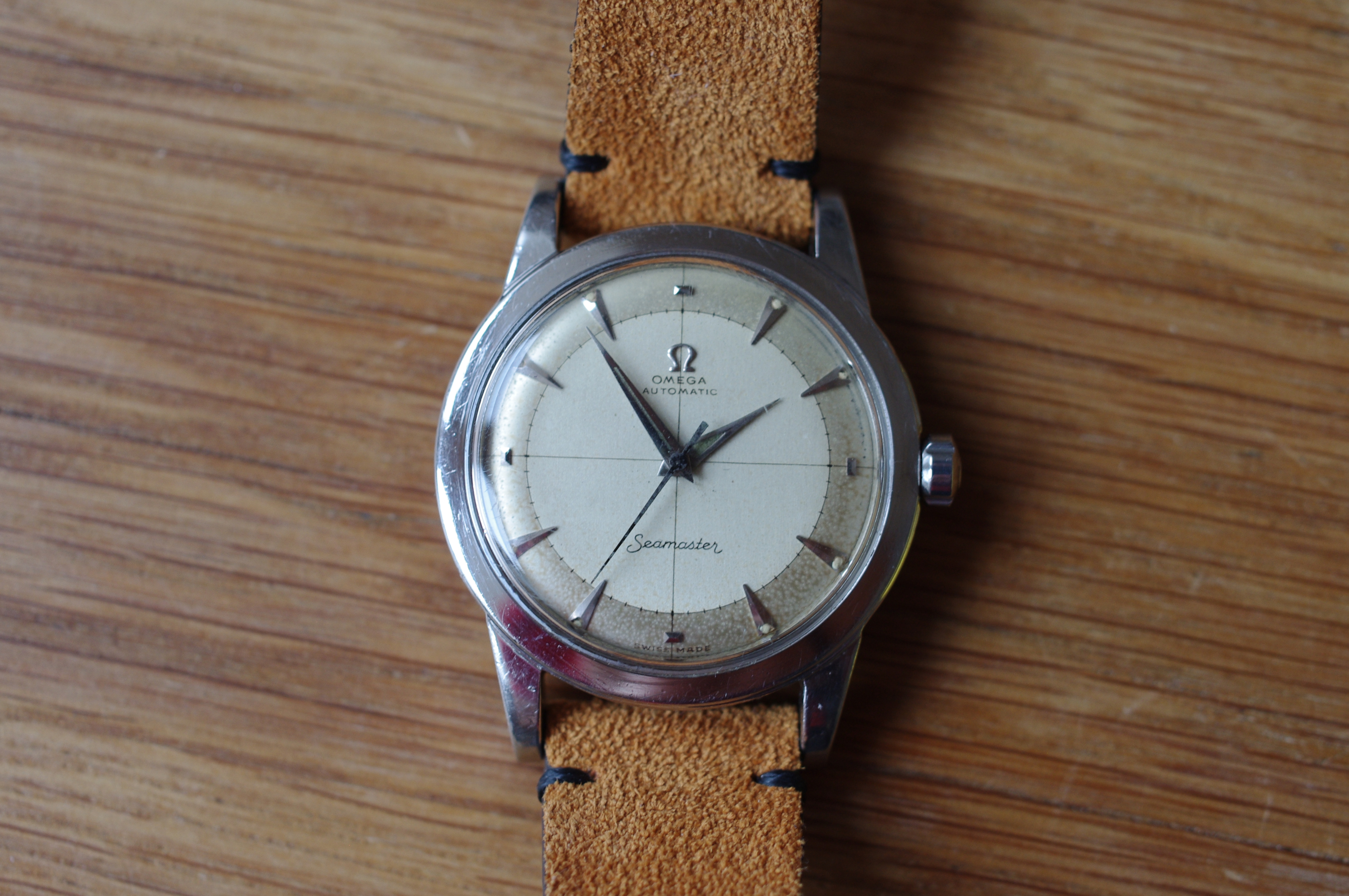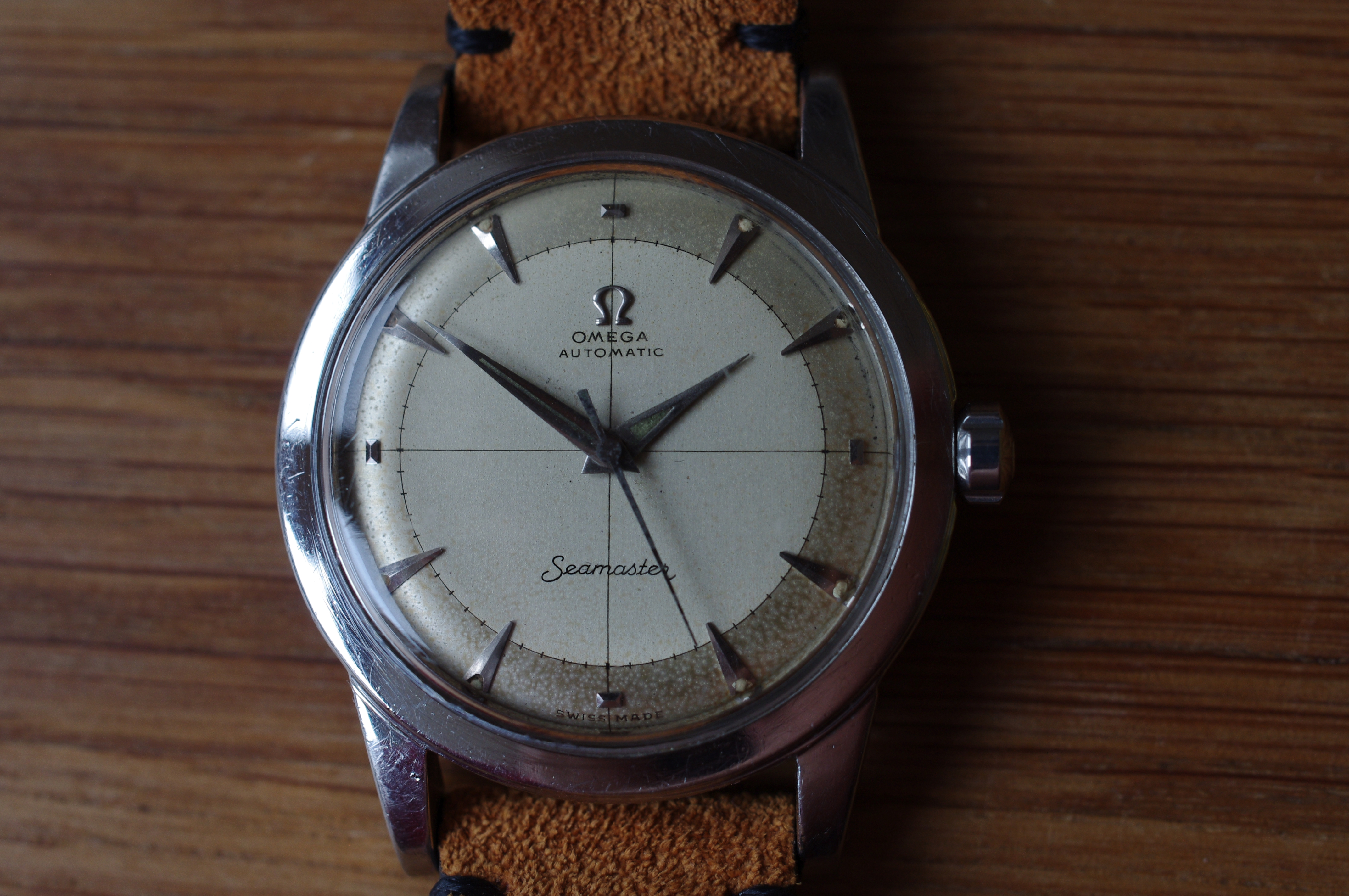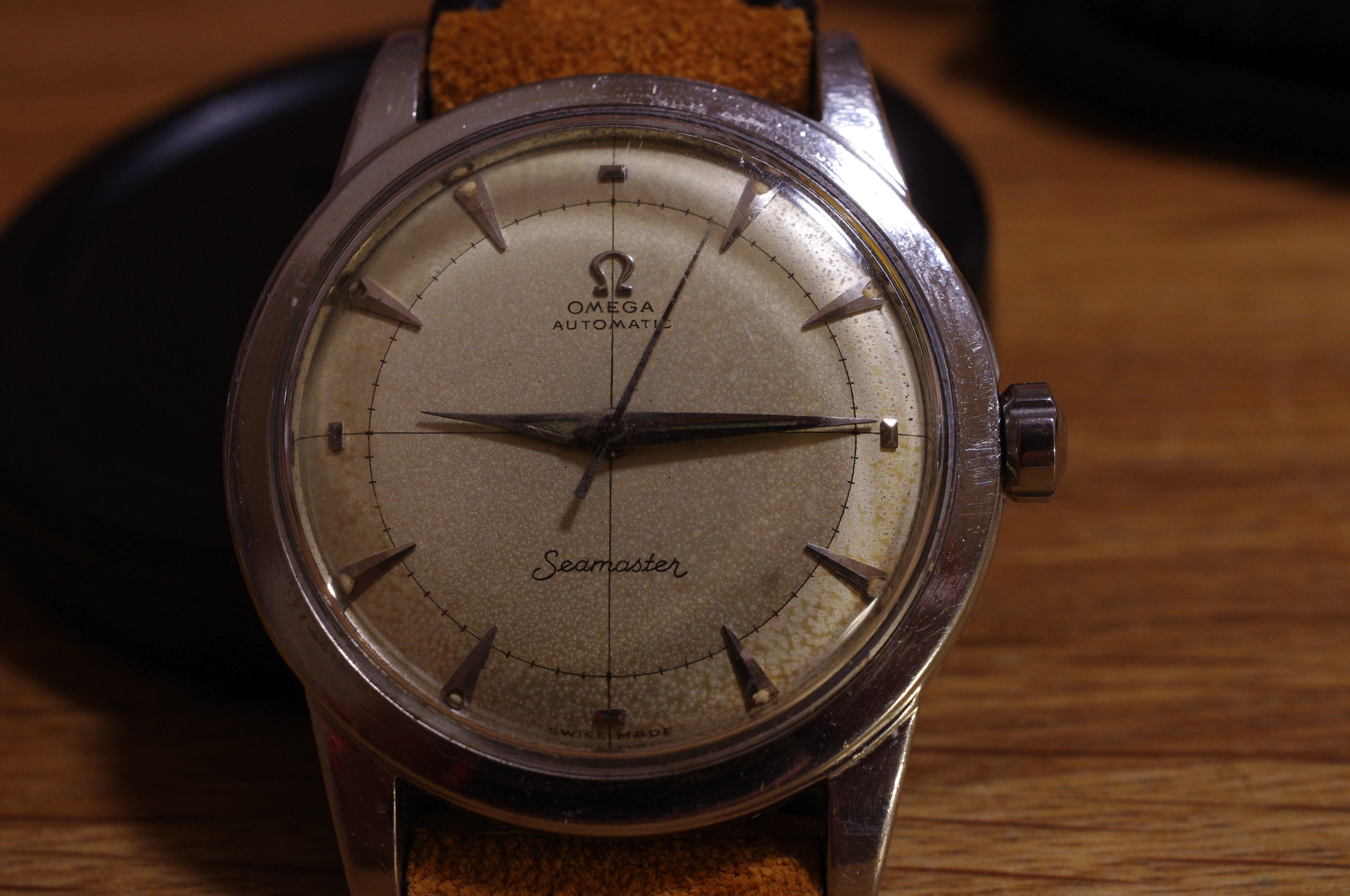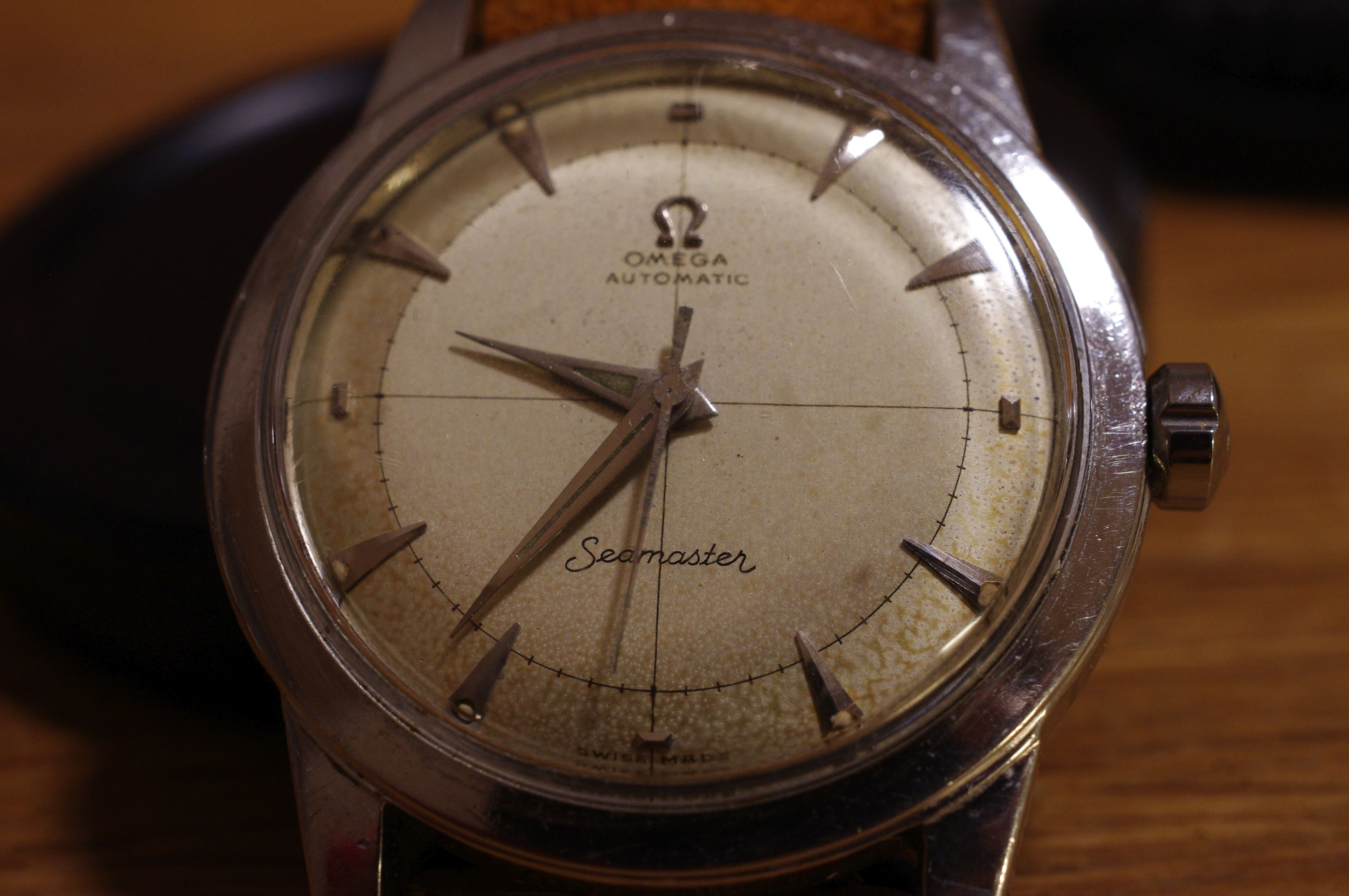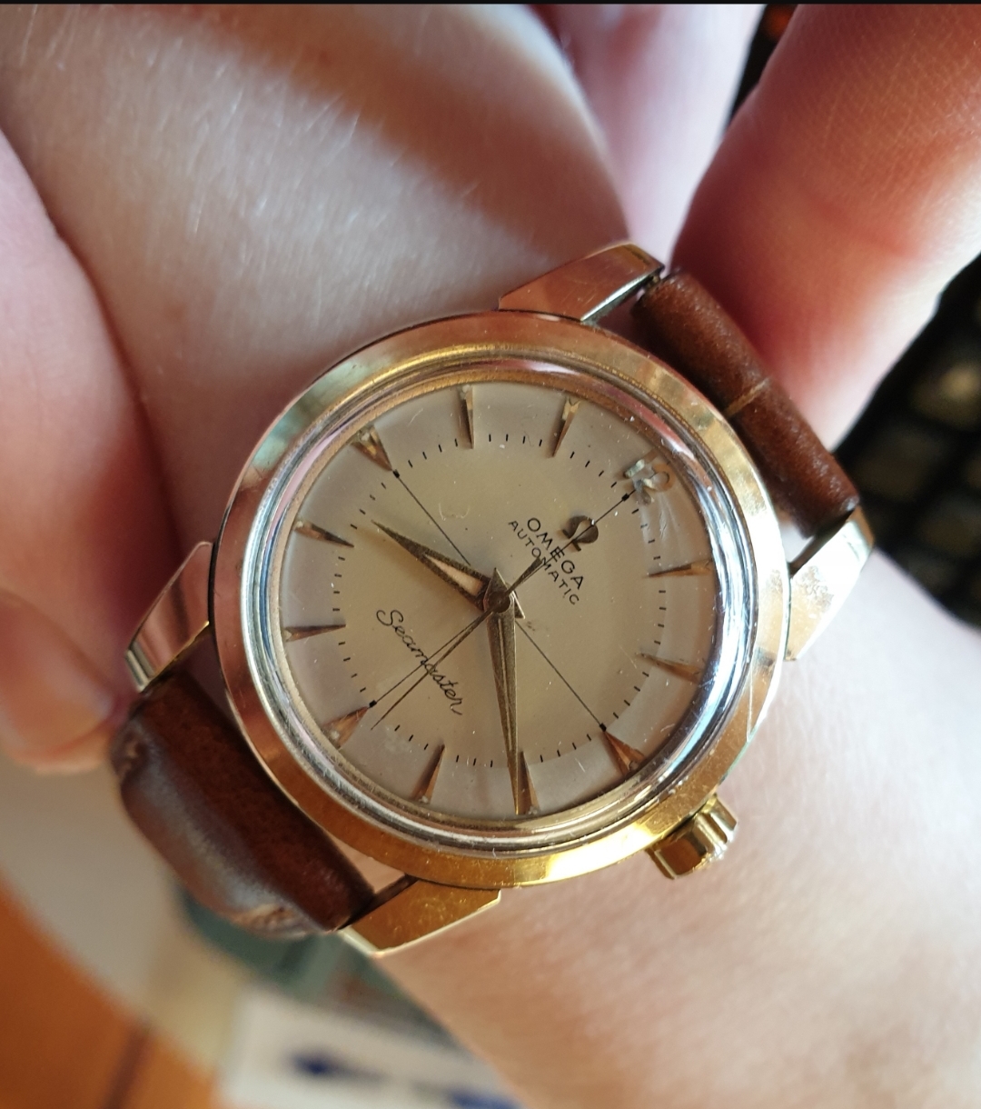 ·During late night internet browsing and after a few glasses of wine, this seamaster has caught my eye (especially the cross hair dial with patina), so I did a spontaneous purchase without any research on it. Vintage Omega world is a quite new to me... It should be 2577-8 (it is written on the caseback) with cal 351 bumper (well yes, this is inside). Serial is 12 mio. I like to know your opinions on the dial and hands mainly. The dial seems to be original (not redial, but is it correct to the watch?). Also, I haven't seen this combination of hands (seamaster calendar maybe?). What do you think? Many thanks. I made a few quick photos (nor really good ones, bacause of poor light conditions).