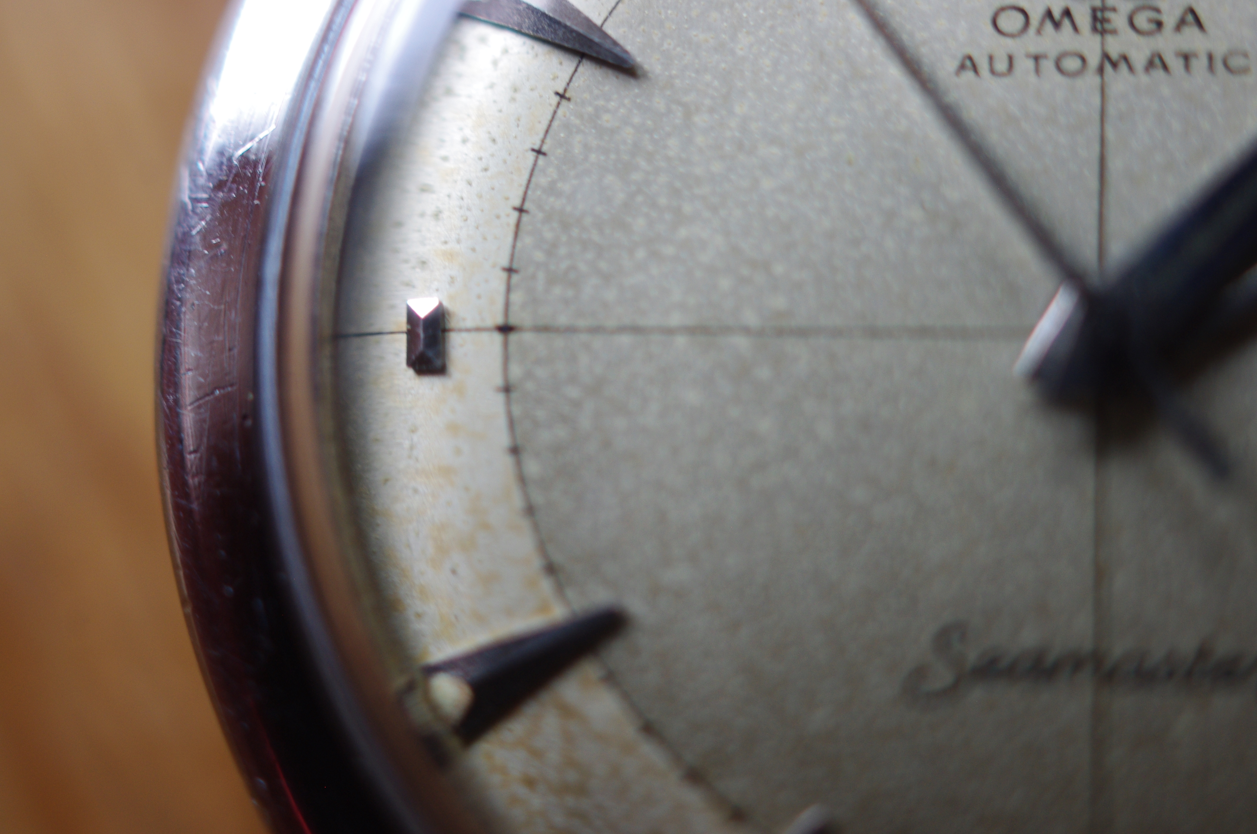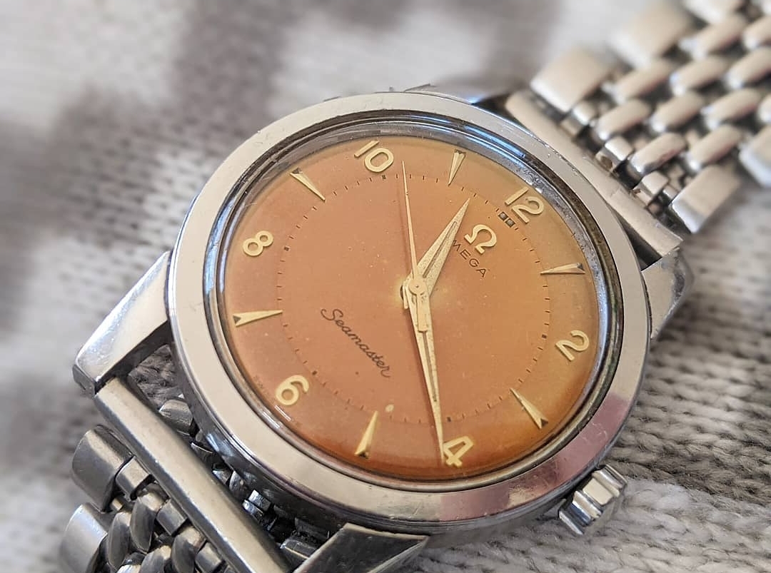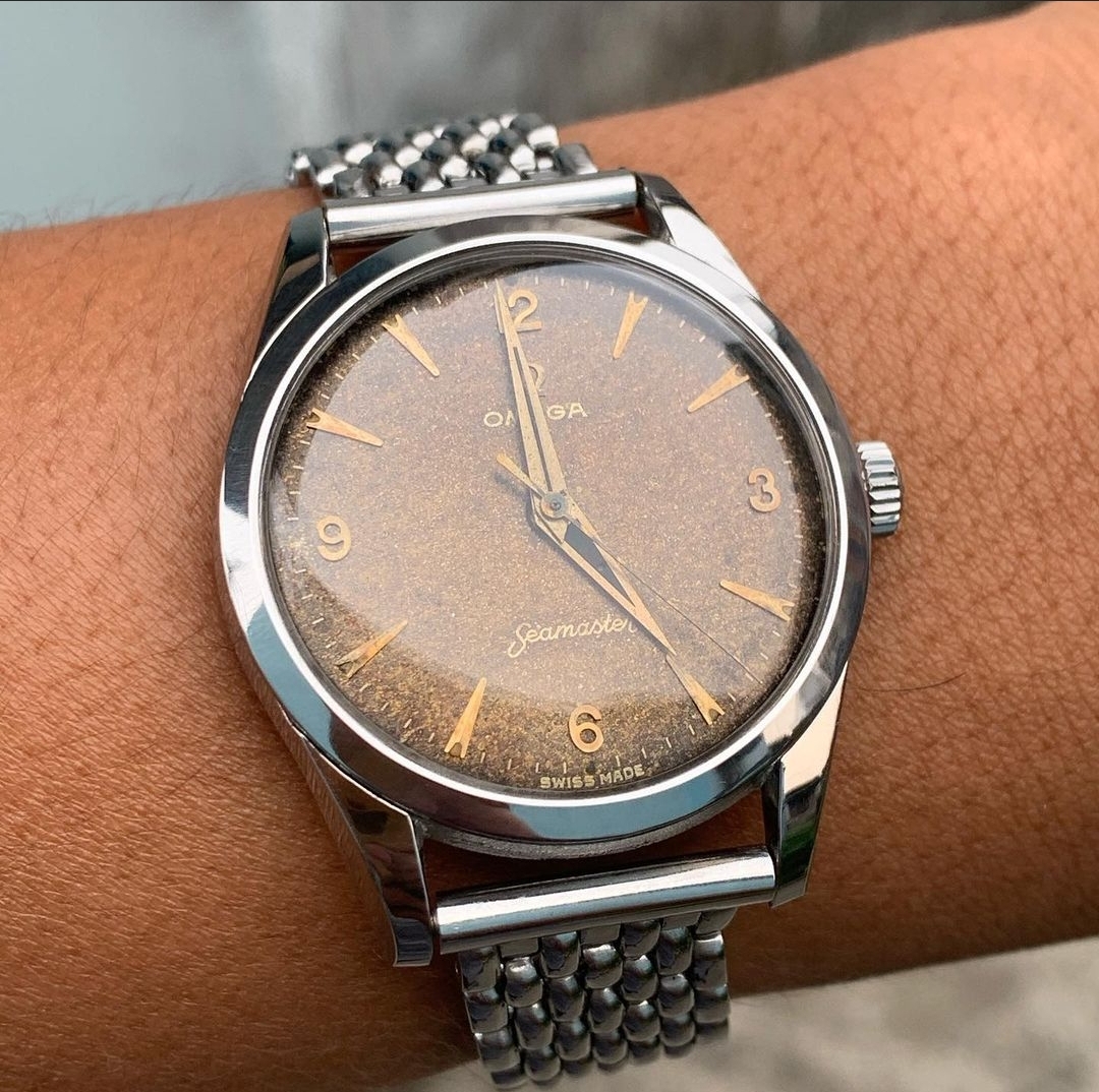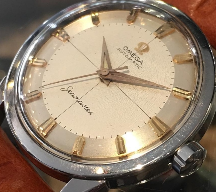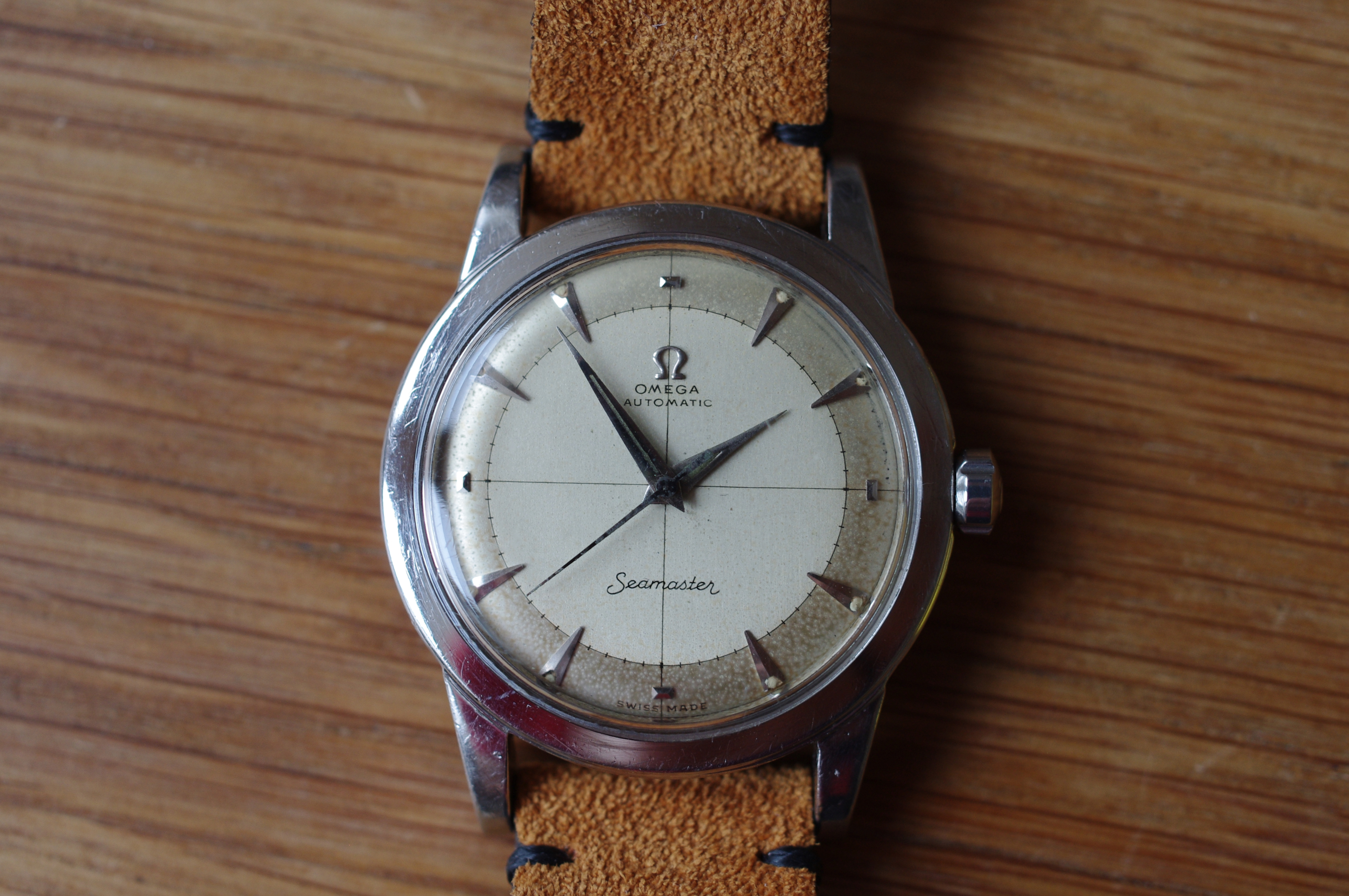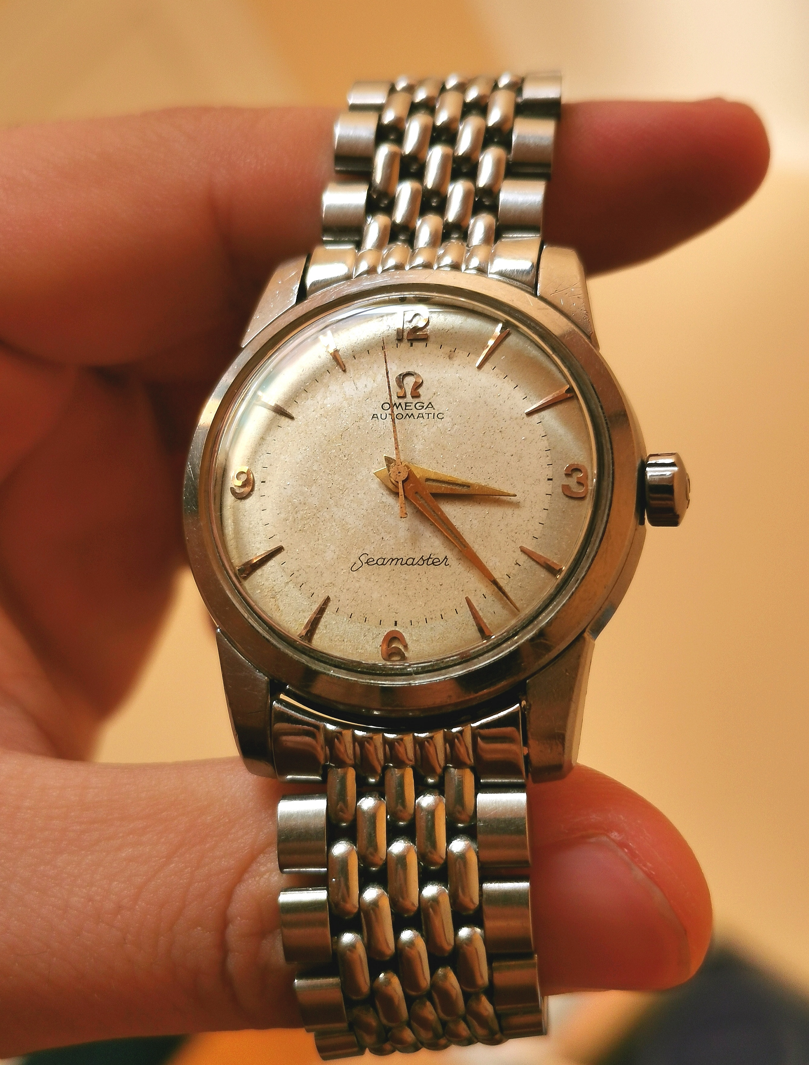 ·During late night internet browsing and after a few glasses of wine, this seamaster has caught my eye (especially the cross hair dial with patina), so I did a spontaneous purchase without any research on it. Vintage Omega world is a quite new to me... It should be 2577-8 (it is written on the caseback) with cal 351 bumper (well yes, this is inside). Serial is 12 mio. I like to know your opinions on the dial and hands mainly. The dial seems to be original (not redial, but is it correct to the watch?). Also, I haven't seen this combination of hands (seamaster calendar maybe?). What do you think? Many thanks. I made a few quick photos (nor really good ones, bacause of poor light conditions).