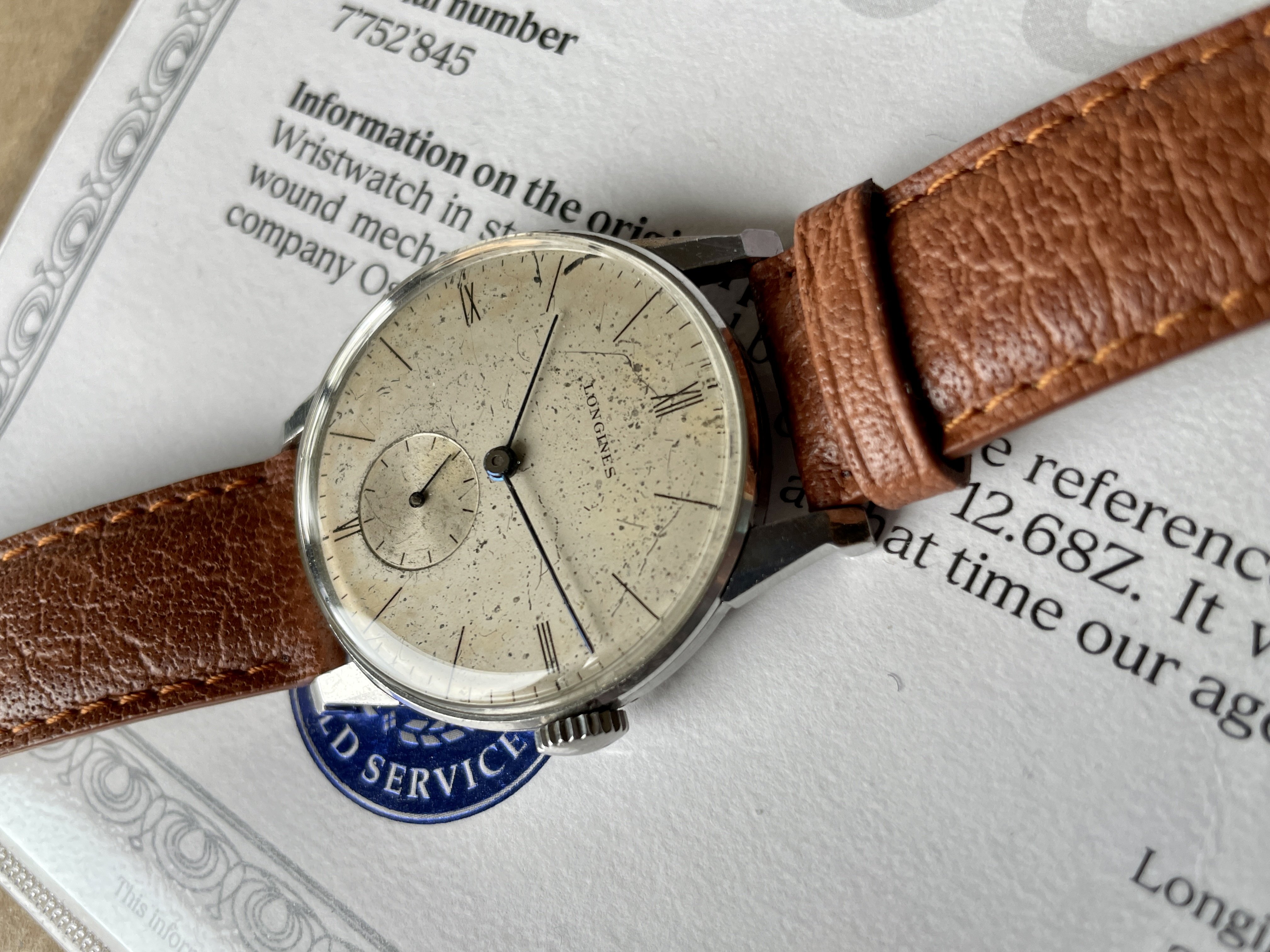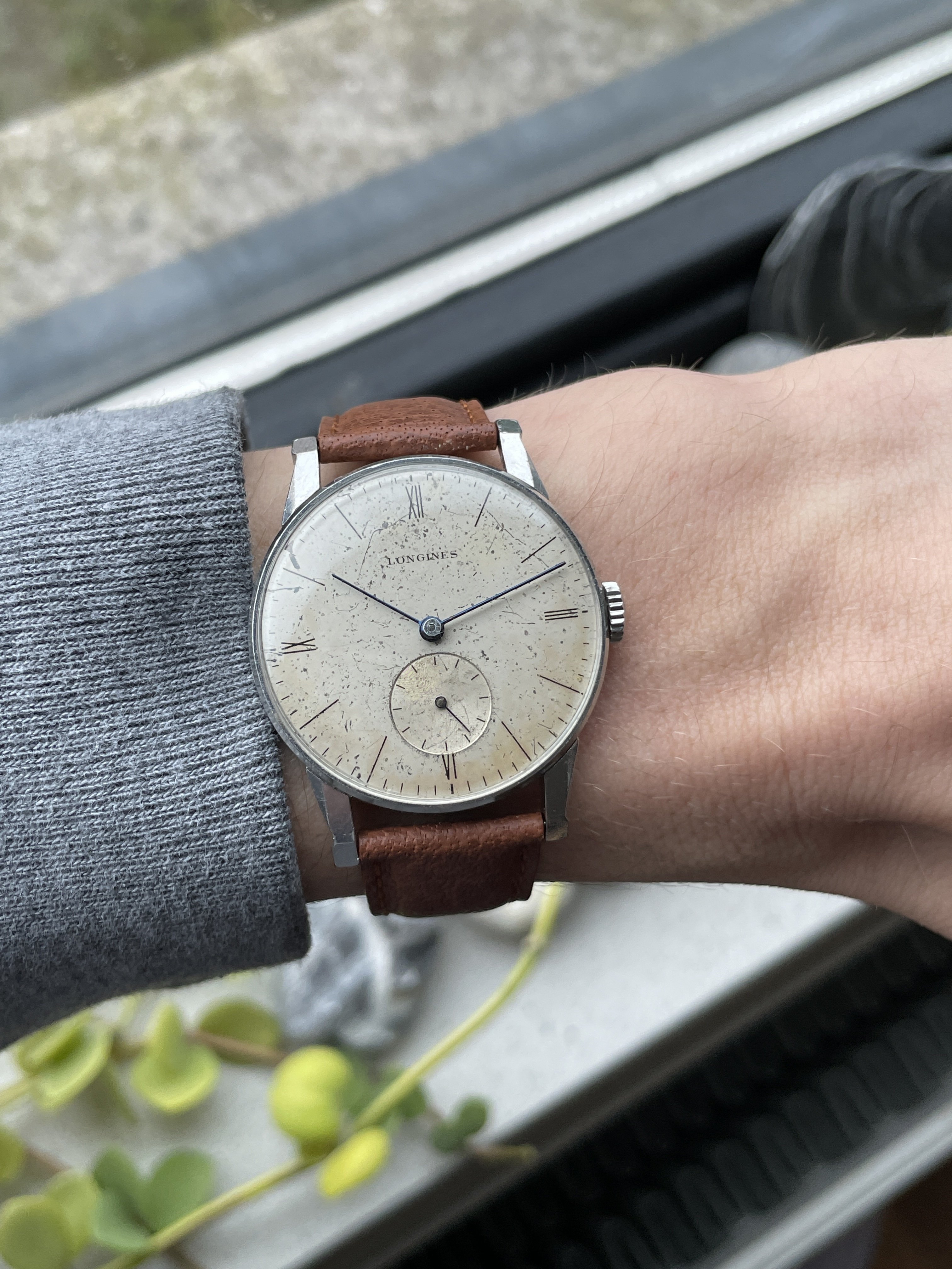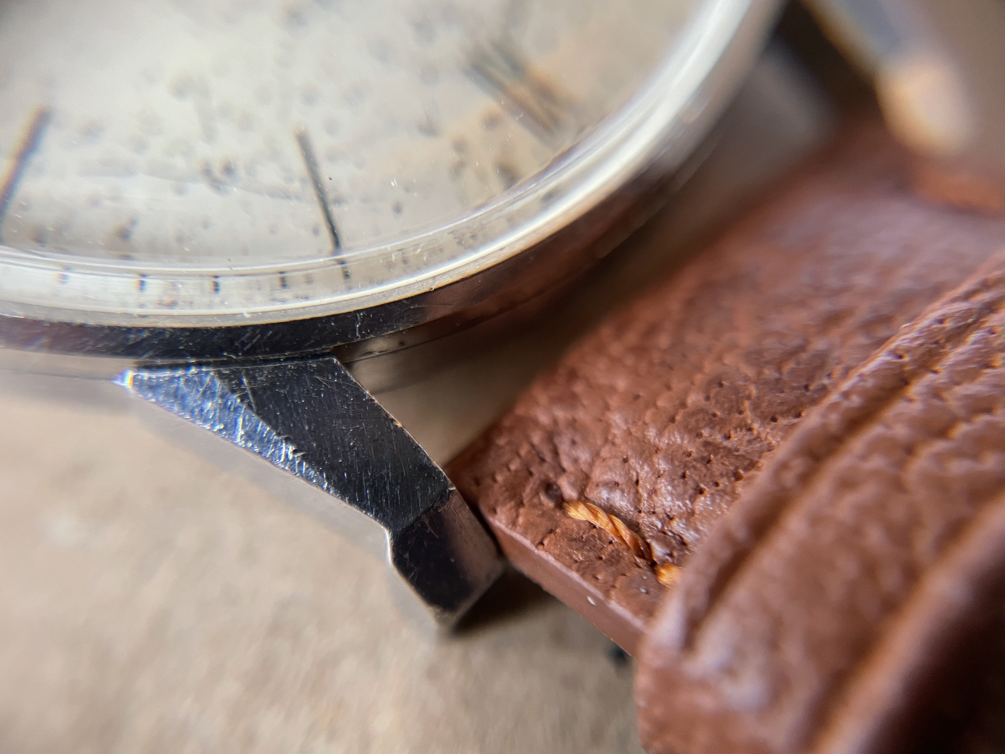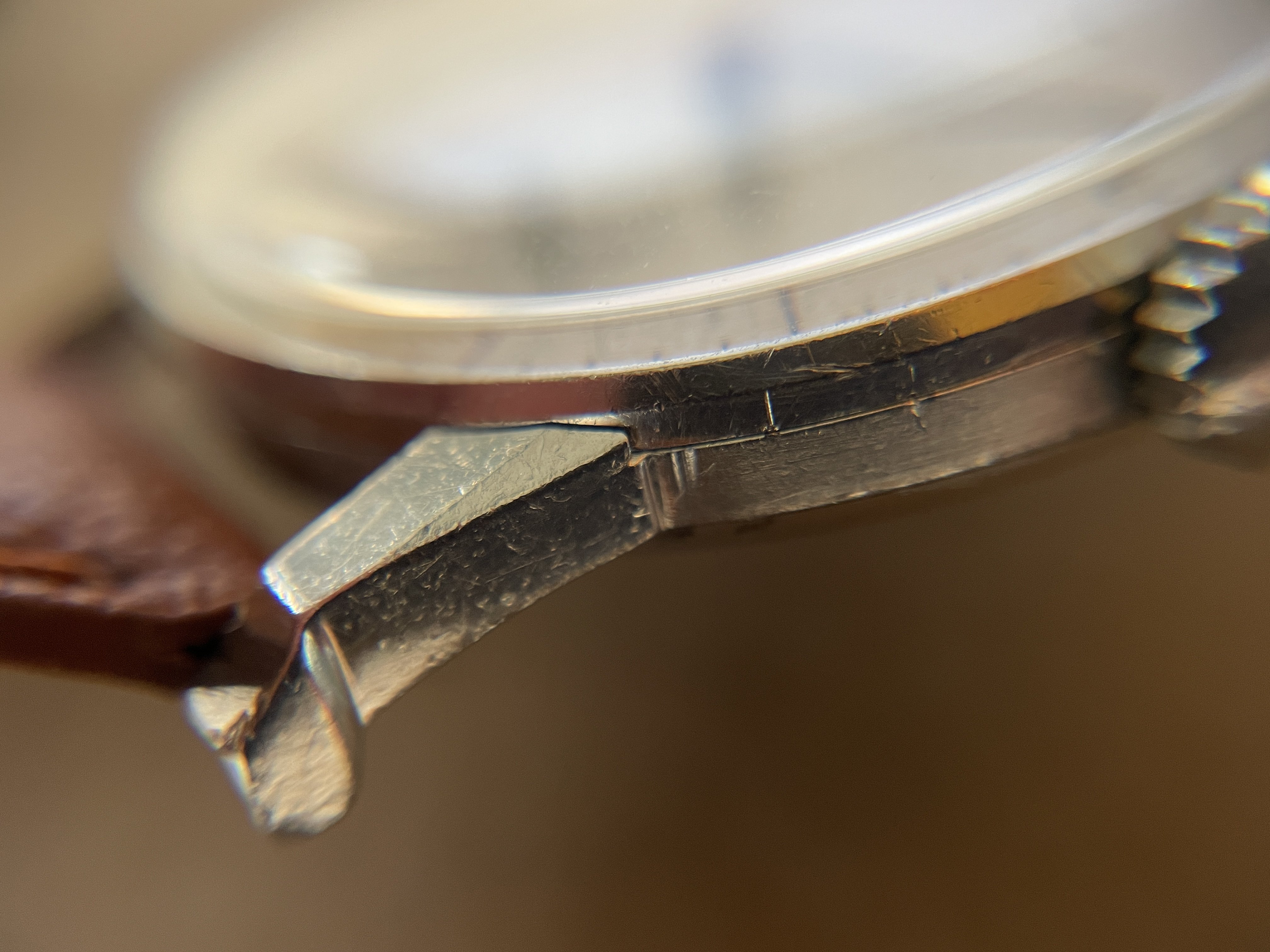 The watch obviously has lived a life and has scratches and wear on the case and dial. However, the case is sharp and unpolished, with fancy lugs which I do find appealing.