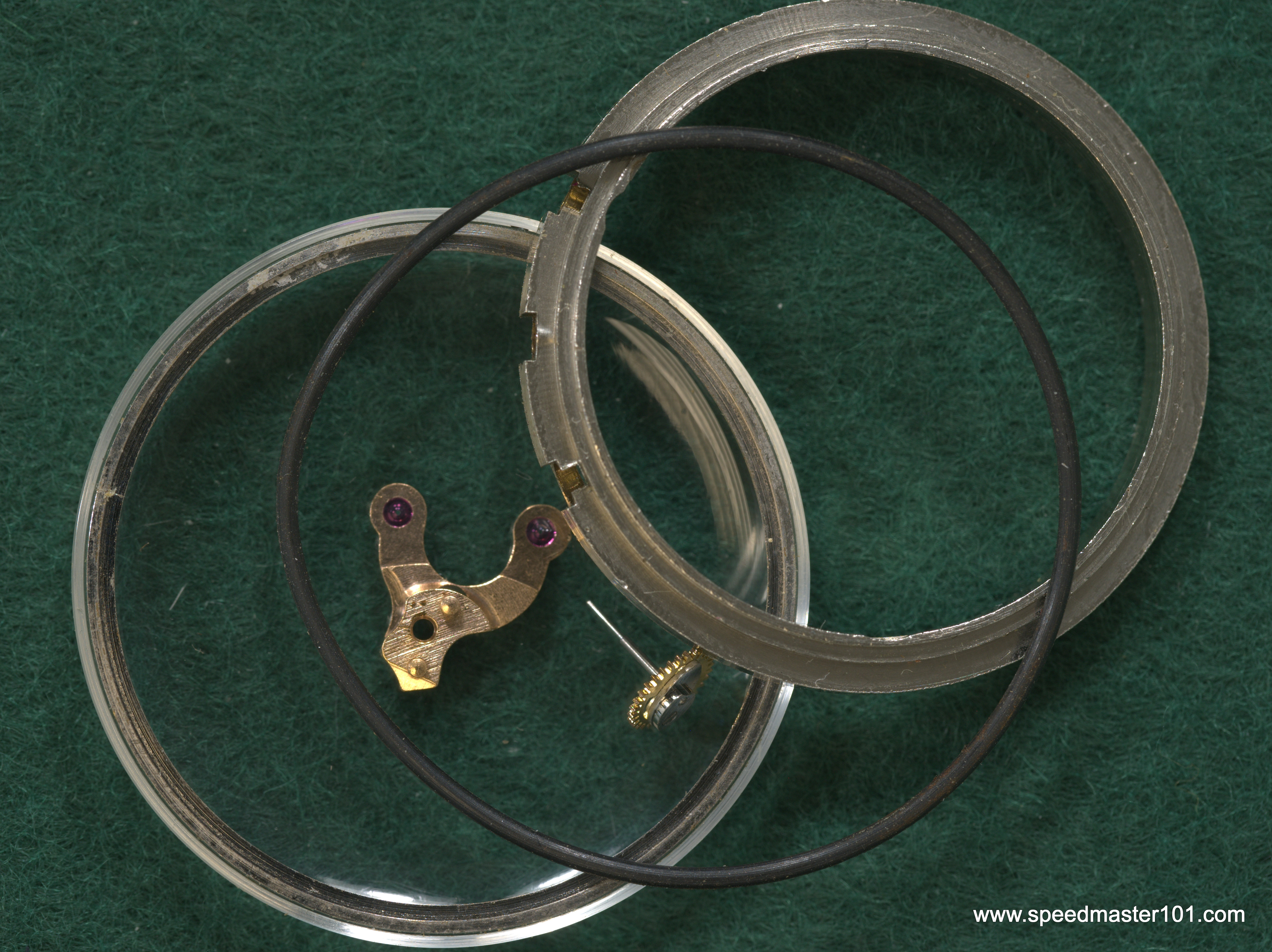The movement bridge. A little wheel, and the crystal. The movement ring was also replaced. The pushers look in good condition, but I did not replace them - they might have been previously.
