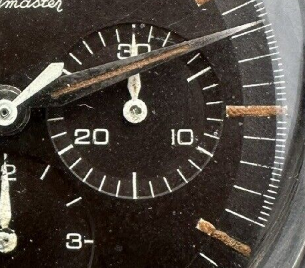 Look at the surface of the dial, on the lip of the subdial - this is blotching which is probably endemic on the dial.