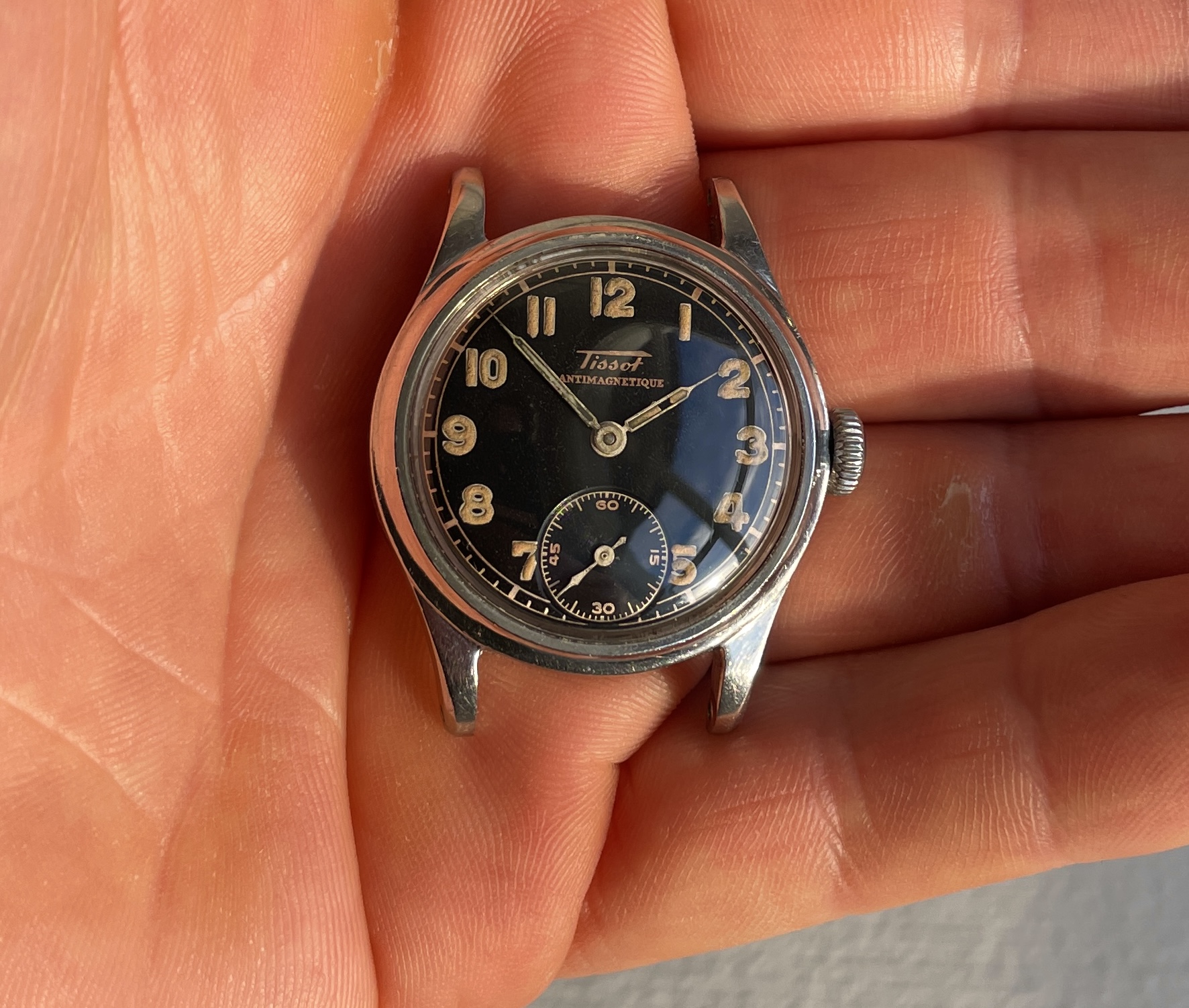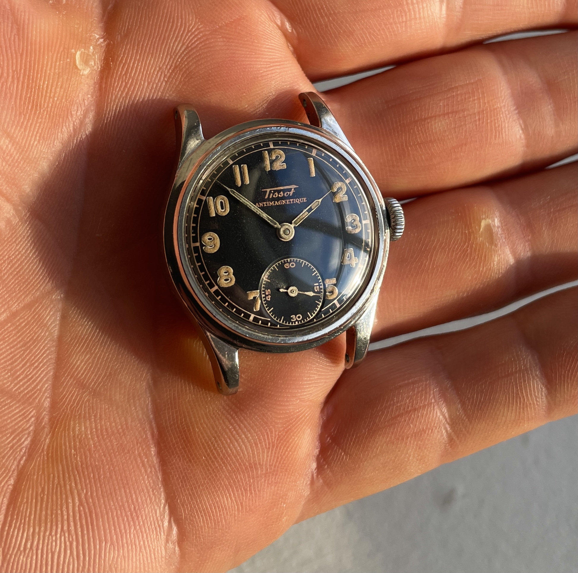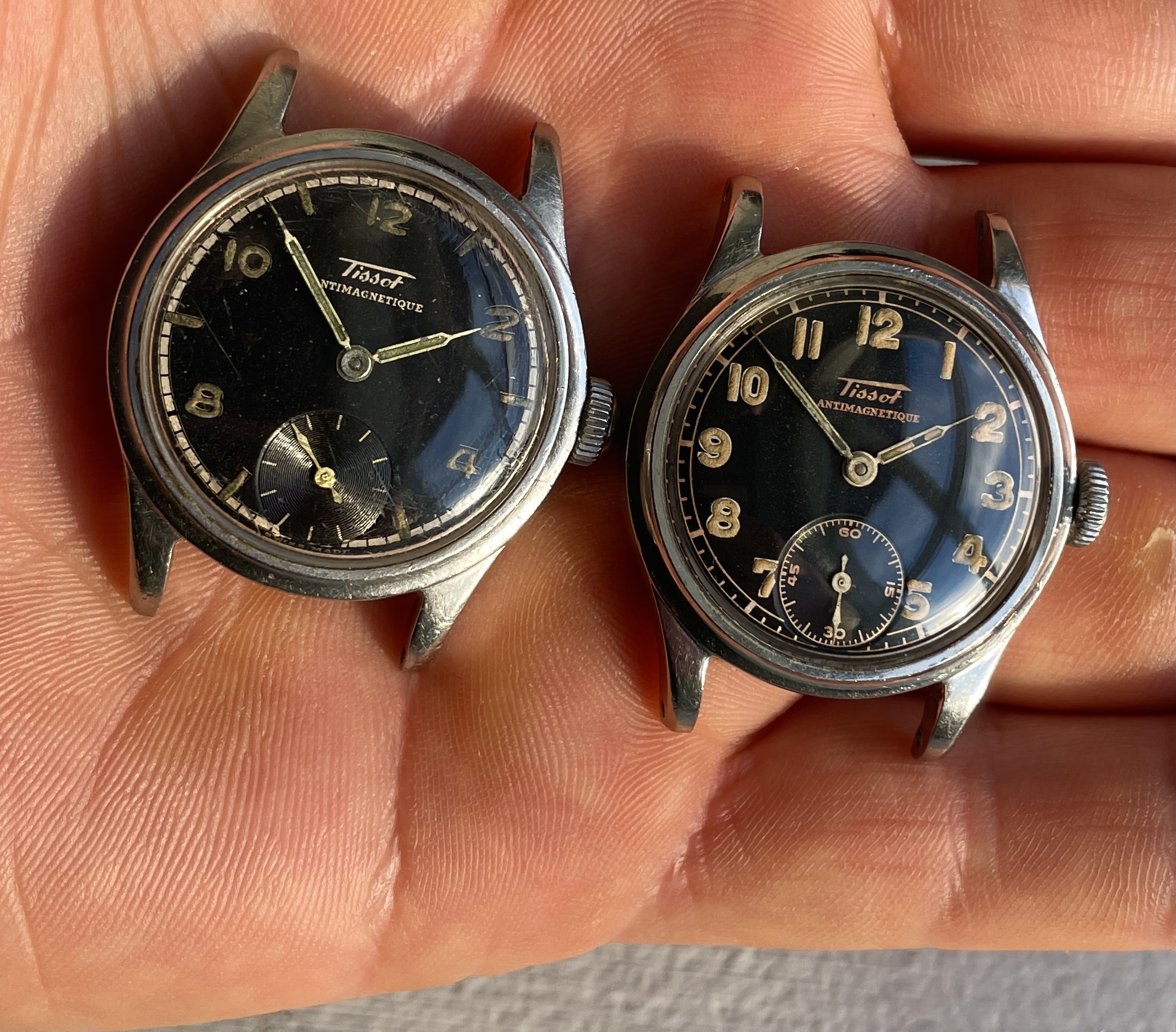 ·Two Tissot from 1942 and 1943 with black dial and puffy radium in two different dial variations. This is the "smaller" Tissot case that measures approximately 31mm excluding crown and takes 16mm straps, the early 40's Tissot models before they got a reference number.