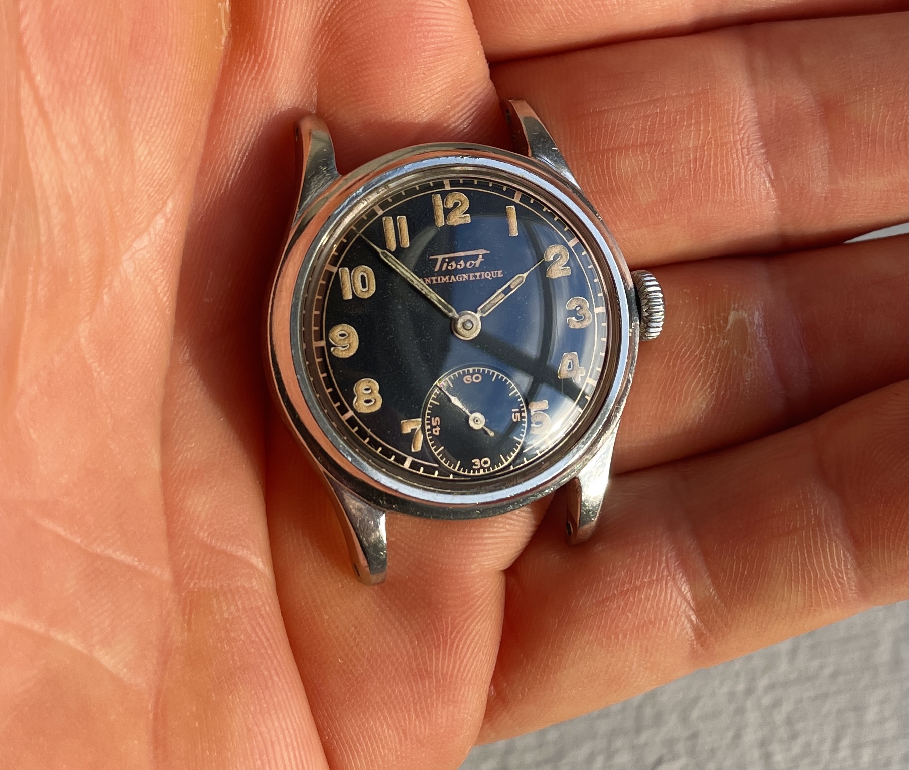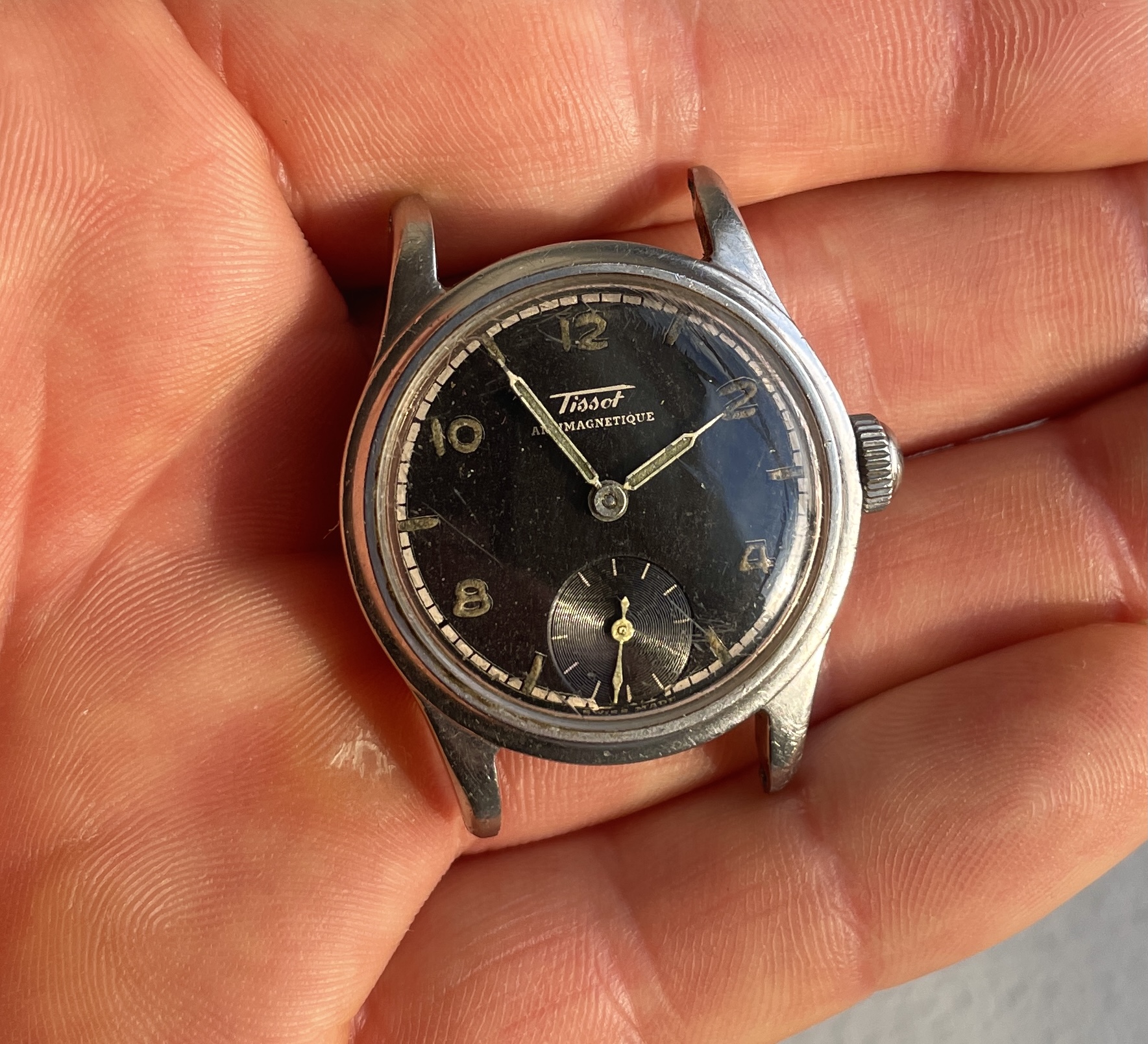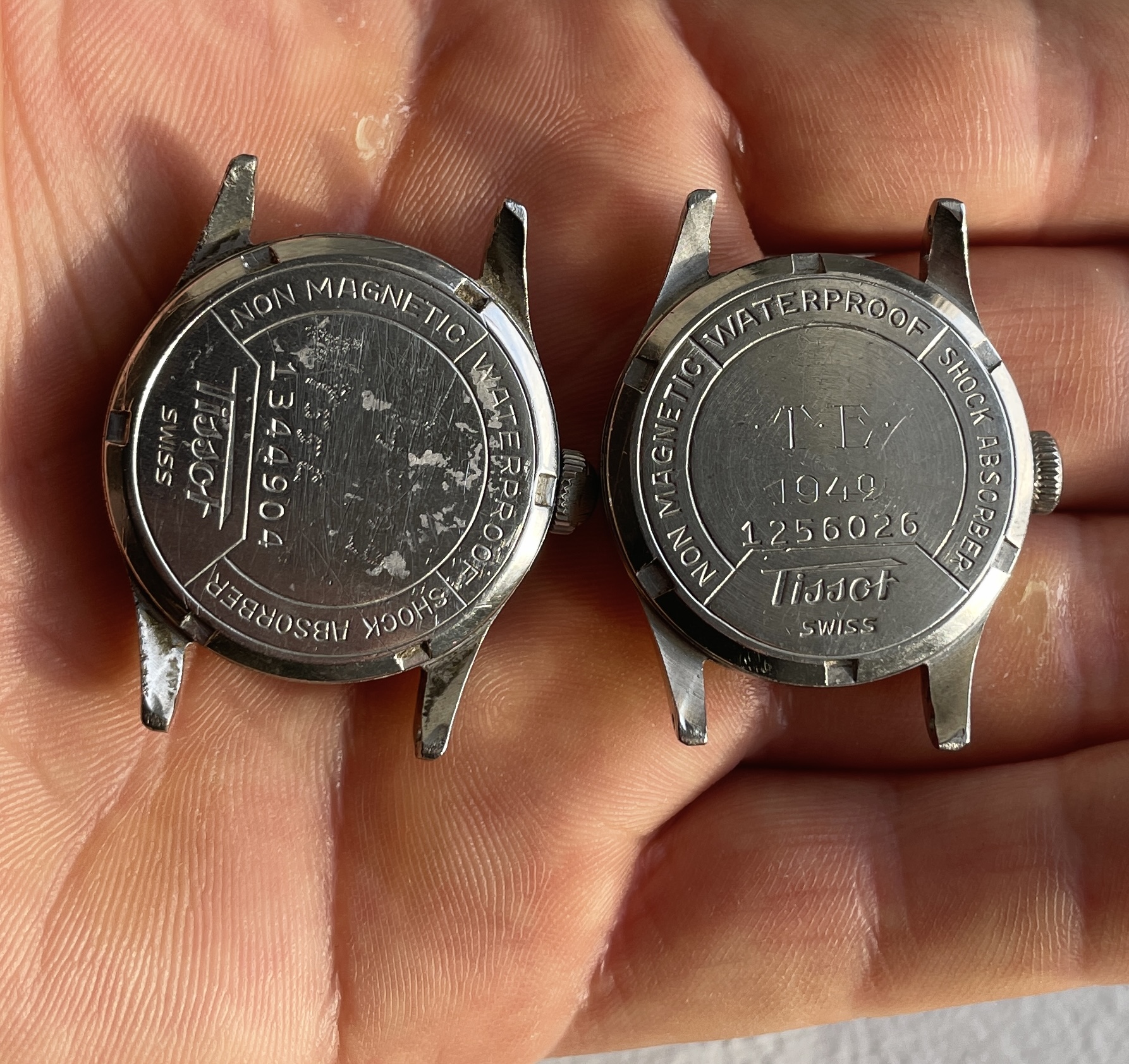 ·Two Tissot from 1942 and 1943 with black dial and puffy radium in two different dial variations. This is the "smaller" Tissot case that measures approximately 31mm excluding crown and takes 16mm straps, the early 40's Tissot models before they got a reference number.
