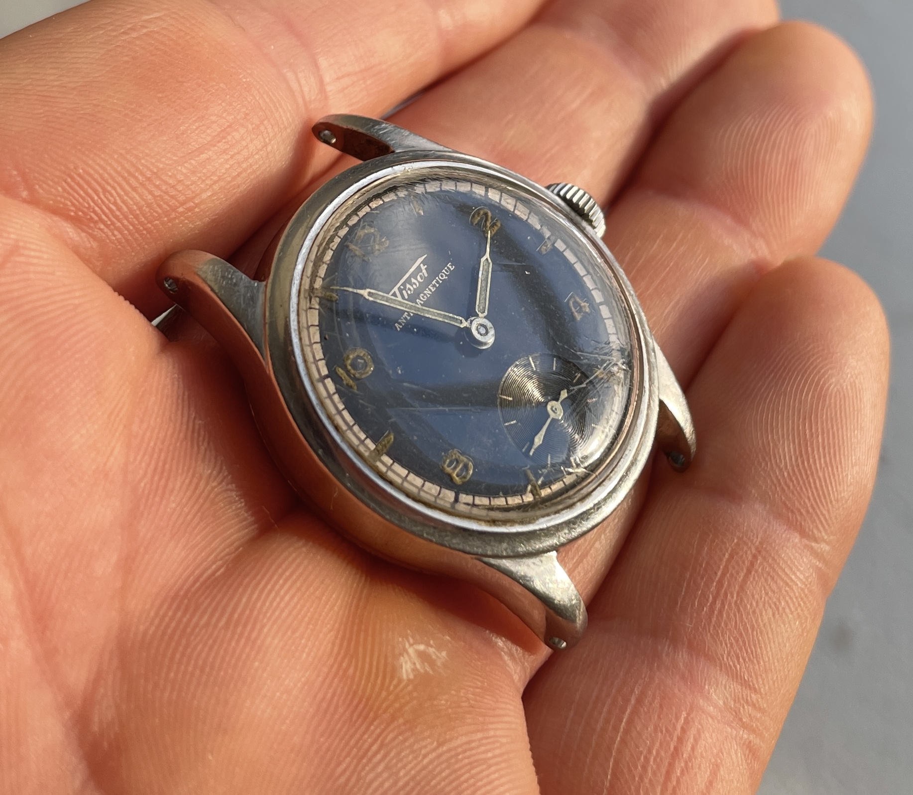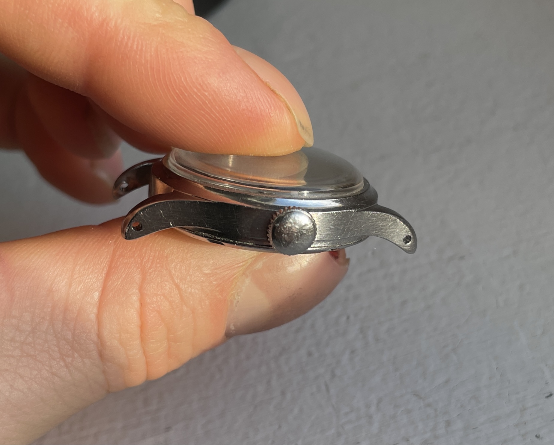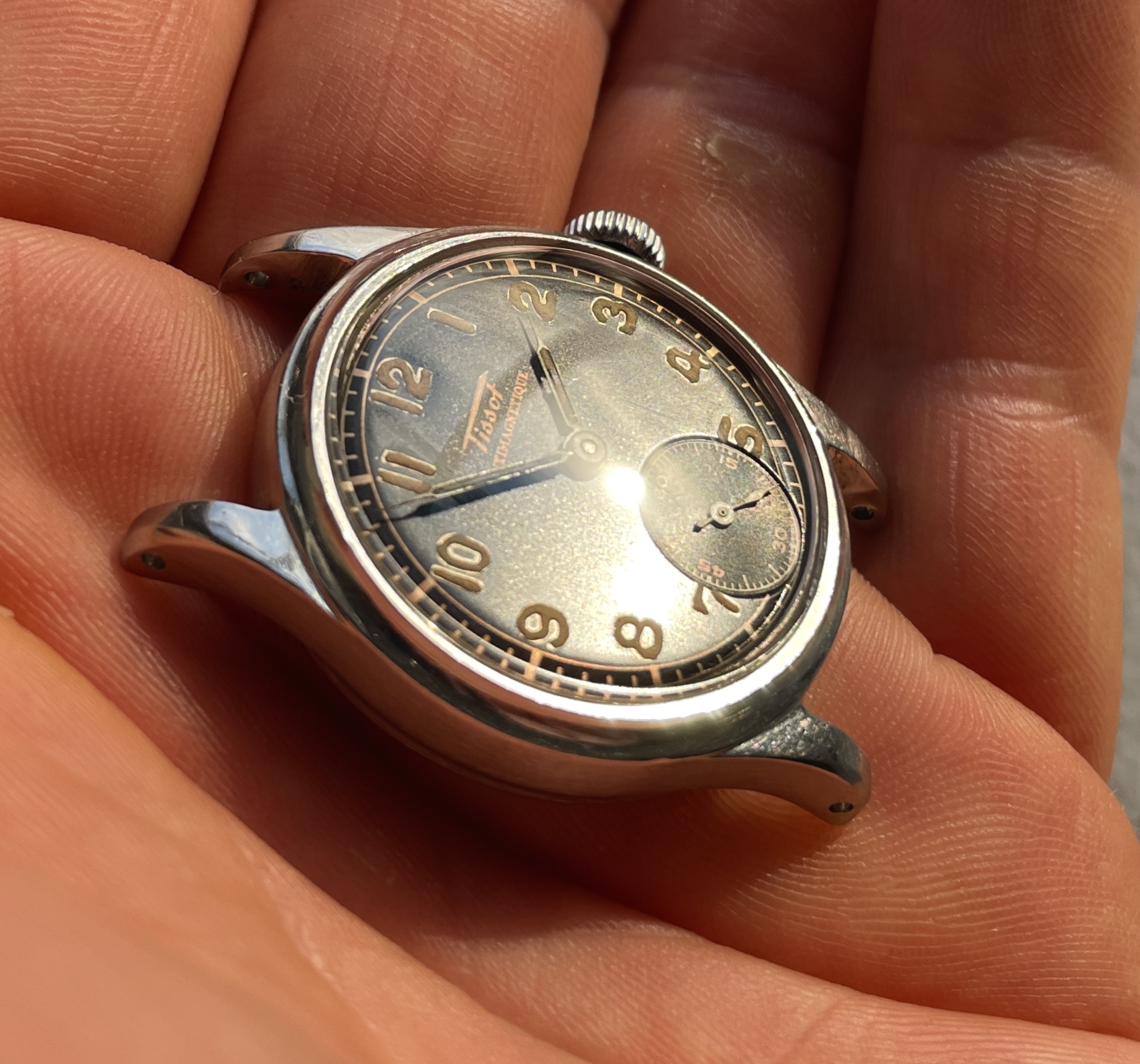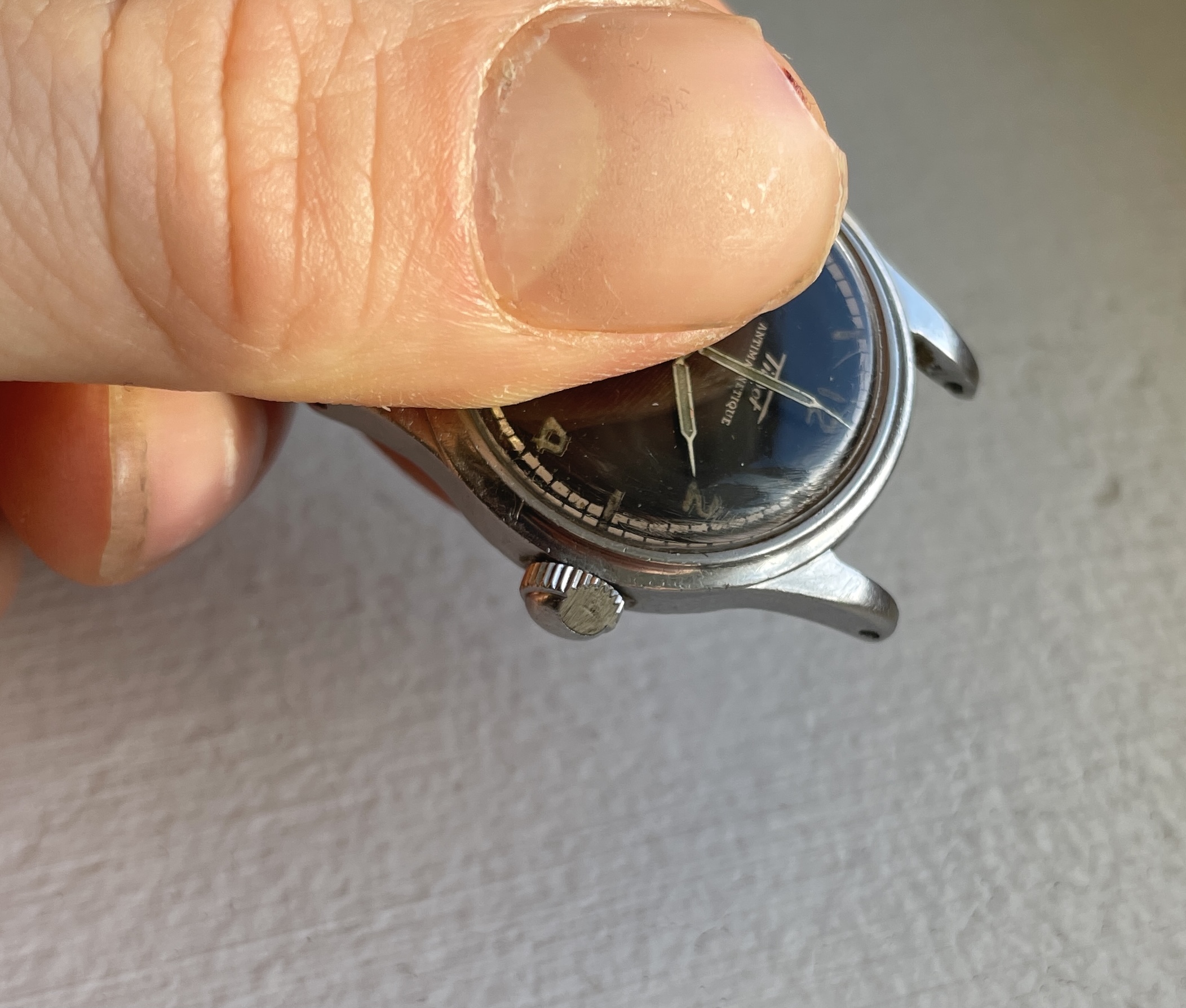 Second one has silver printed dial with more of a green-ish colour radium numerals and index and white railroad outer track. Original crown that has a very nasty scar (see picture) and case in overall worn condition, light engraving with some numbers I can't read.