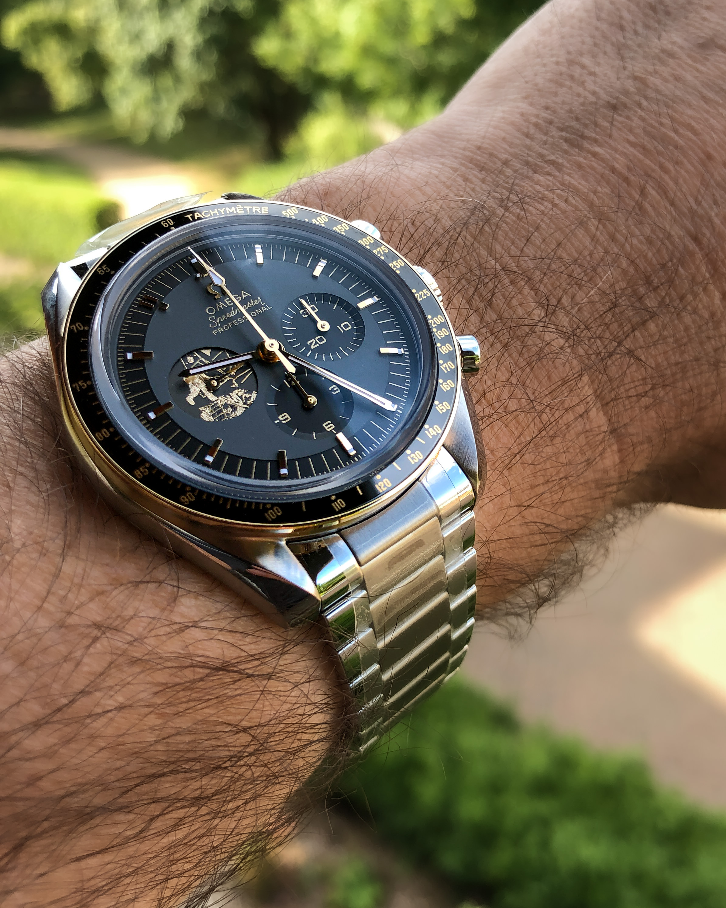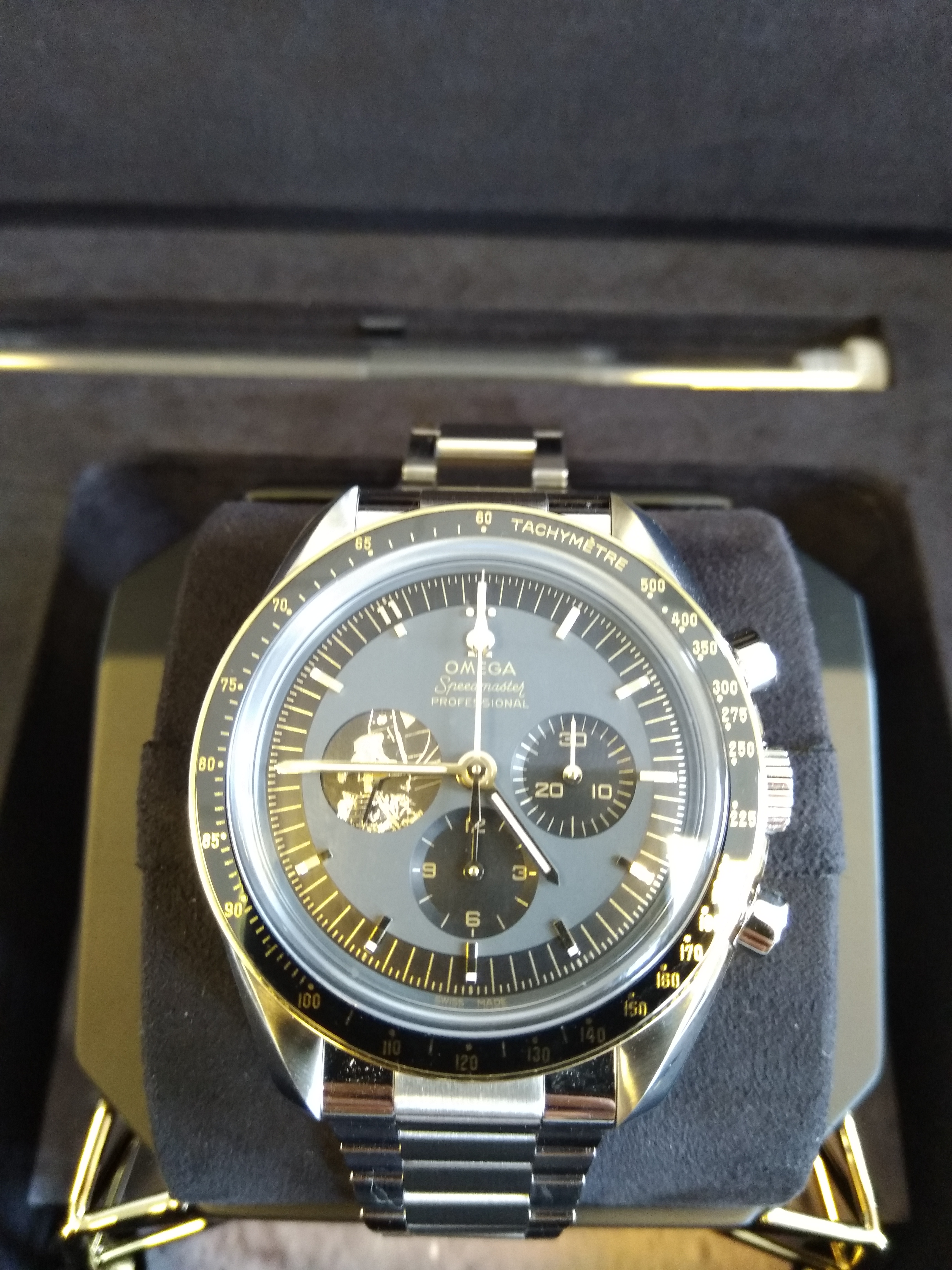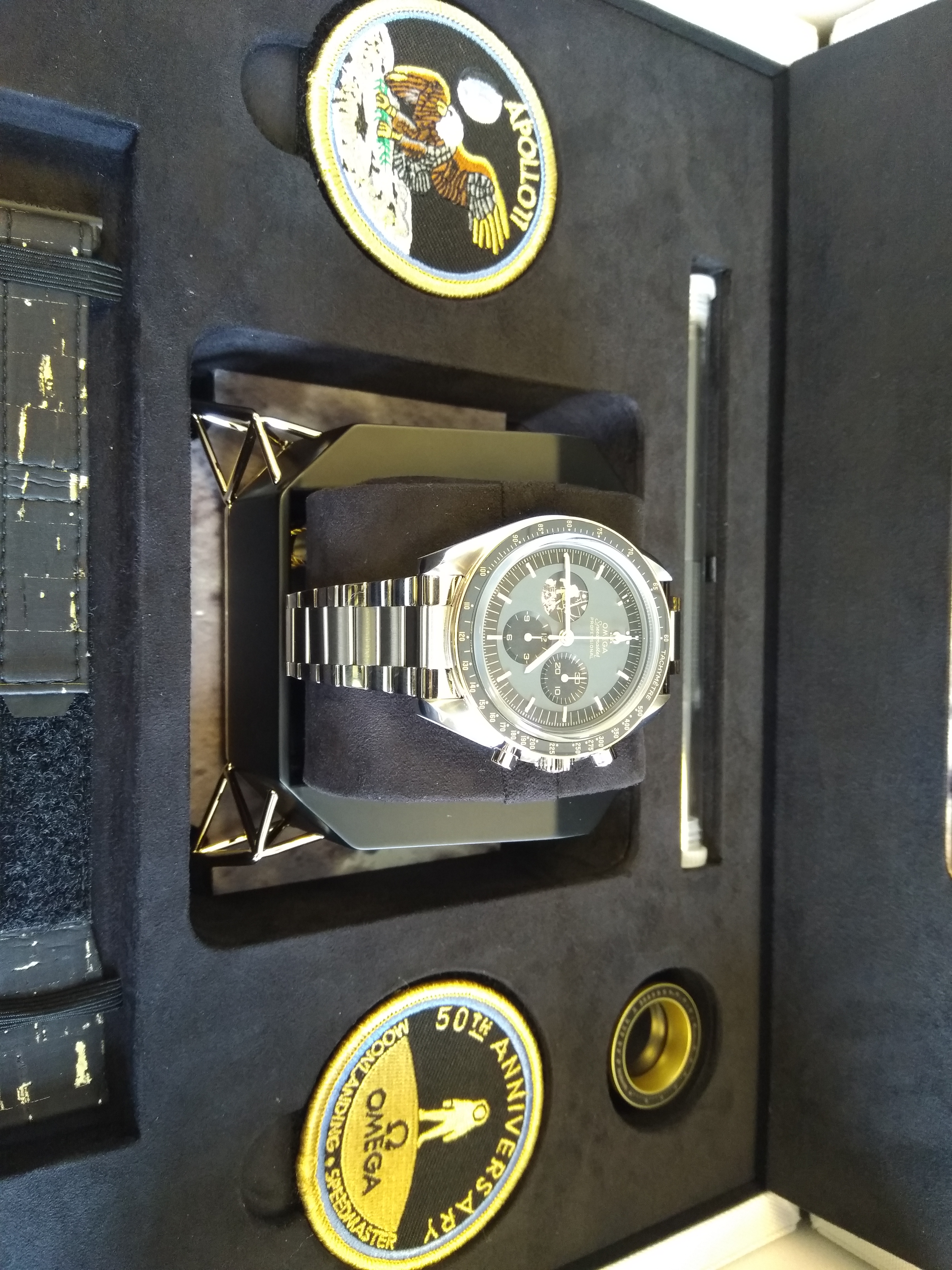 I’ve finally got the Speedmaster I’ve been longing for and although I paid €9K it’s worth € 50K to me. The call came earlier than expected but seems a few cancellations (probably people who had their names on several waiting lists) bumped me up the list at my AD. No thoughts of walking out the door with the stickers not removed, got it resized on the spot for my small wrist so I’m wearing it proudly because this watch deserves to be in the spotlight and not safely tucked away or flipped.