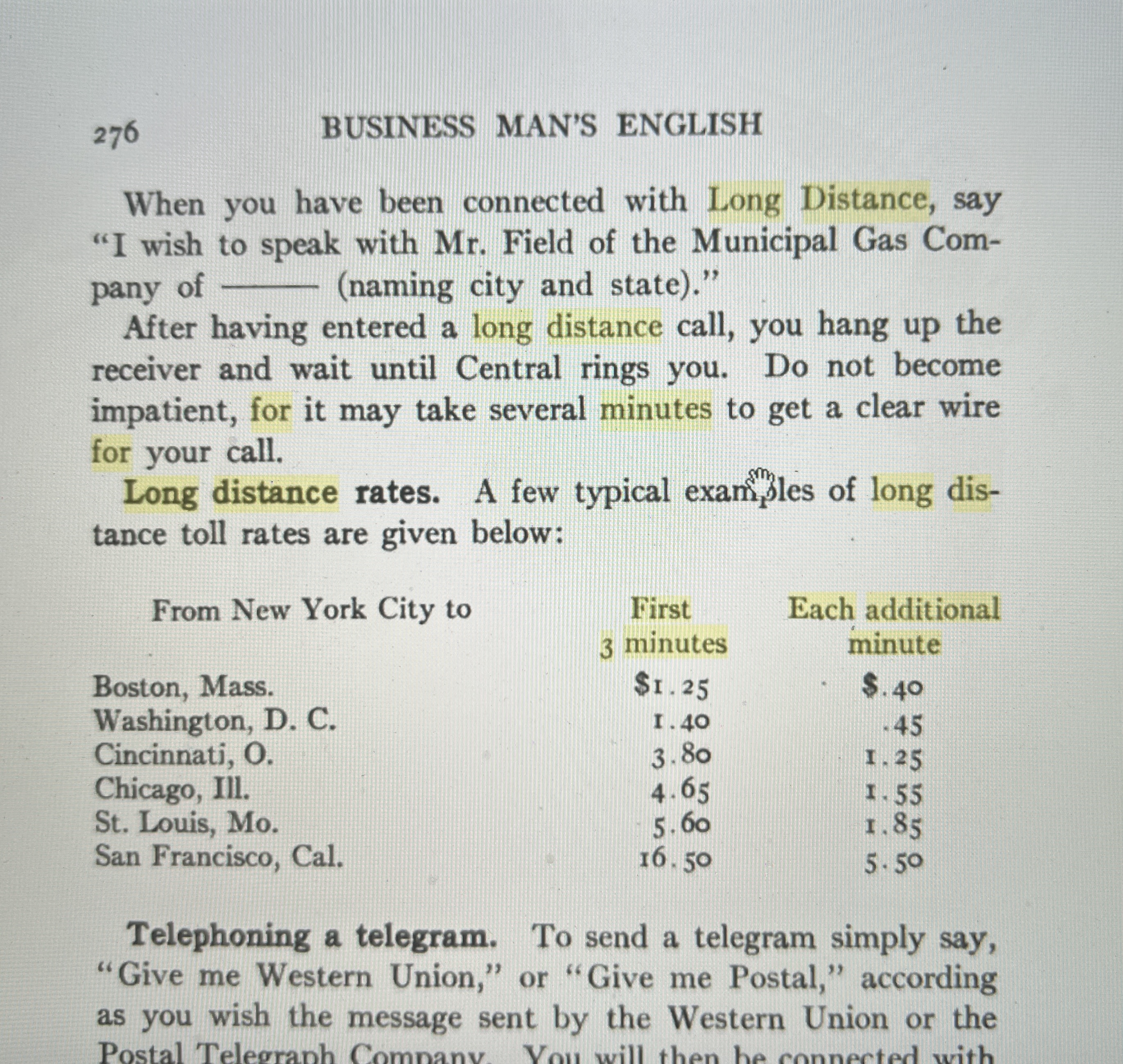 From a 1925 book titled “The Business Man’s English”, instructing how long distance calls are made, discussed (in English), and example rates: