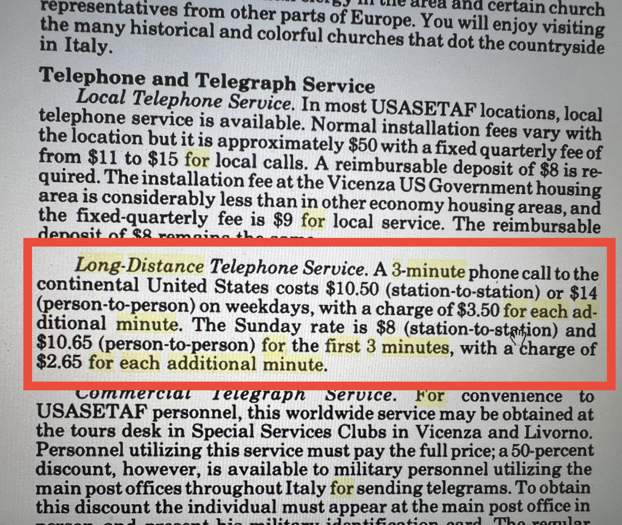 Also from 1975, a U.S. military pamphlet regarding being stationed in Italy and making calls back to the U.S.: