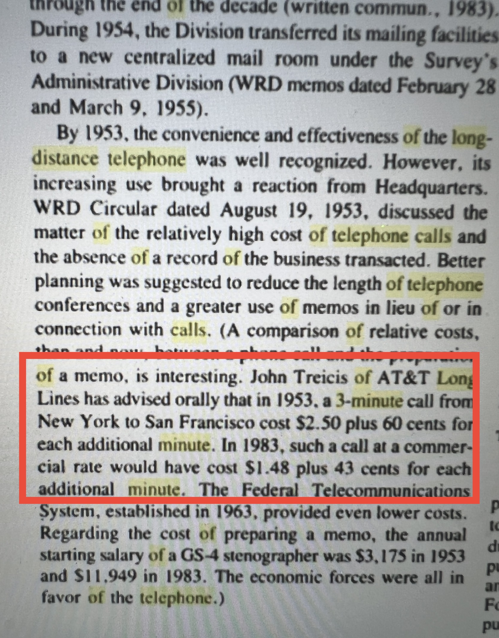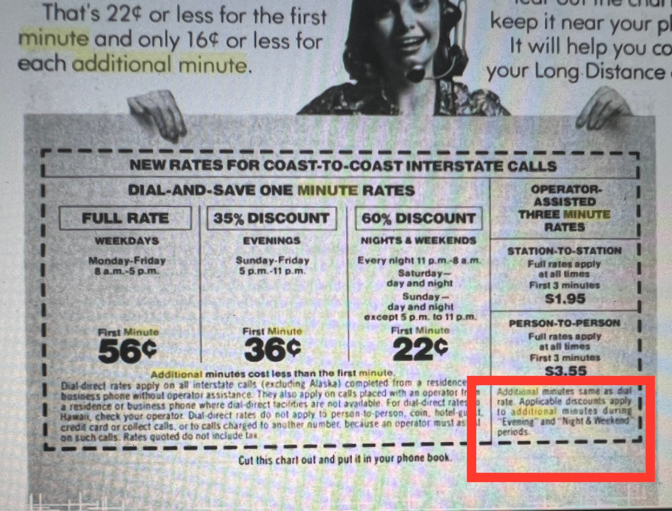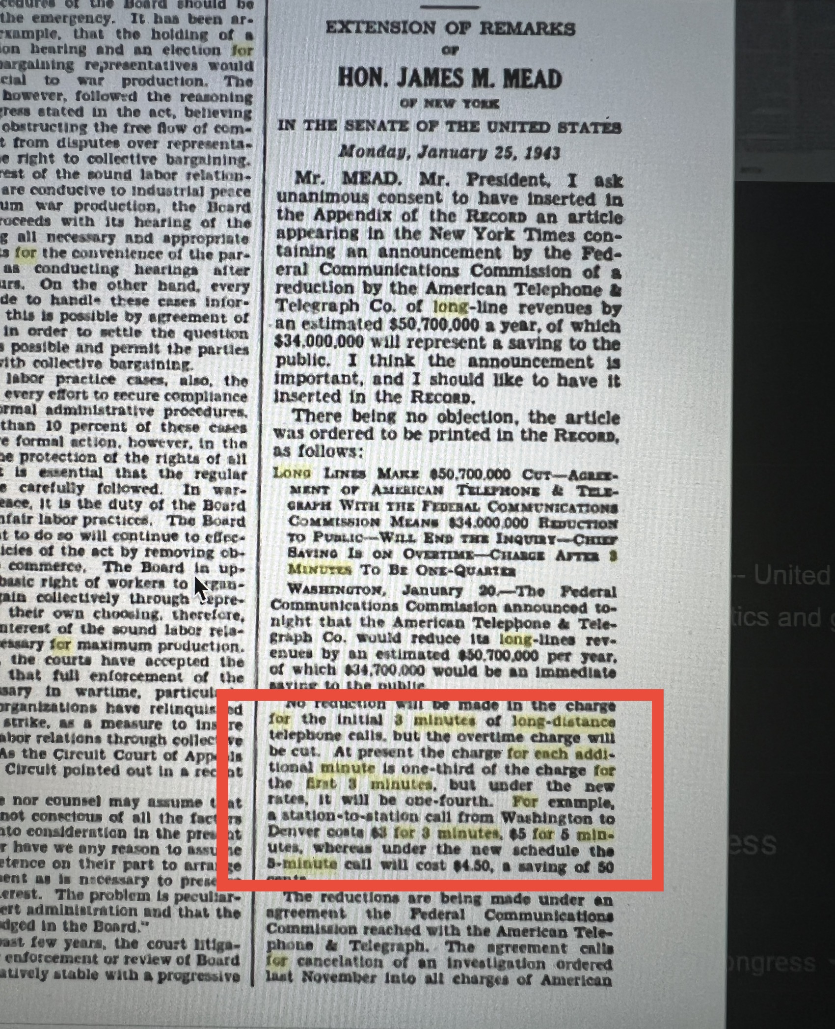 I’ll end with a 1943 Congressional record, discussing the then-U.S.-wide regulated monopoly’s announced plans to change its national long distance rate approach (due to and avoiding a Congressional investigation), keeping same the “initial 3-minutes” but reducing the “each additional minute” overtime charge in half: