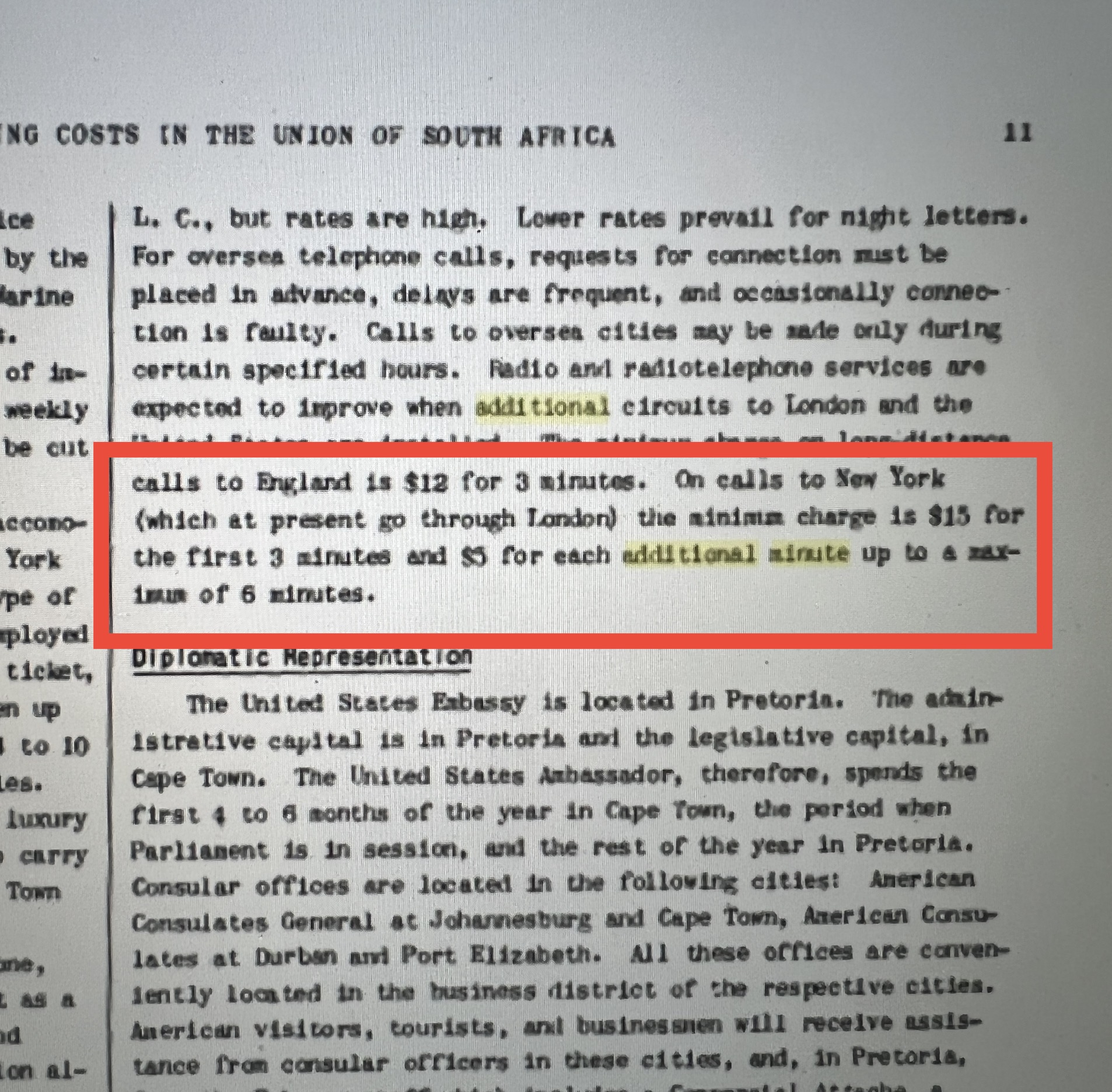 So, I mentioned only briefly in my OP that I could find no evidence of successive 3-minute rate structures at any time or anywhere, but instead only evidence that almost unifirmally long distance rates throughout the 20th century were structured instead on an initial 3-minute minimum followed by per minute increments.