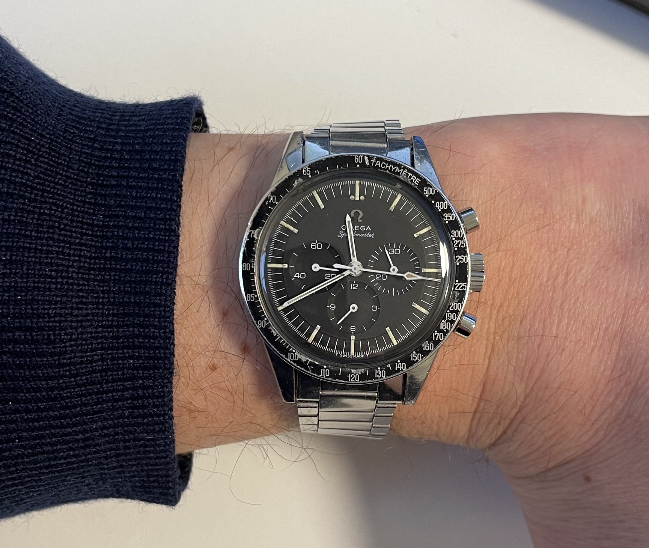 ·Hello everyone, I understand the 321 Ed White speedy has a smaller case size, per the official specs, but is that only because of the elimination of the crown guards on the case? In other words, is the dial and bezel size the same as the "regular" Speedy Pros (i.e. 1861 or 3861s)?