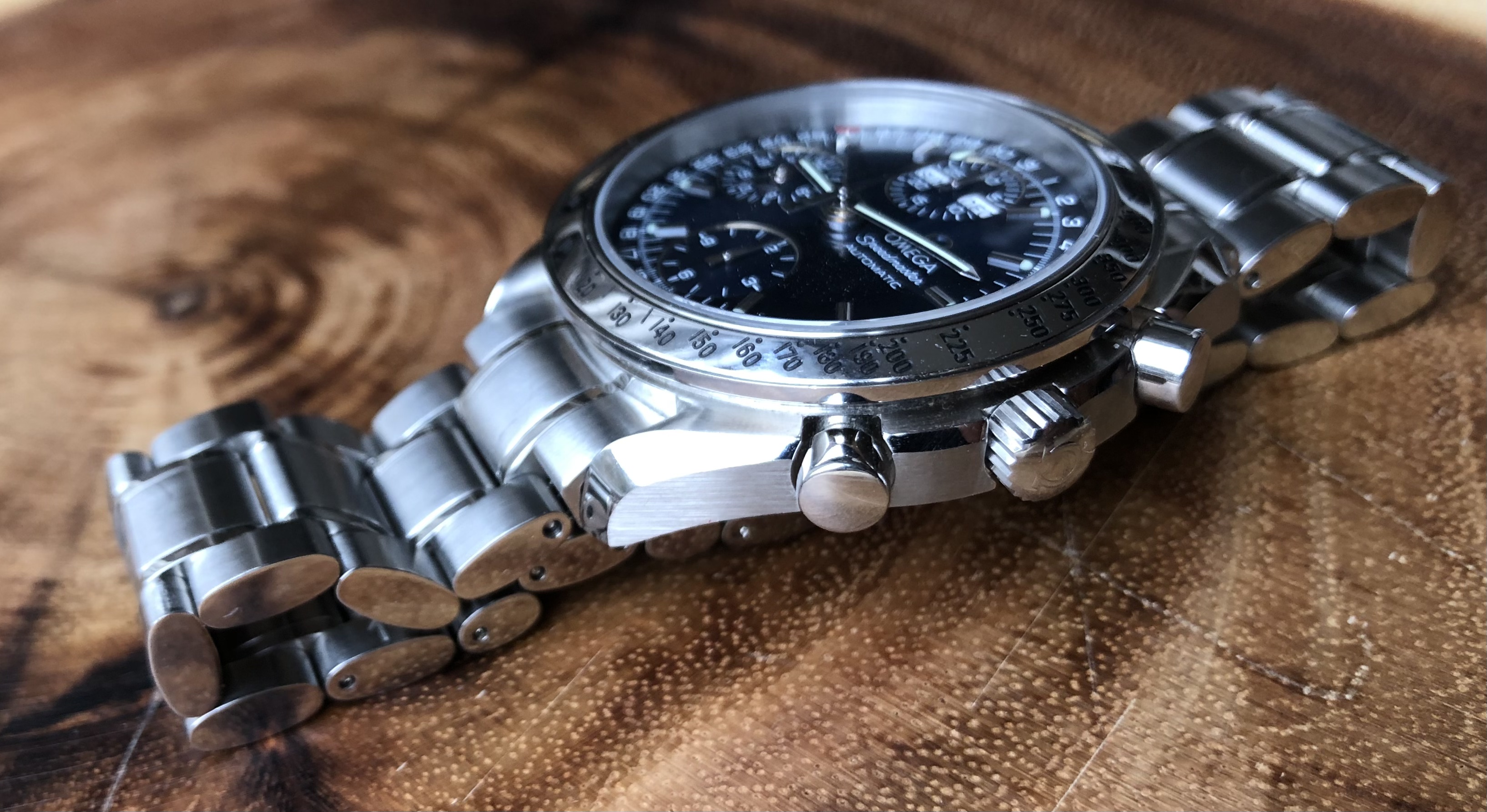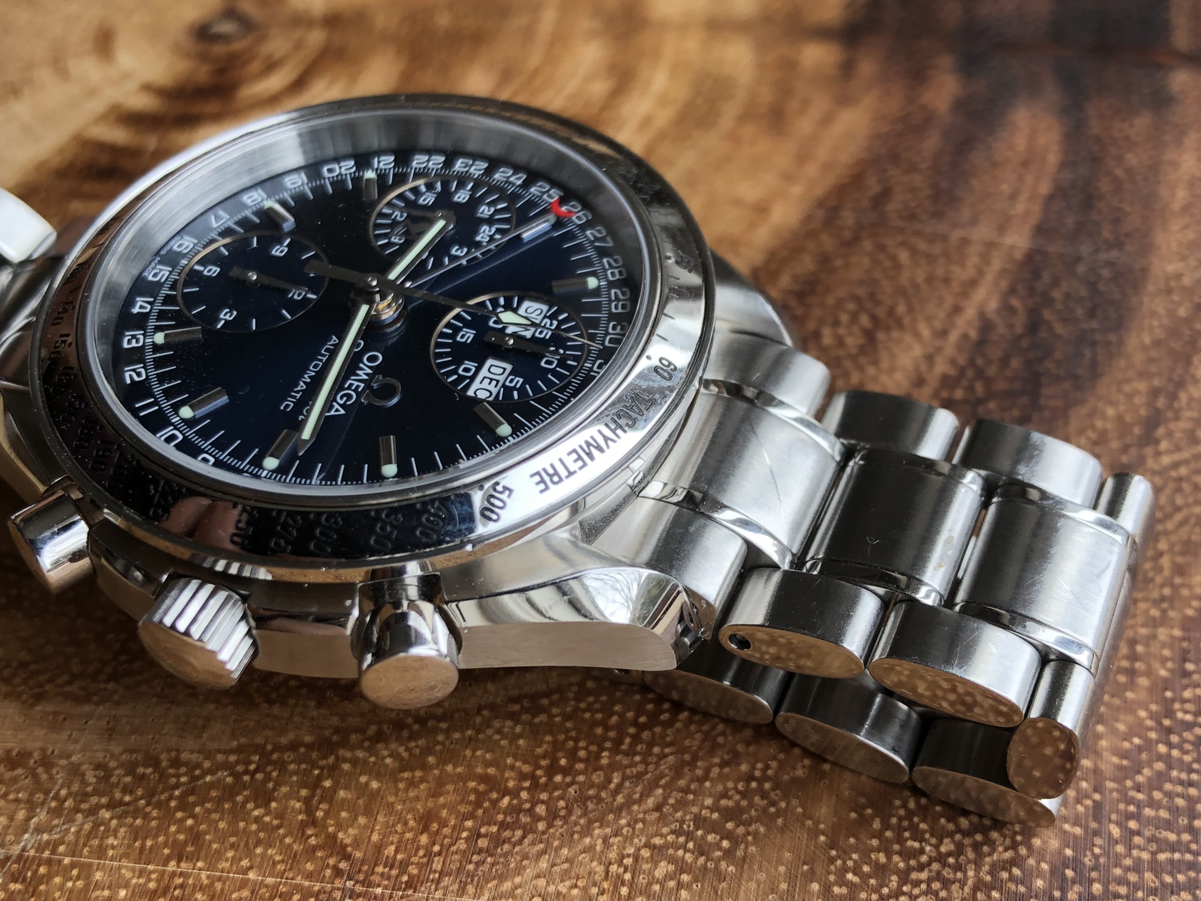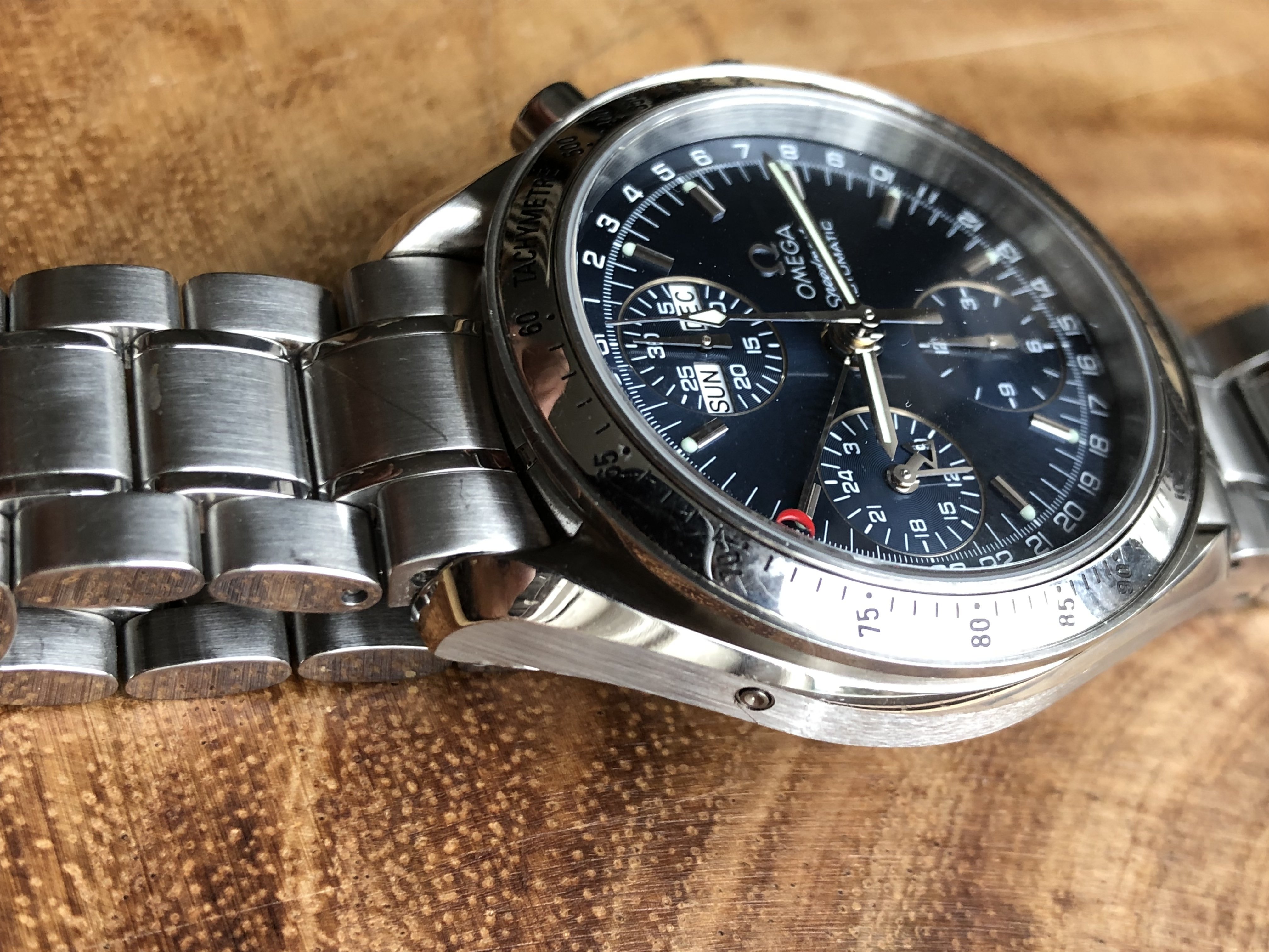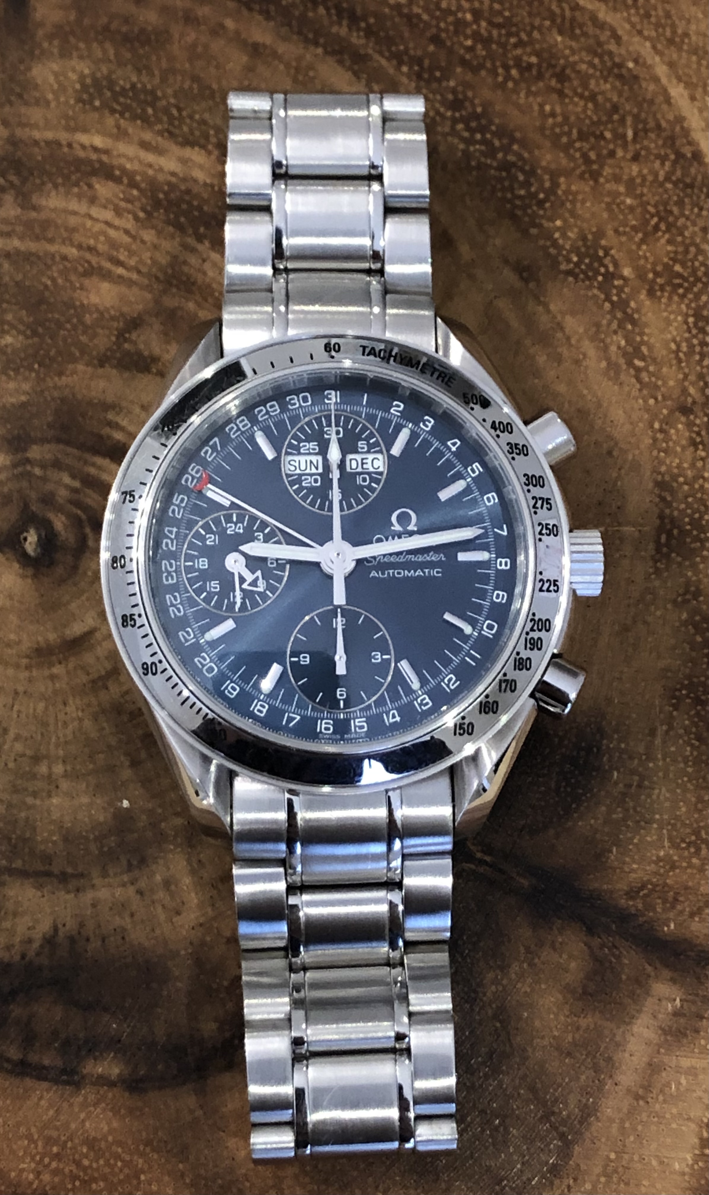 ·Up for sale is my blue dialed Omega Speedmaster Automatic Triple Date. This watch packs a ton of features into its 39mm case - Chronograph, Day, Date, and Month. Photos do not do the blue dial justice - it really is fantastic. The sunburst finish on the dial plays with light to create a lot of variation in the shade of blue depending on how light hits it.
