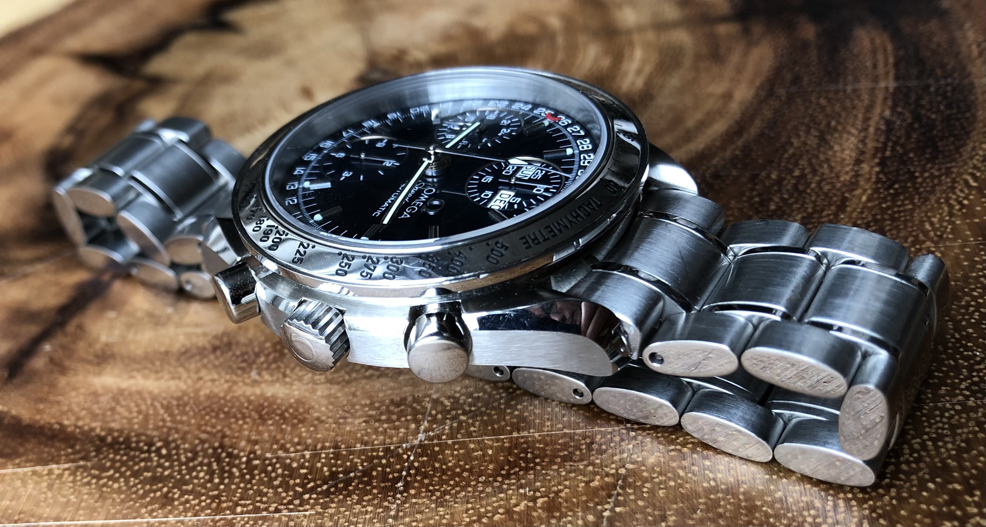 The condition of the watch is great for its age - 20 years old. There are a few marks on the case but it really is in great condition (please refer to the photos). I was very careful to purchase a watch that was unpolished. I can say with confidence that this watch is unpolished since after purchasing the watch I acquired a brand new OEM omega case assembly for the watch (and is included in the sale). The extra case assembly includes crystal, caseback, pushers, and bezel and crown. Stickers on the crystal and caseback are still intact. Comparing the brand new OEM Omega case to the current one it's clear that the watch is unpolished. Also included in the sale is a full OEM handset containing all 8 hands used on the watch. The bracelet is original, has virtually no stretch and includes 16 links.