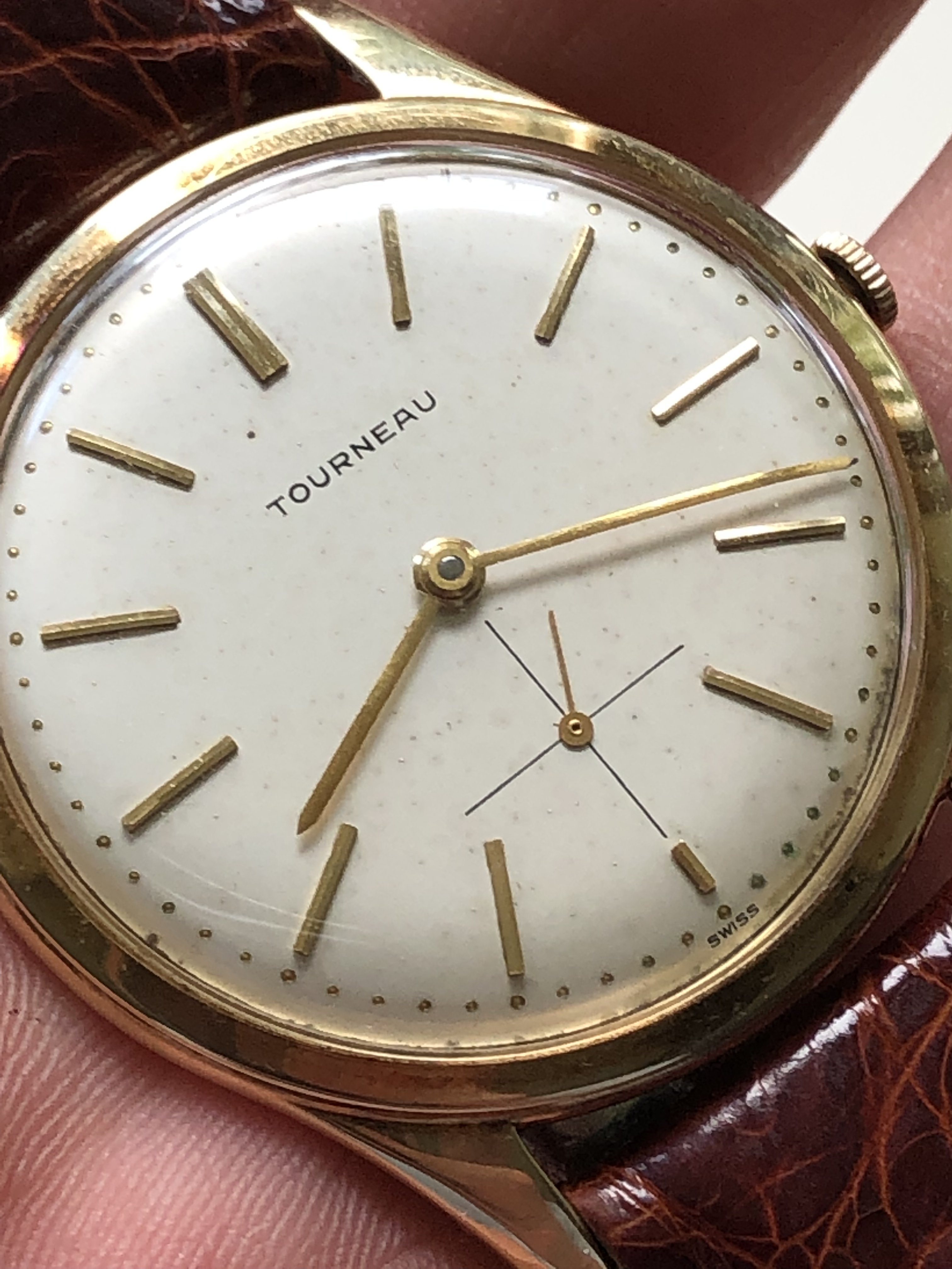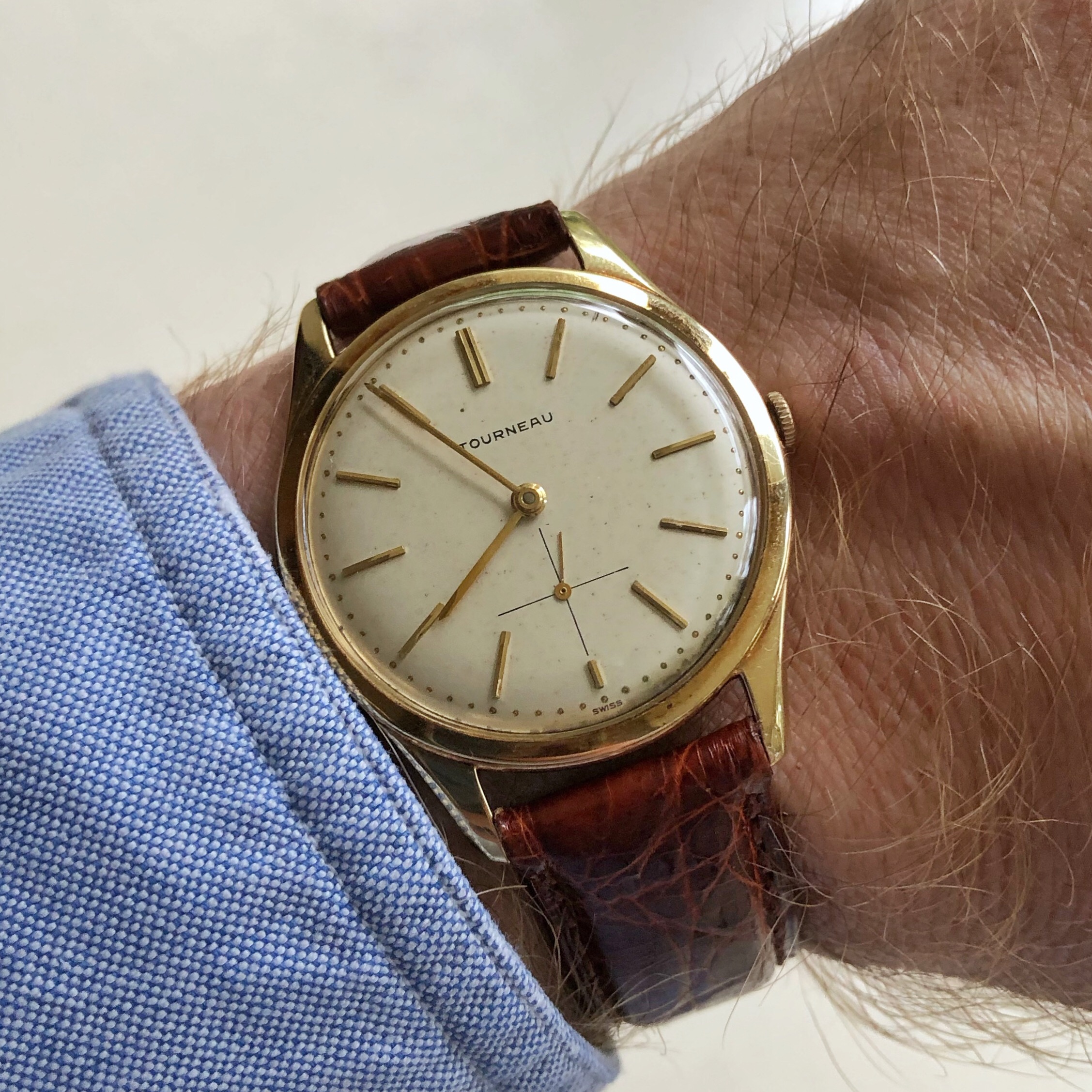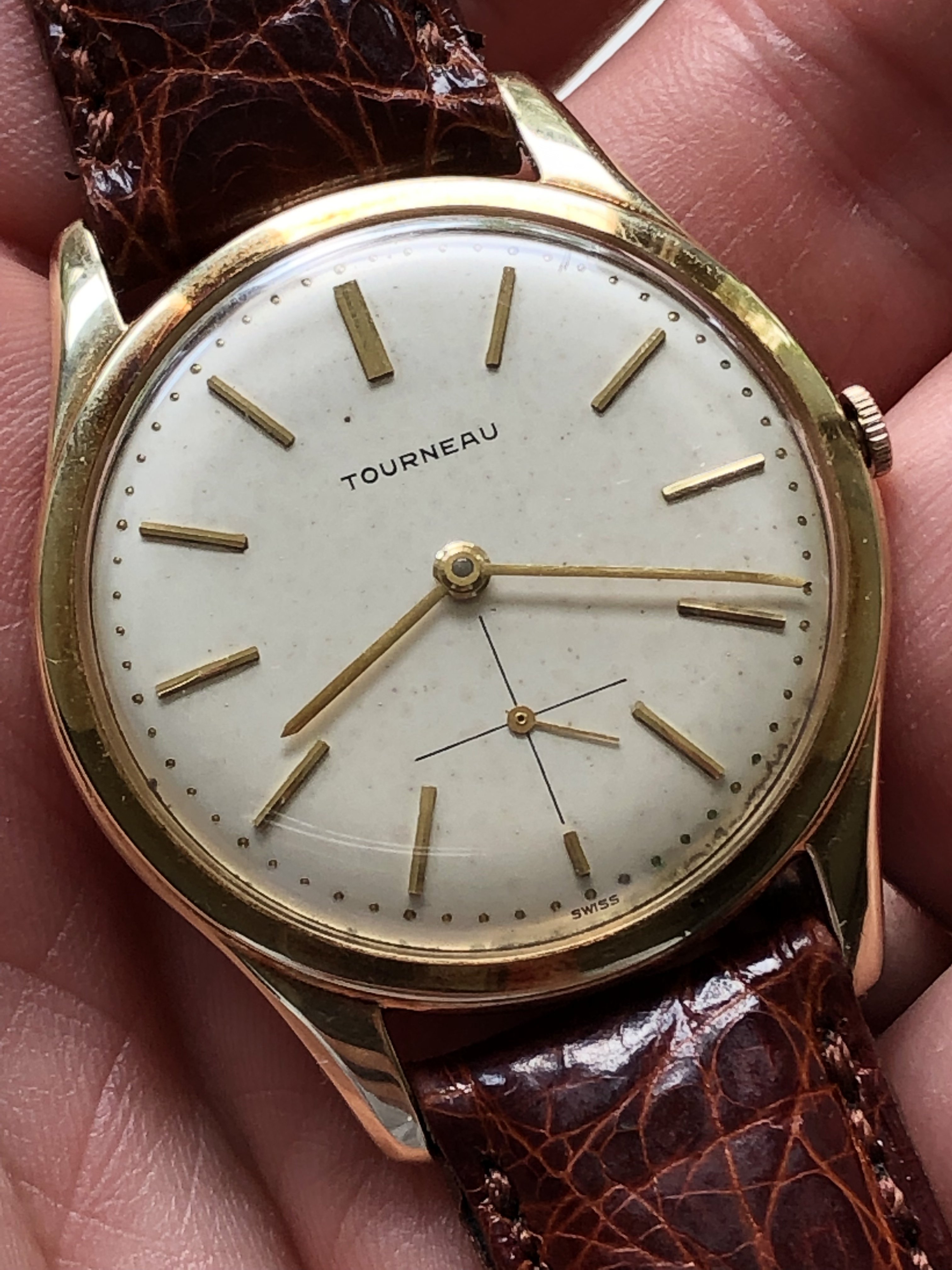 Case: 36mm solid 14kt gold snap back case with hallmarks on lugs. It doesn't appear to have been overly polished and there is some nice patina developing. Caseback is marked Tourneau and has nice perlage. 18mm lugs.