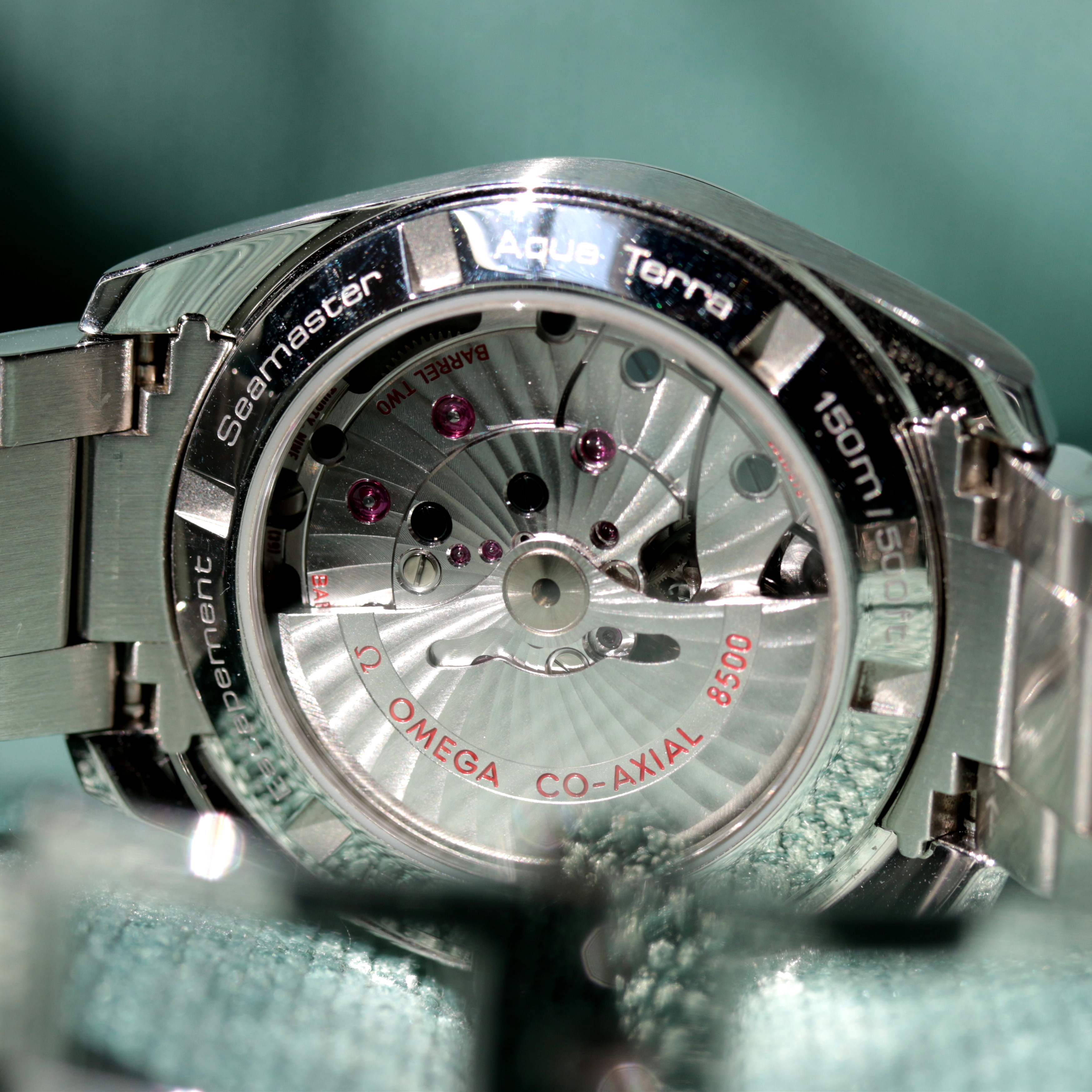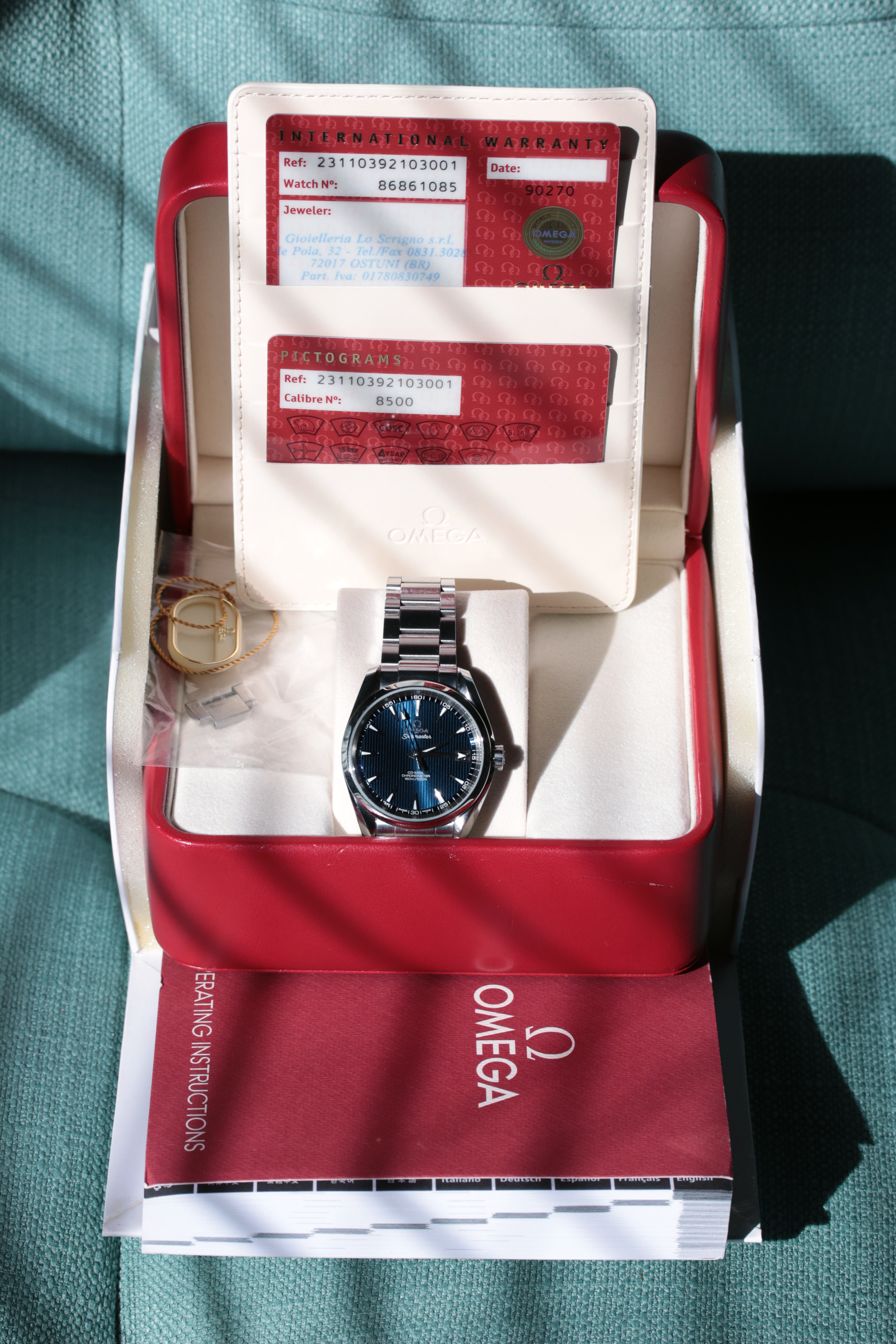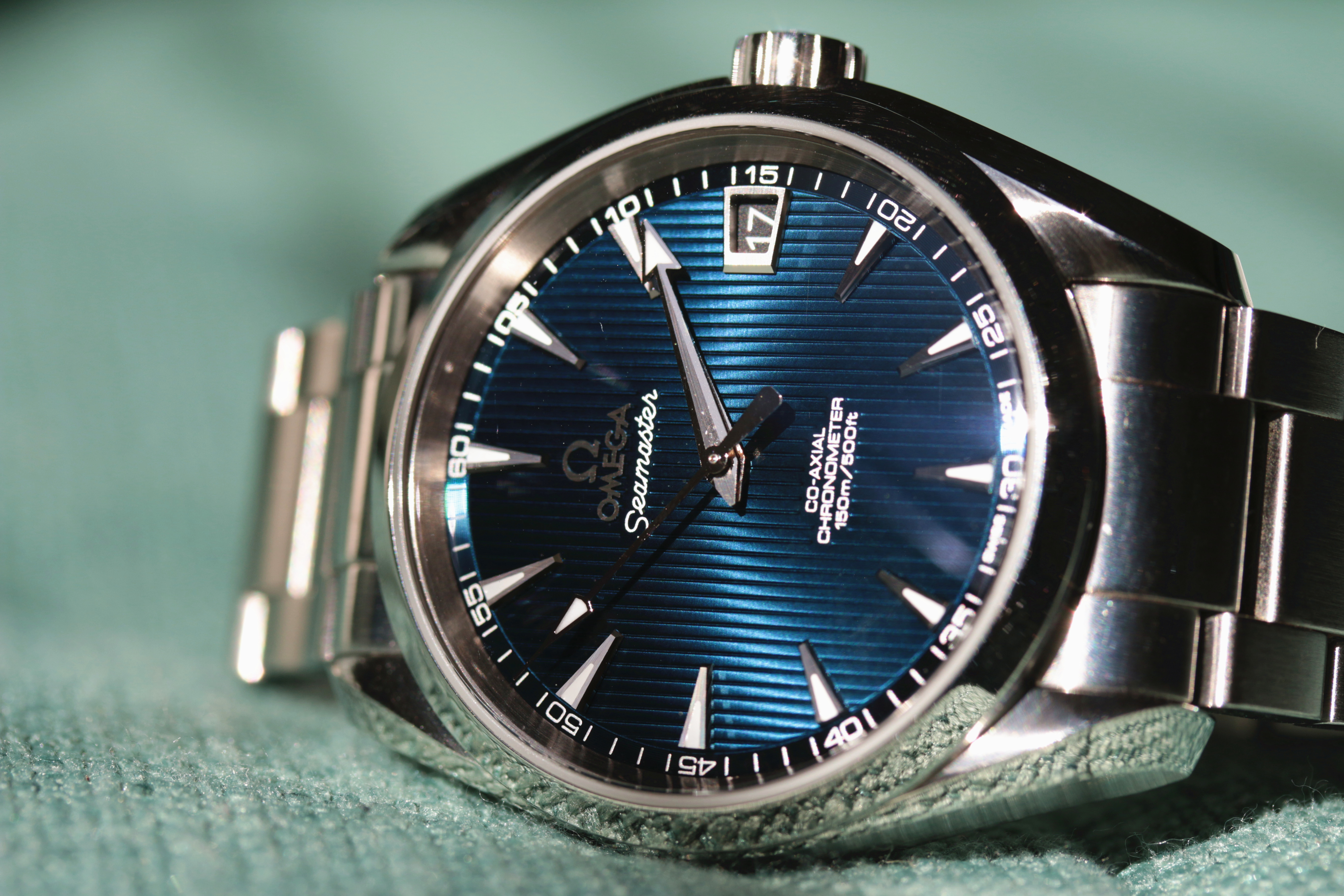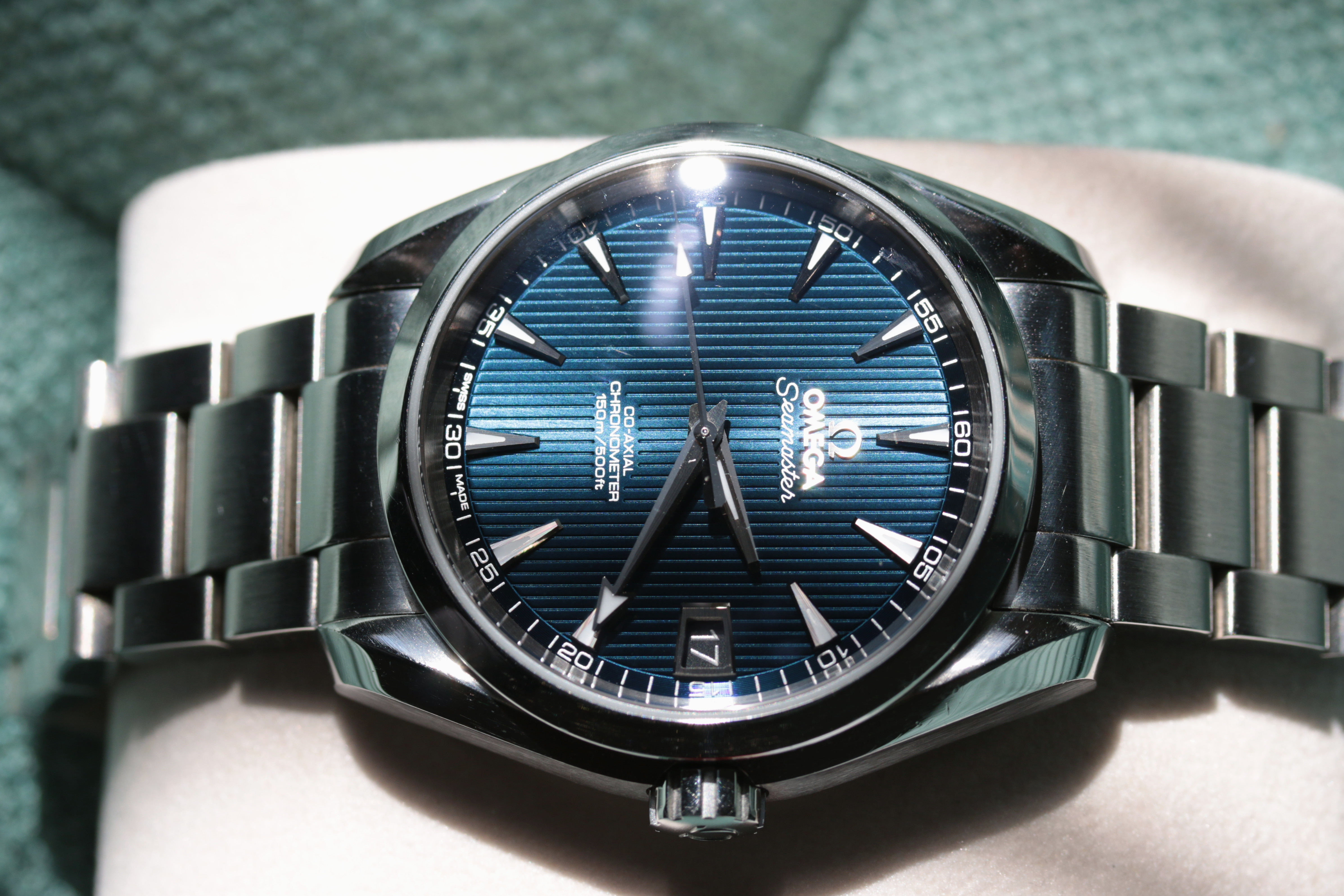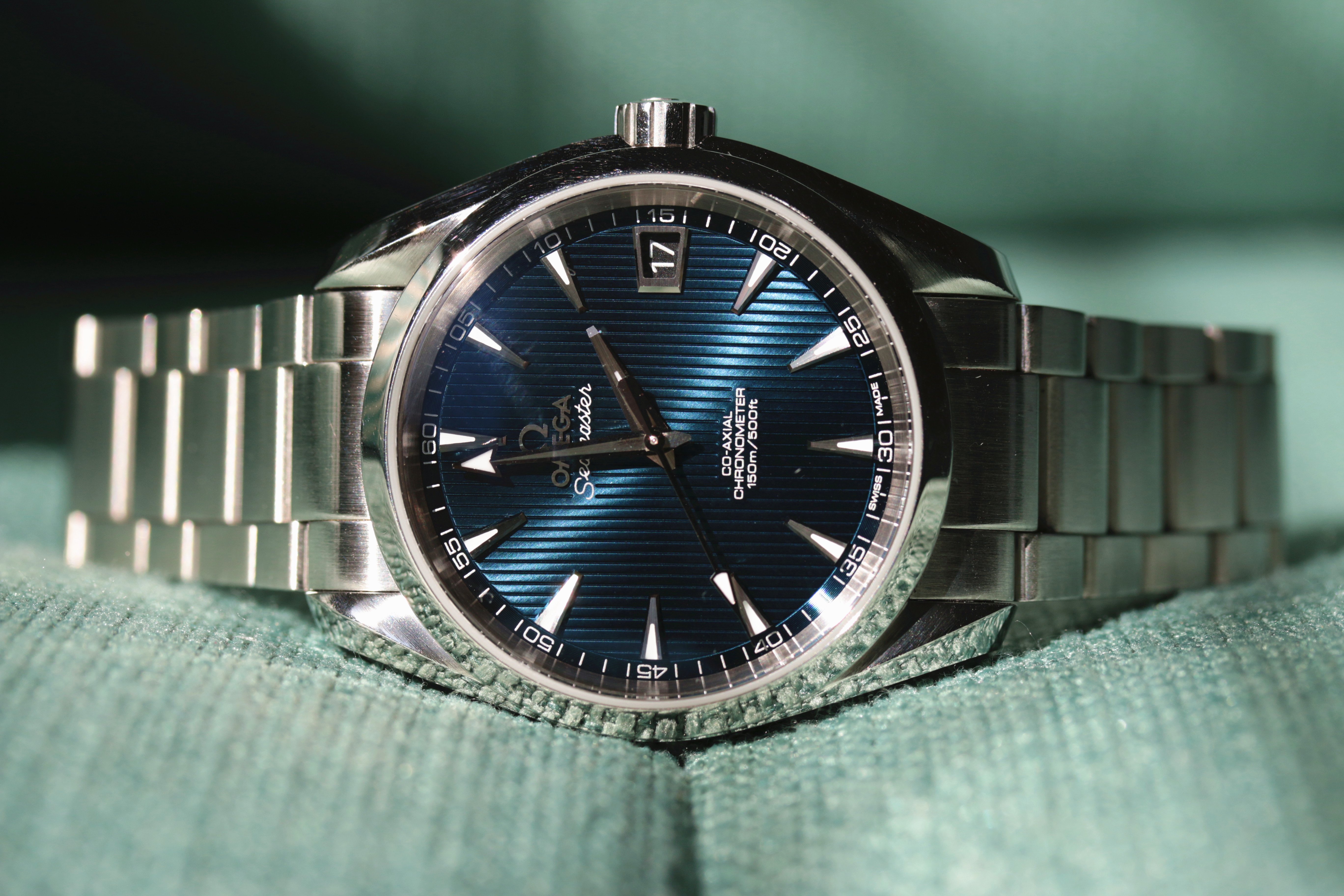 ·For sale here is a 38.5mm Omega Aqua Terra "Skyfall" Ref 231.10.39.21.03.001 with box and papers. This is the discontinued first generation with the framed date window and brushed center link on the bracelet (Omega Website). Daniel Craig wore this watch in the James Bond movie "Skyfall". The next generation came with an upgraded Cal. 8500 with master co-axial certificate but the date window is not framed and the bracelet has a polished center link (Omega Website). I personally prefer the Gen 1 aesthetics. Both were then replaced with the AT in production today with horizontal dial stripe pattern. A full history can be found in the article here.