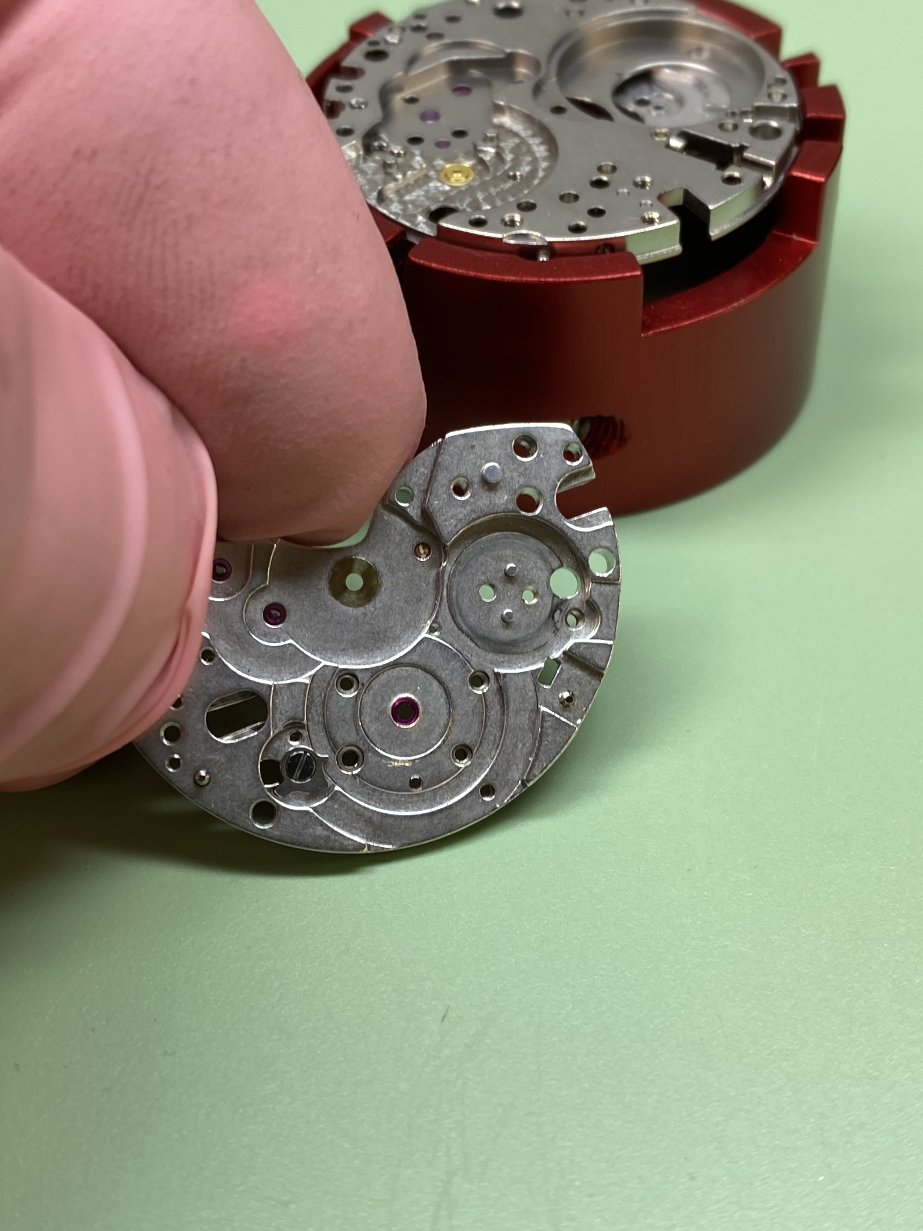 So first a correction - the bushing I've shown is not in the main plate - in fact the barrel doesn't ride in the main plate at all. The only hole in the main plate that is really subject to routine wear is the center hole, where Omega installed a bushing in the 3861.