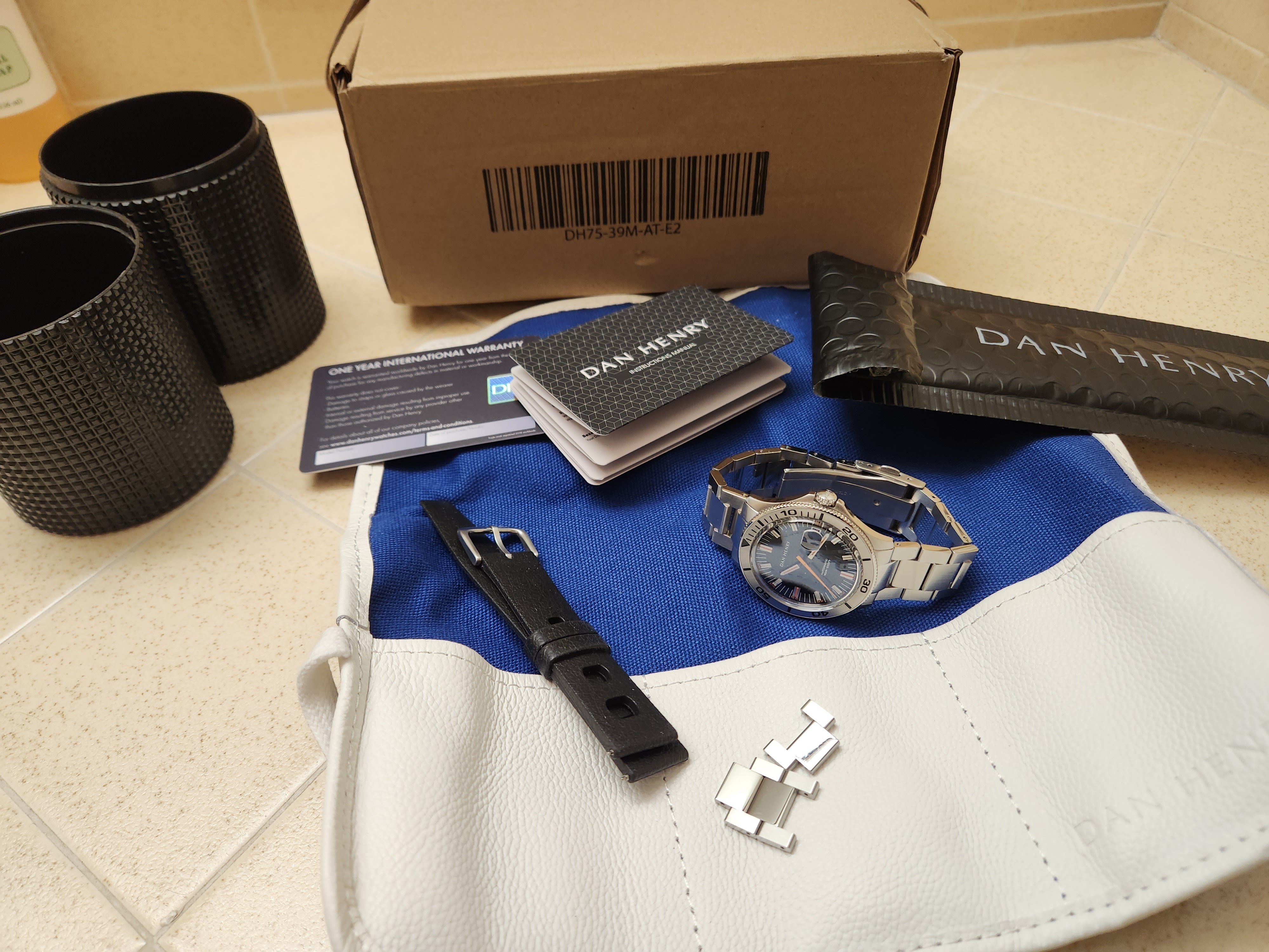 Everything included: 3 extra bracelet links, the 3-pocket watch pouch, the Dan Henry capsule, the outer box, the blank warranty card, instruction booklet and FREE SHIPPING in the USA.