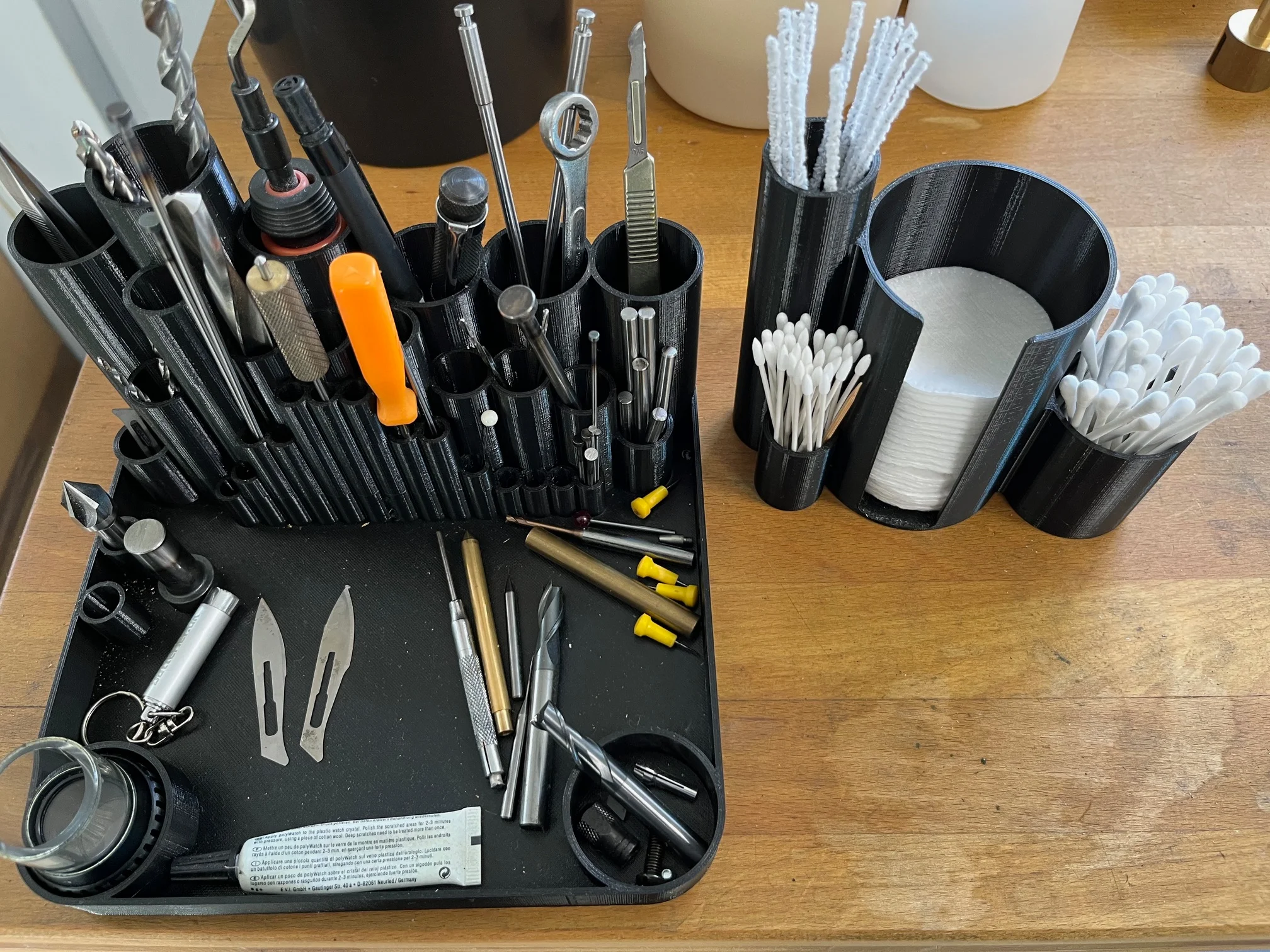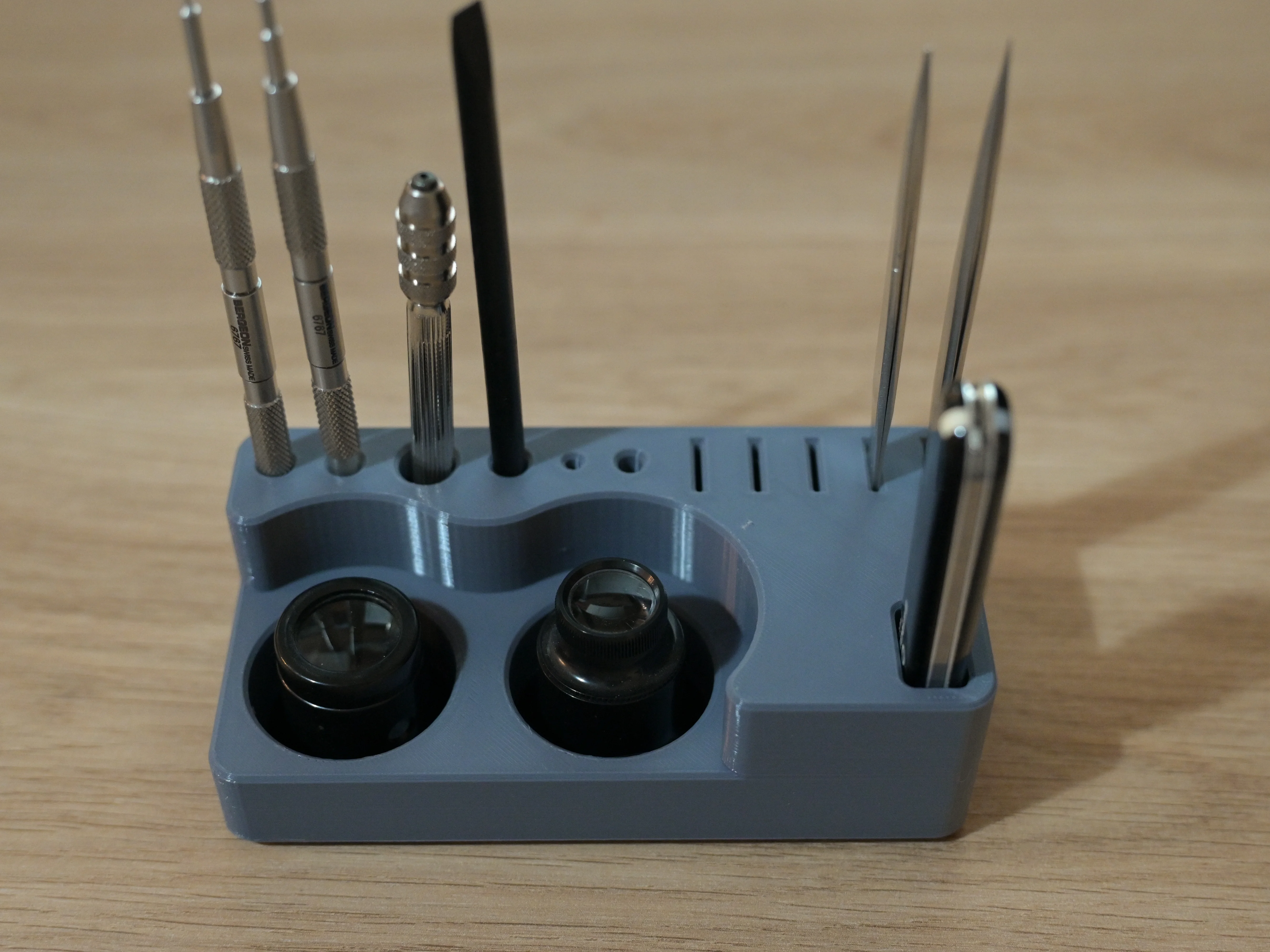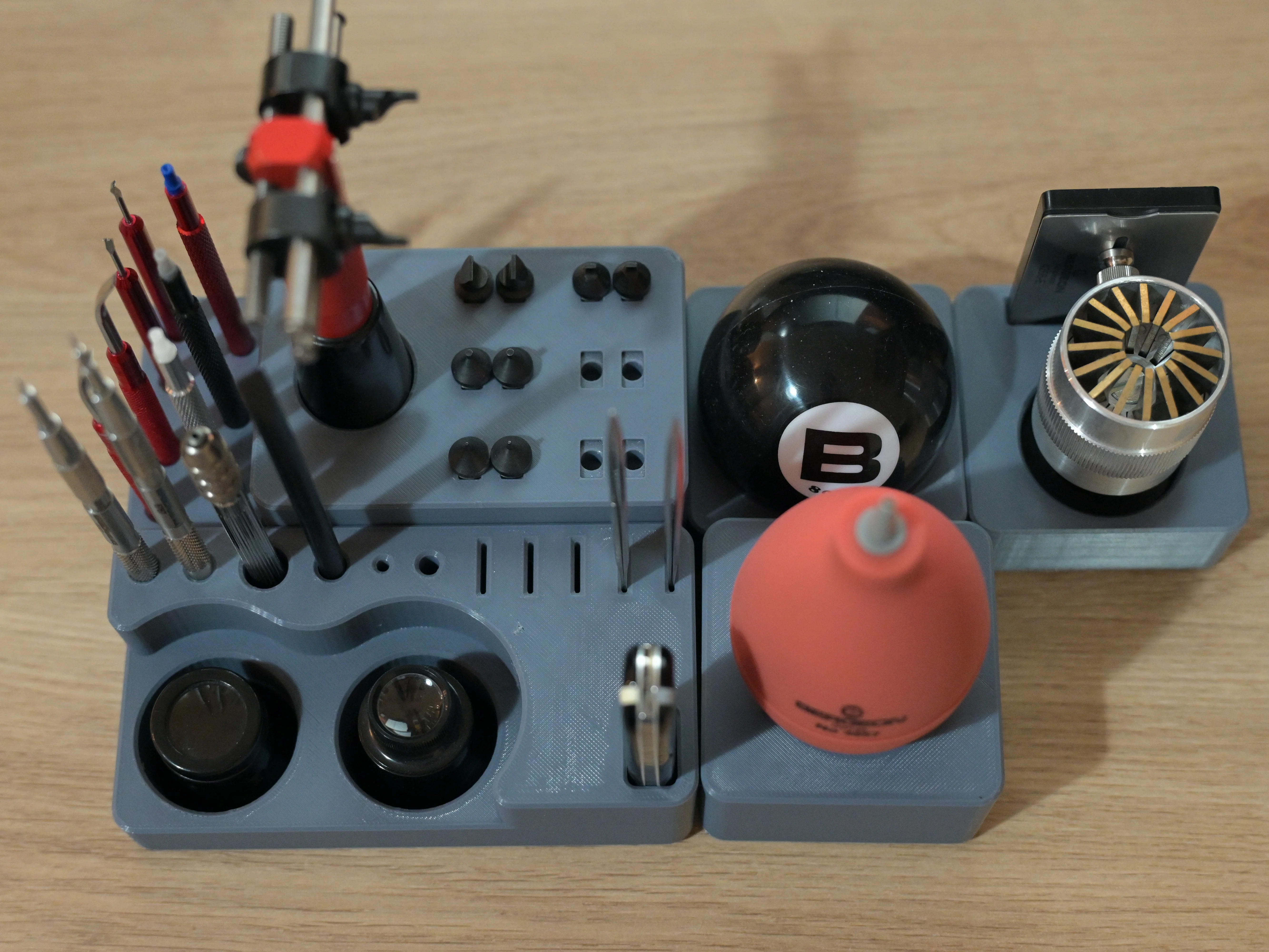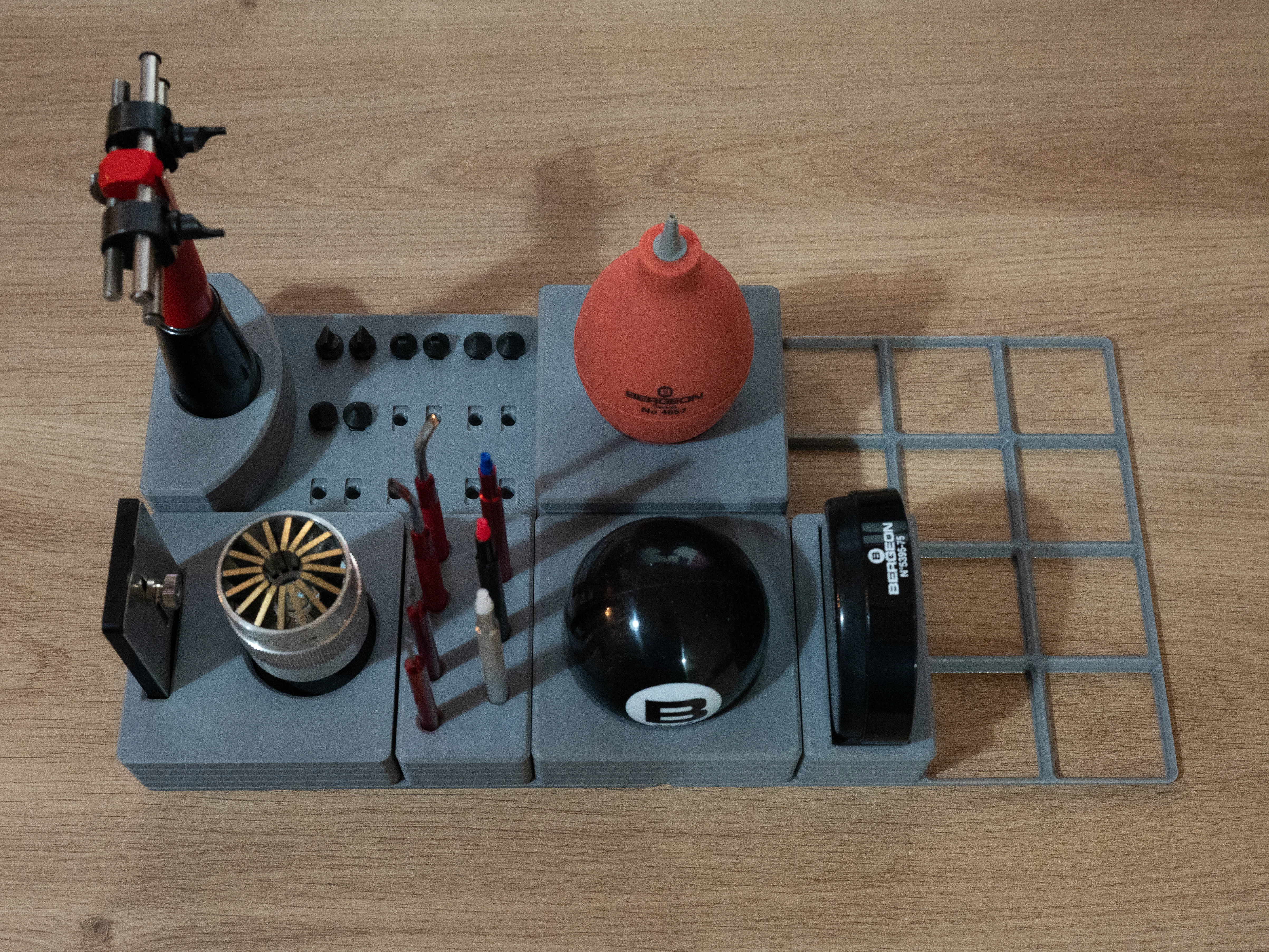 路Hi all. I've been slowly building my watch tool collection over the past year or so, and it was time to get them out of that mess of a drawer and into some custom organizers. Went for a 35x35mm grid, so each dimension is a multiplier and they can fit tightly against each other. I may explore in the future stuff like gridfinity, depending on how it grows and evolves. For now I'm mostly exploring a good way to have the panels interlock on any side (without magnets!), so that I have the flexibility of a panel for each tool, but also group them into bigger sets.