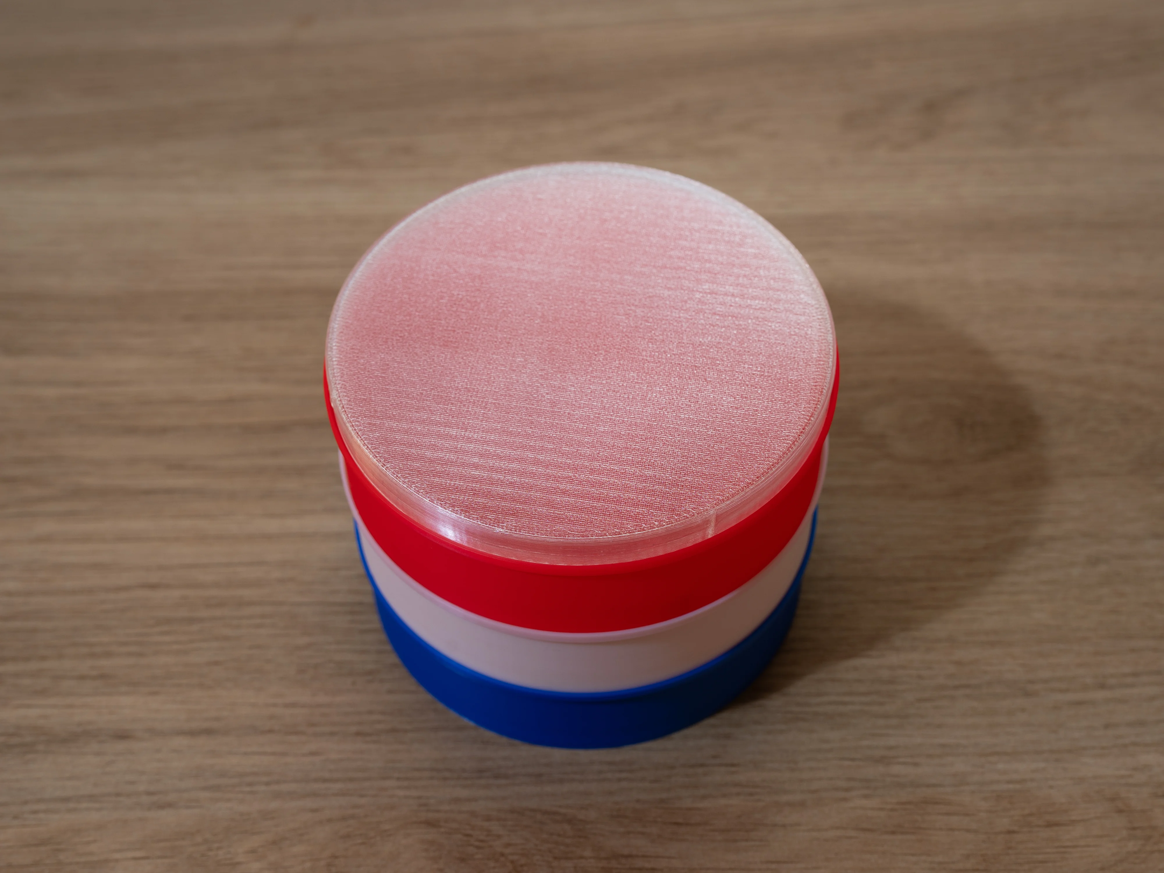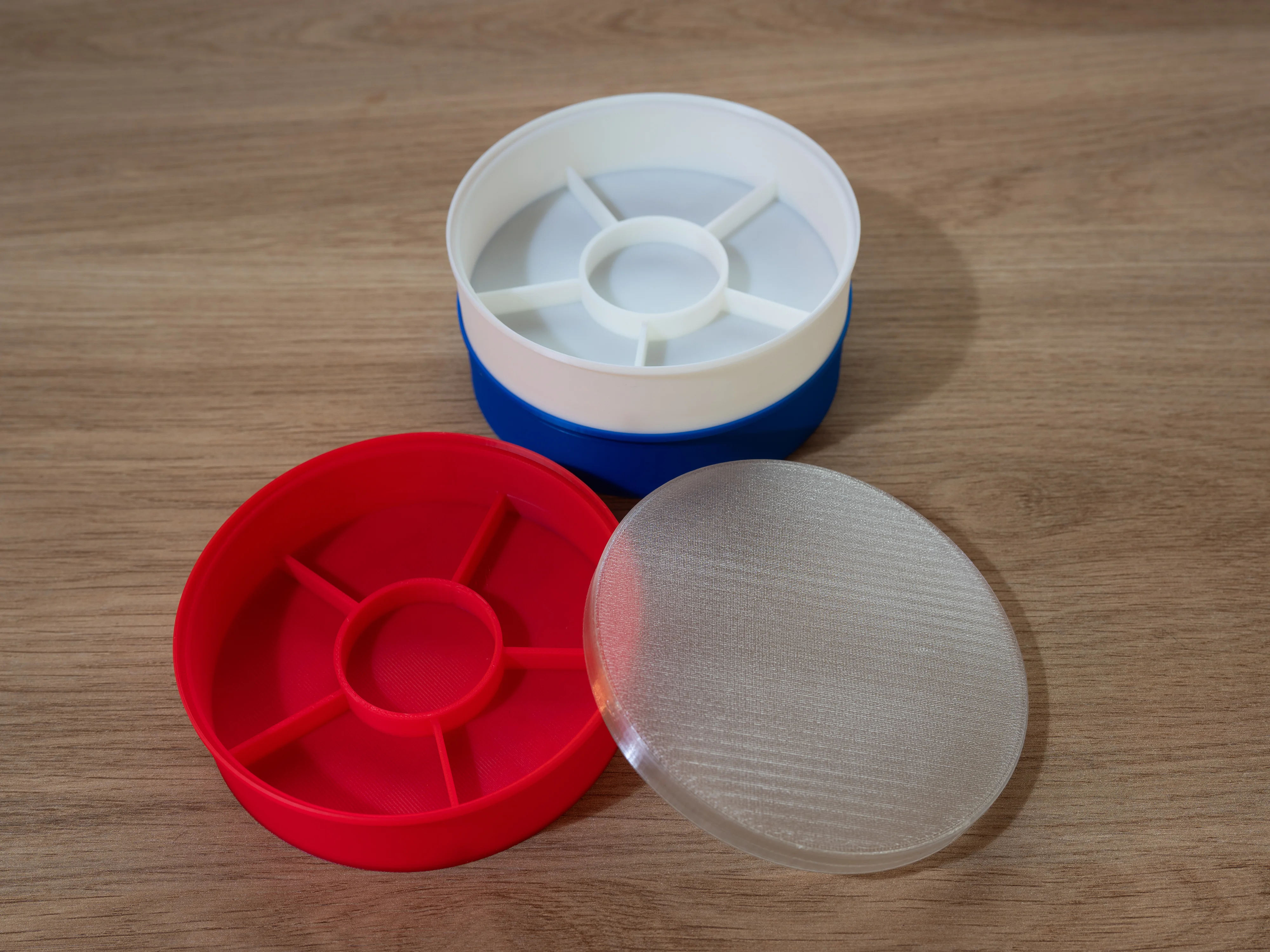 I've been designing for the past few days a stackable dust tray for watch parts. Very easy to print, no supports, about 37 grams of filament, and stacking is decently secure. Comes with a lid that if you have transparent filament laying around, will look even nicer. Thanks to @JimInOz for the help in designing these.