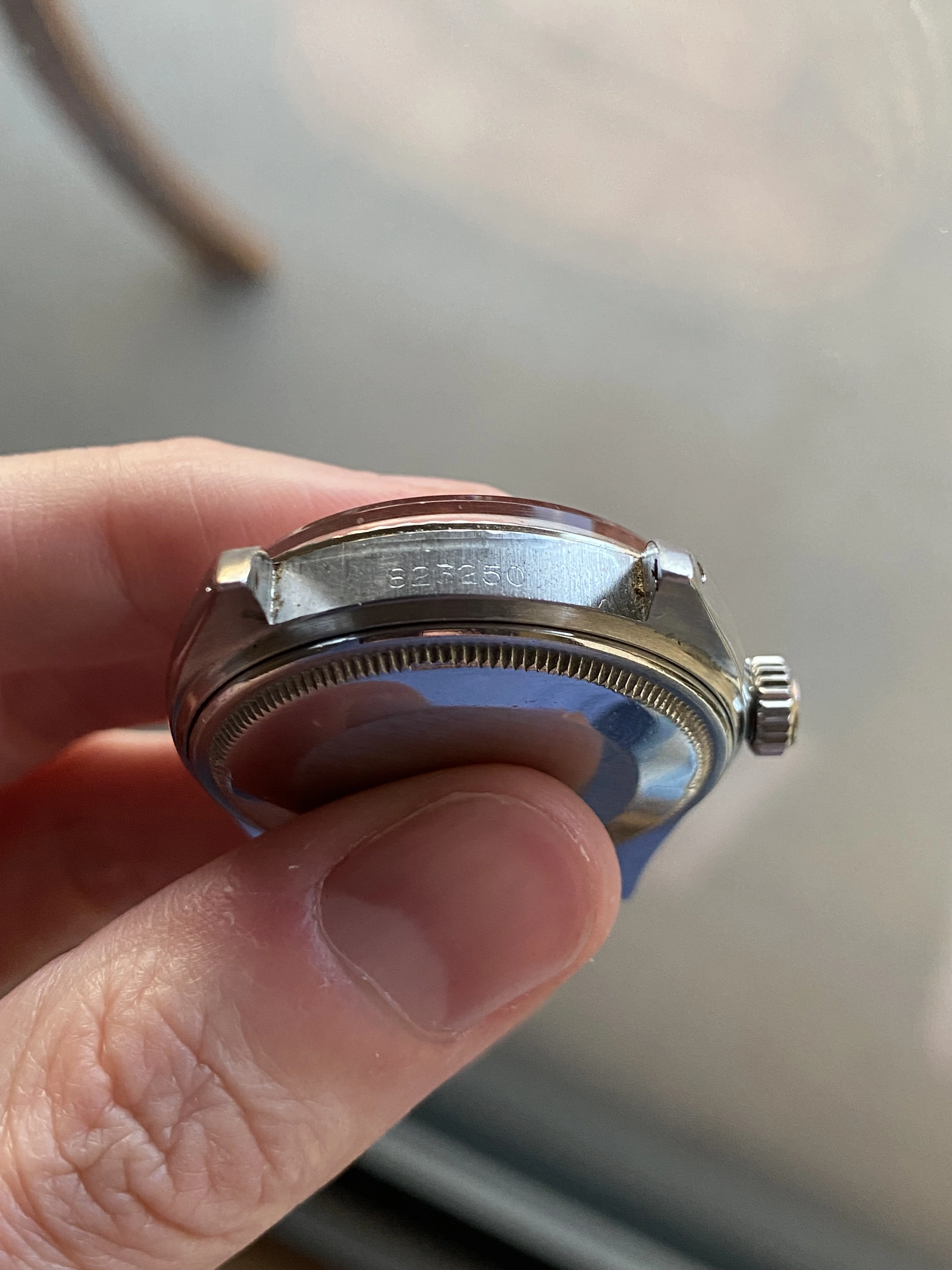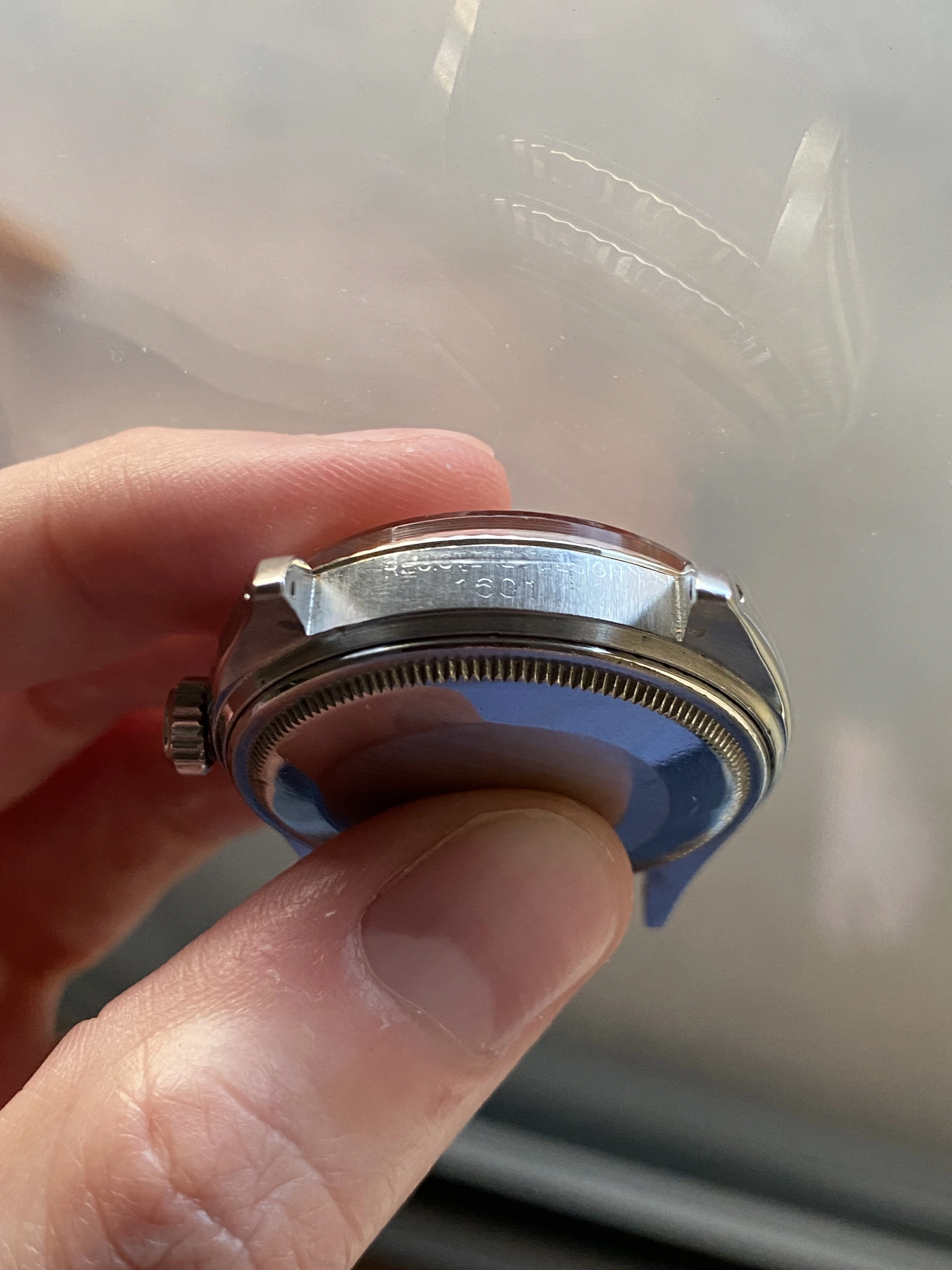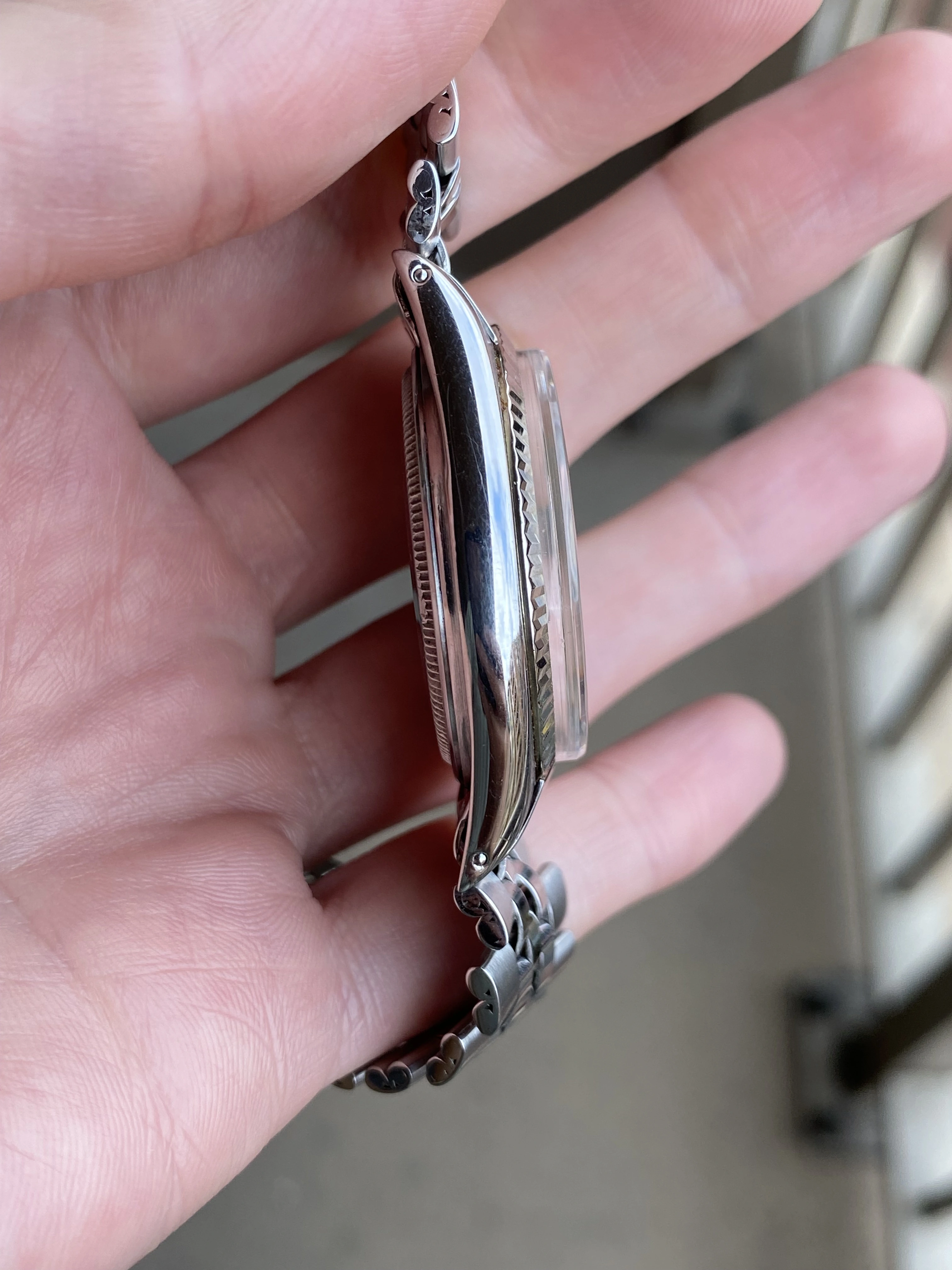Crystal: Crystal is free of scratches. Unsure if it’s the original as they weren’t signed in the era. There’s a small piece of debris stuck on the inside of the crystal (near the date window) that could be removed by a watchmaker.