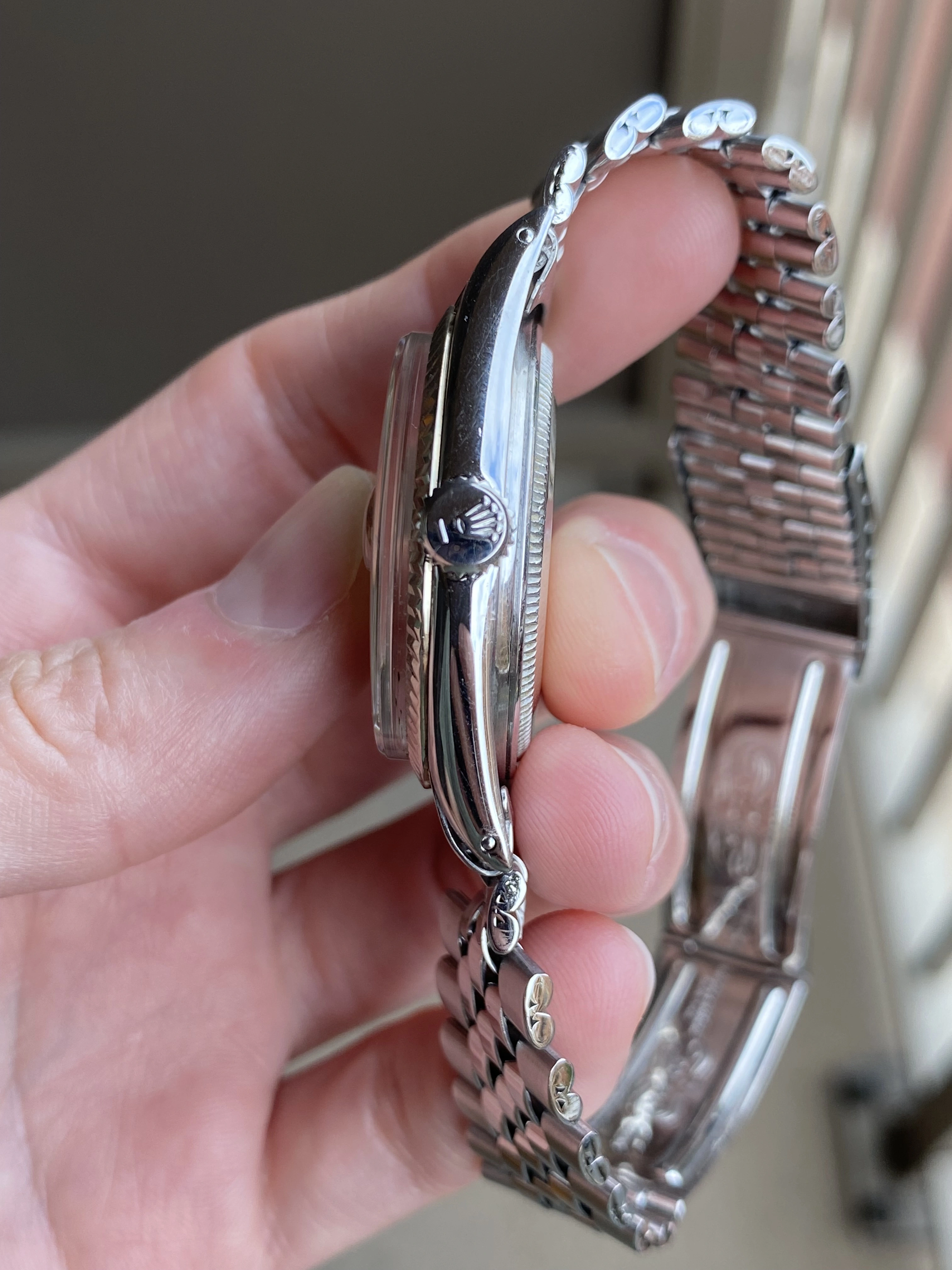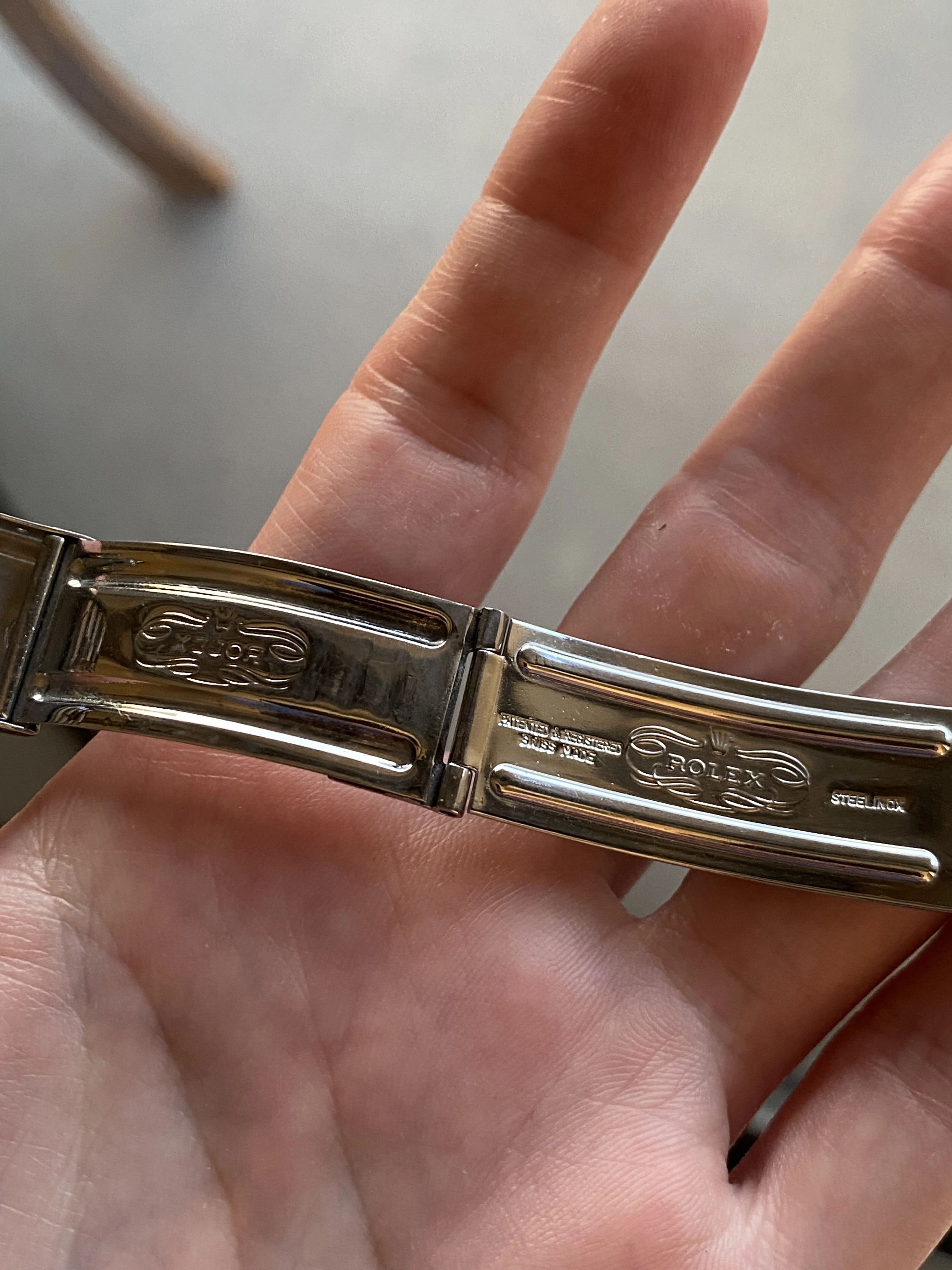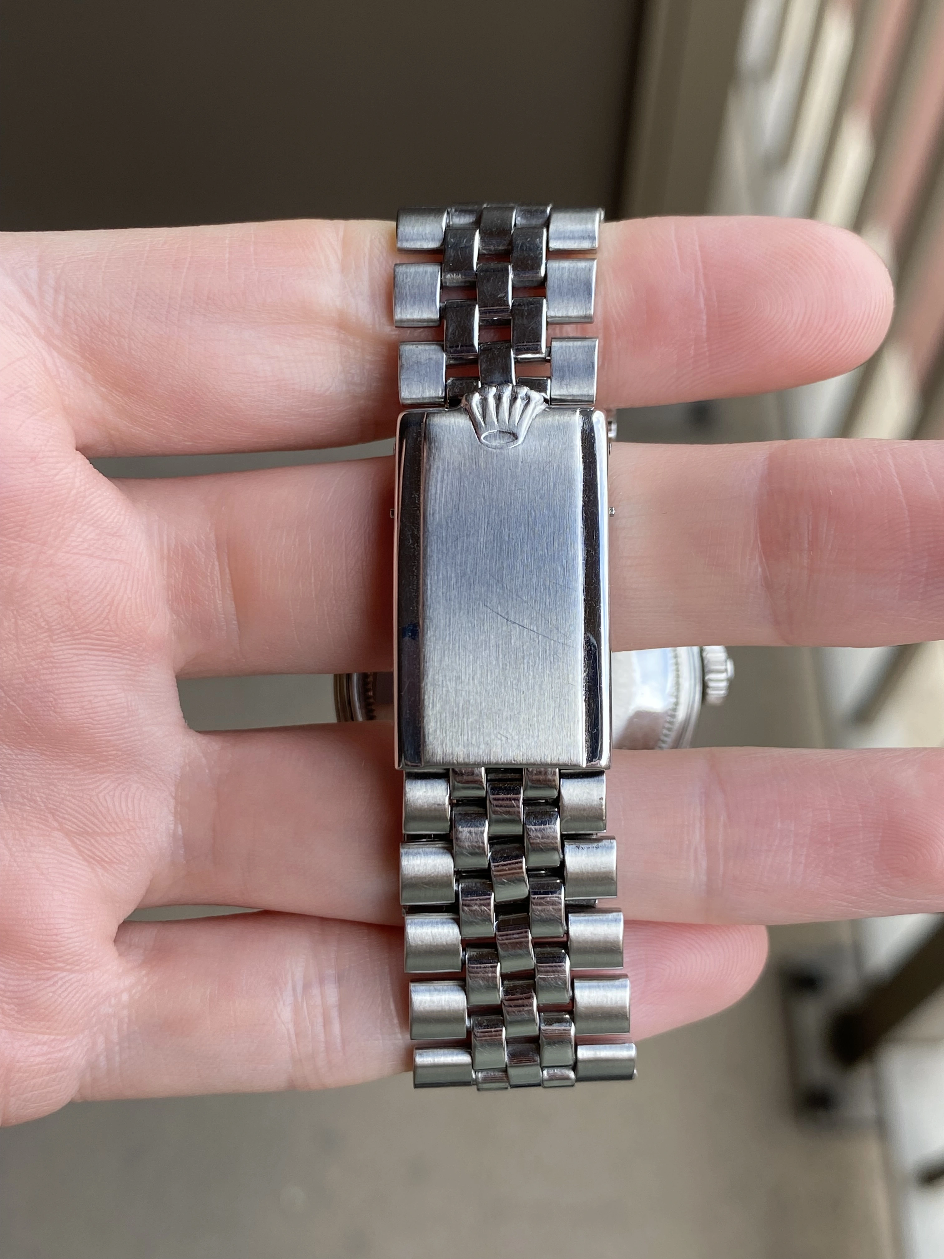 Bracelet: Offered with or without the jubilee bracelet pictured. It has the period-correct old style clasp and 55 endlinks. It has some stretch and may have been refinished at some point.