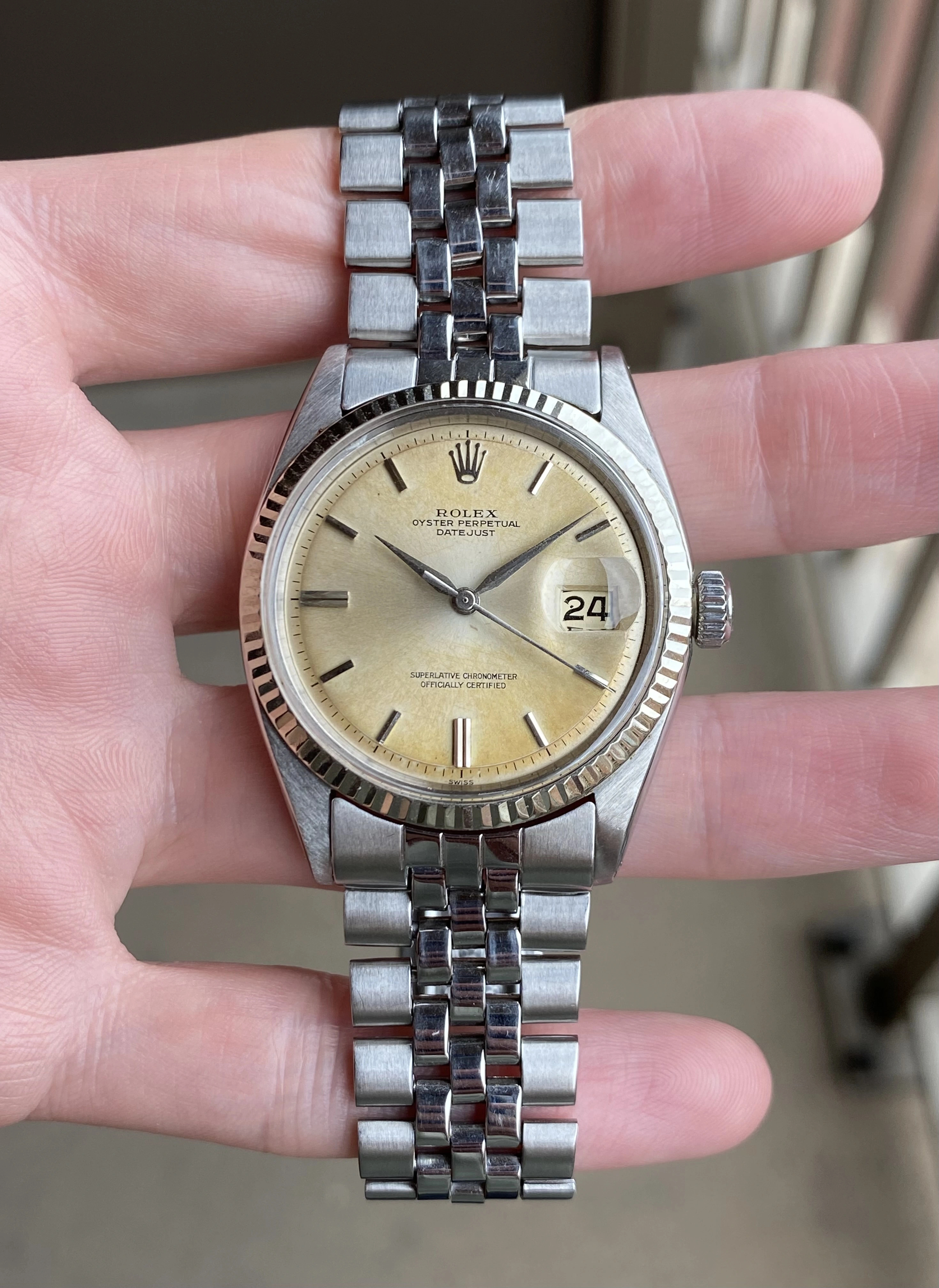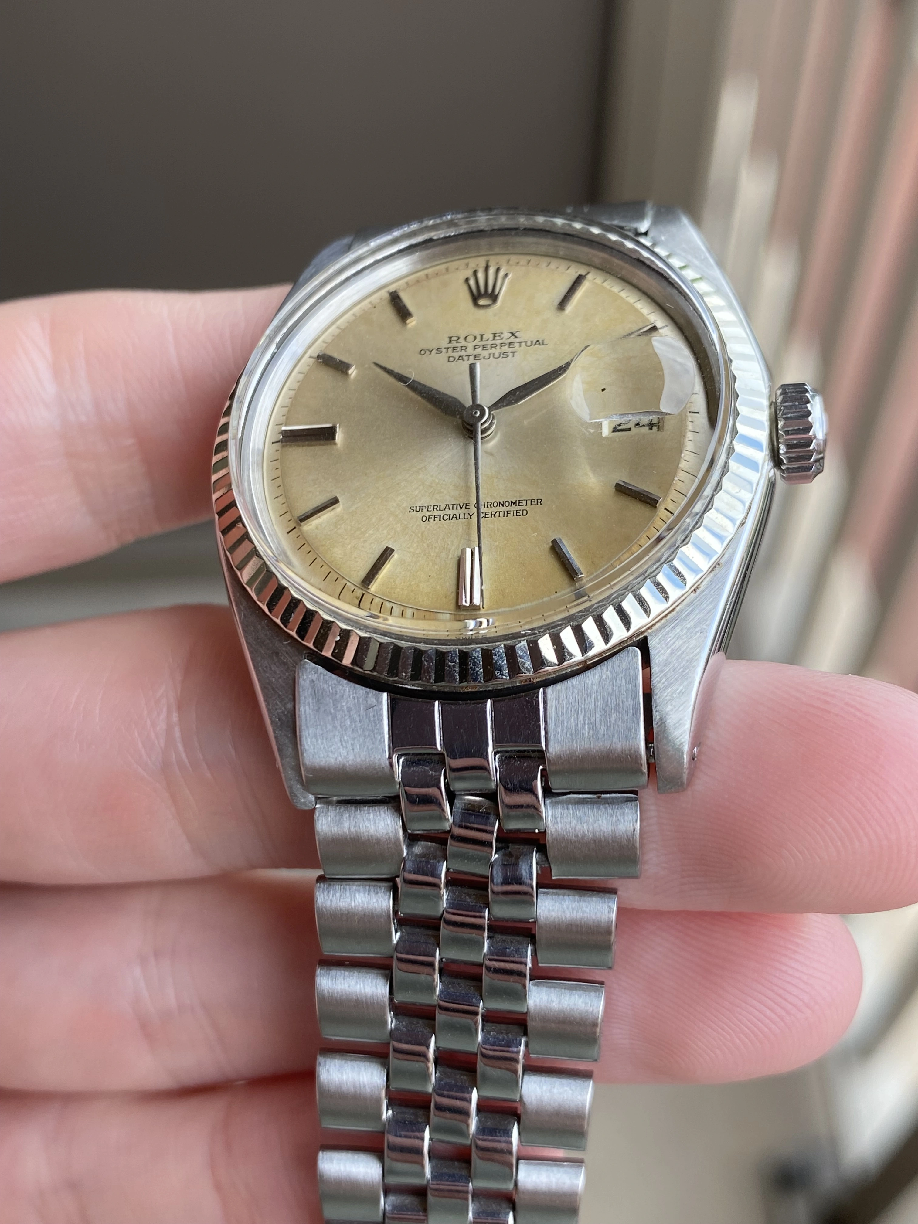 ·Up for sale is a classic 1962 Rolex Datejust 1601 ref. While a common model, this is an uncommon variant w/ a non-luminous dial and attractive alpha hands that only came on these early Datejust models. The 36mm steel case has a white gold bezel and is in nice condition. The dial has developed an even patina that my photos do not do justice to.