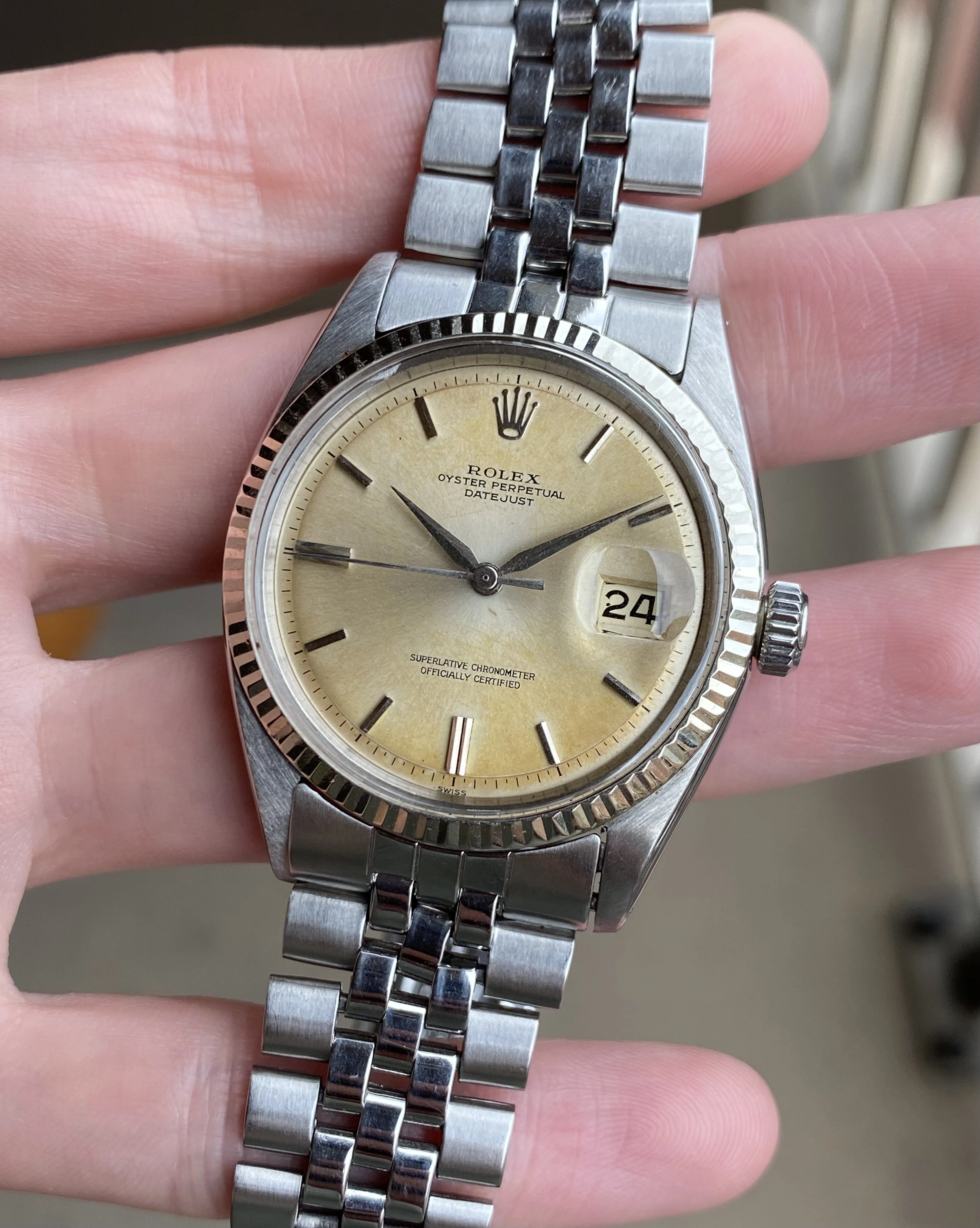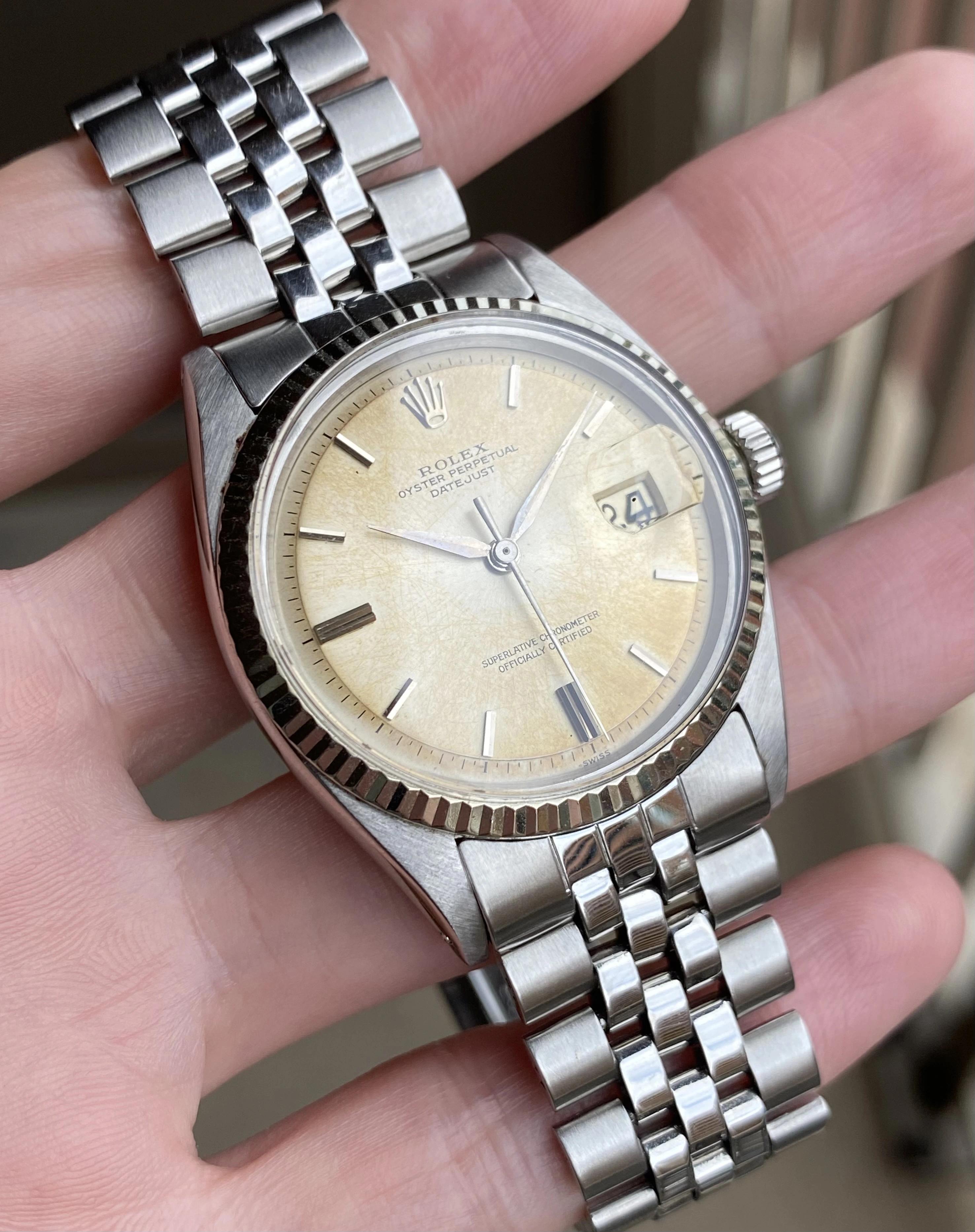 Case: Original, unpolished (or close to it) 36mm 1601 ref. is in nice condition. Features a white gold bezel that’s also in nice condition. Case is correctly marked 1601 between the lugs and serial number dates the watch to 1962.