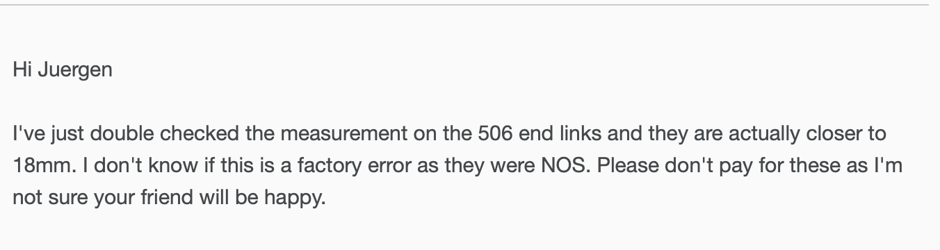 A few days after they arrived, my friend Torsten had to notice, that they were only 17,7mm and 17,8mm. Furthermore those end links were poor razed slant-wisely... :-((