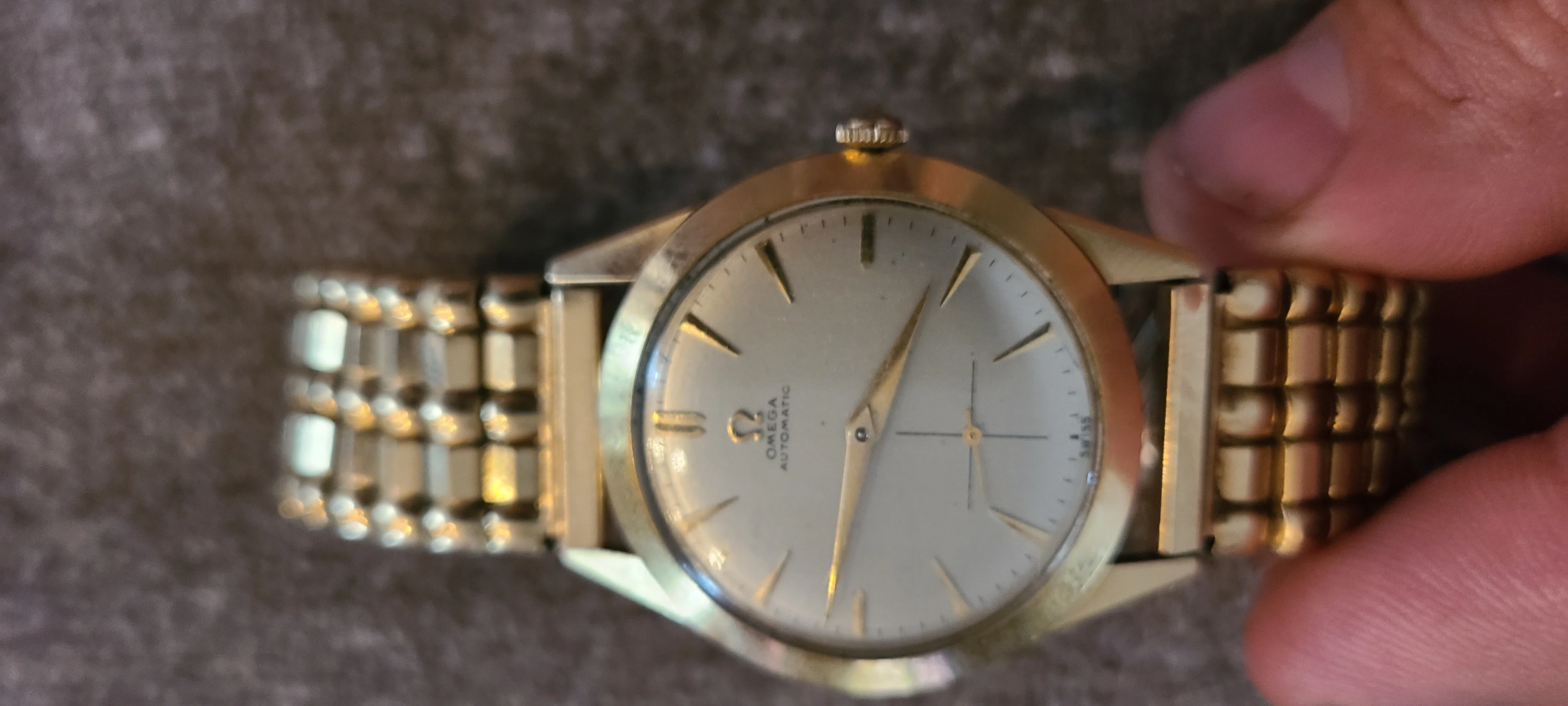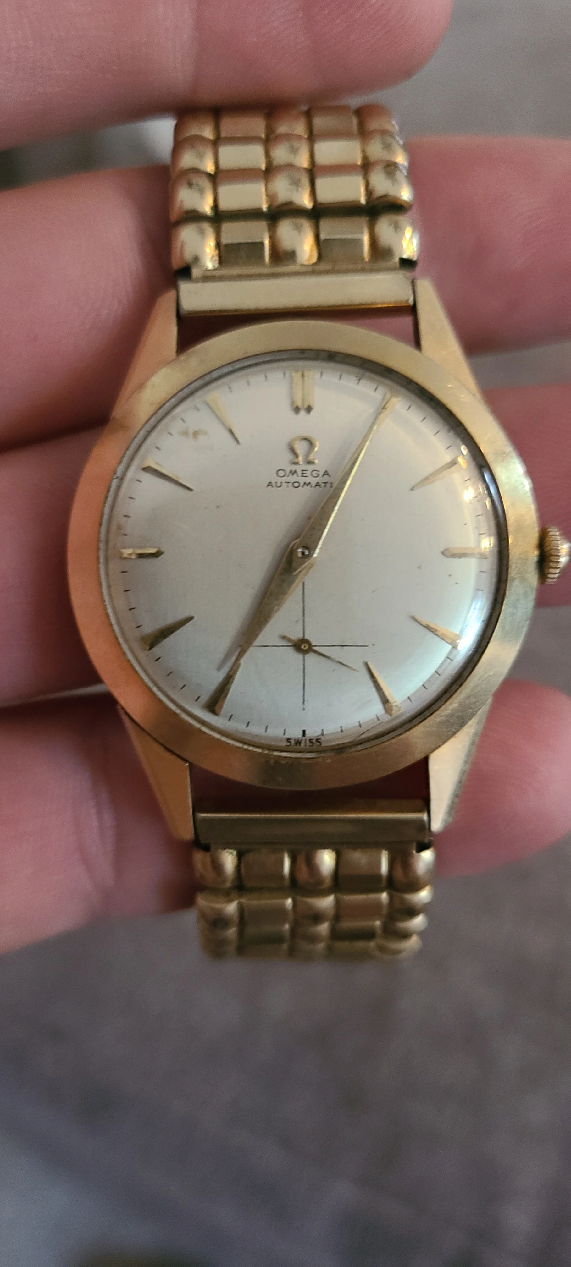·I inherited this non-working Omega Automatic from an elderly friend a few years back and it had belonged to his father before him. It is clearly older, but I cannot seem to find a match to this dial, with the lower cross-hair second hand in any image searches. I've seen similar looking Seamasters but this isn't labeled as one on the face. The original band has been replaced with a Lenox expansion band at some point.