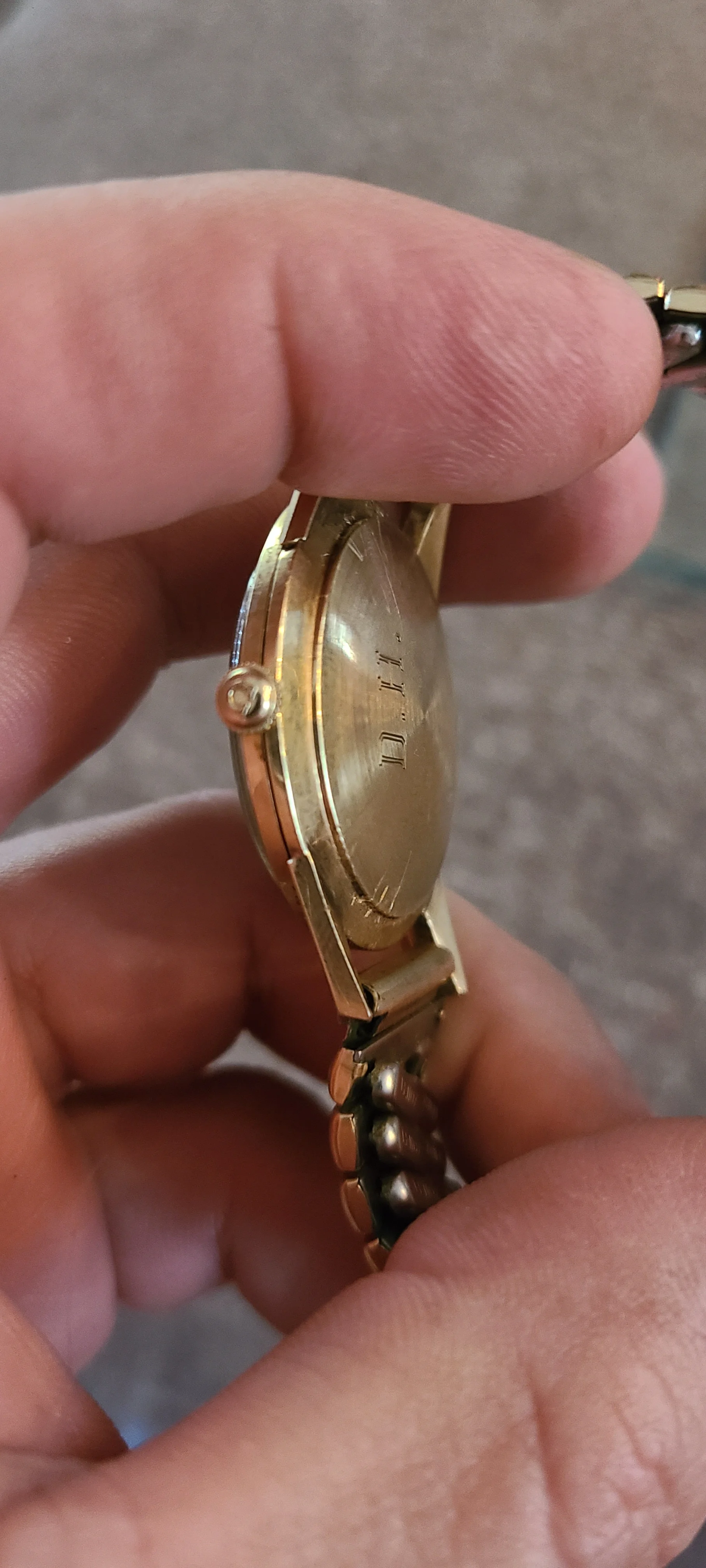 There are no visible markings near the lugs, and the only markings on the back look to be 14K with the Omega logo and the original owners initials. It appears someone has attempted to remove the back at some point and made some scratches. I have not attempted to remove the back because I can't see any sort of notch to aid in removal and I don't want to make things even worse.