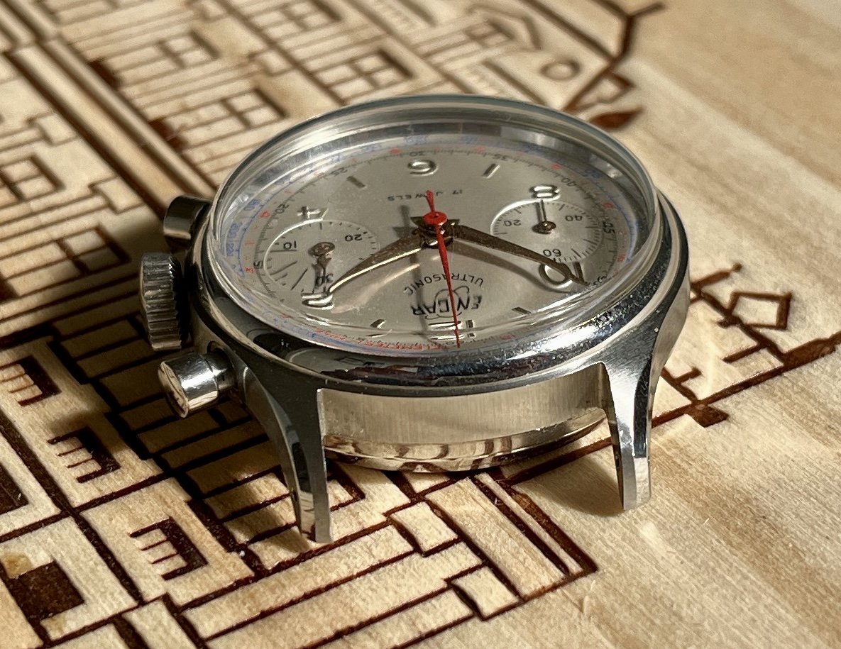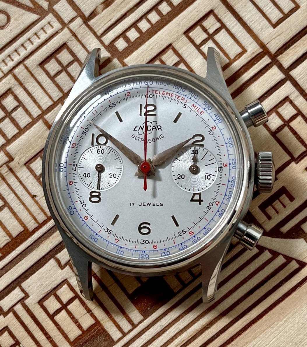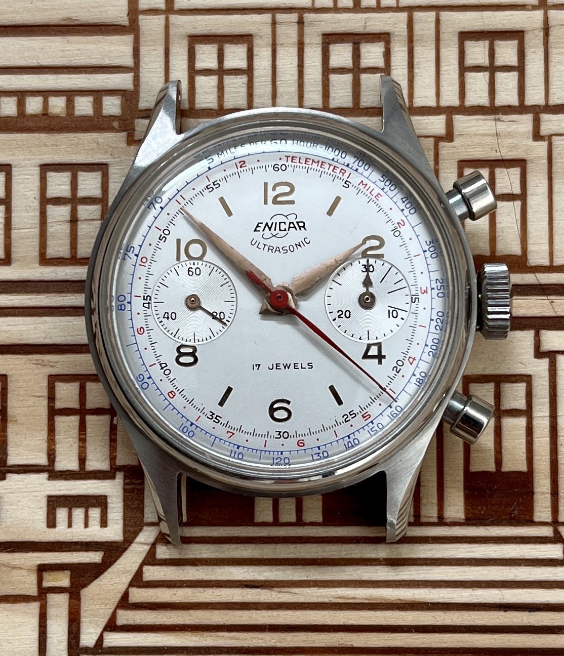 Next one up for sale is a 34mm Enicar Ultrasonic chronograph powered by the Valjoux 92 movement in mint condition, which I believe is from the 50s (please correct me if I'm wrong). I bought it in October of last year at a local watch fair for it excellent condition, had it serviced in Jan 2023 with the intention to keep it. However, it turns out that I prefer wearing larger chronographs. It comes with an Enicar box, strap and buckle.