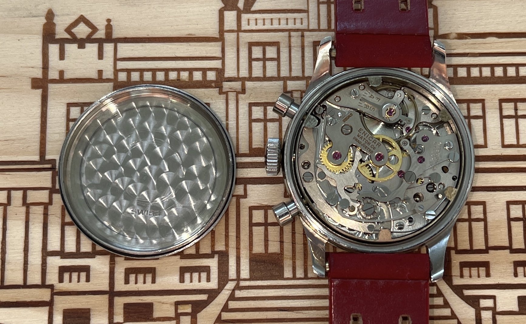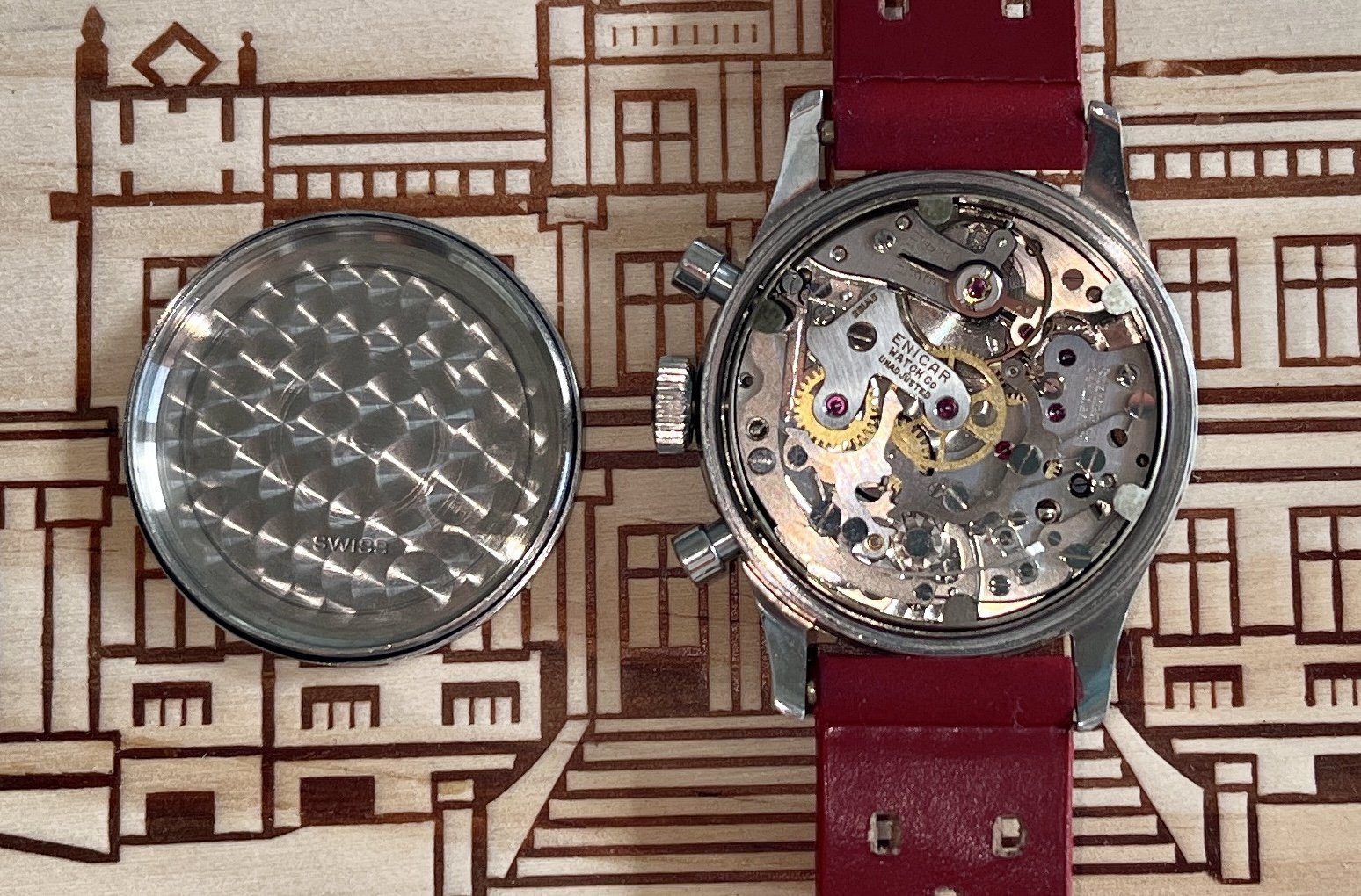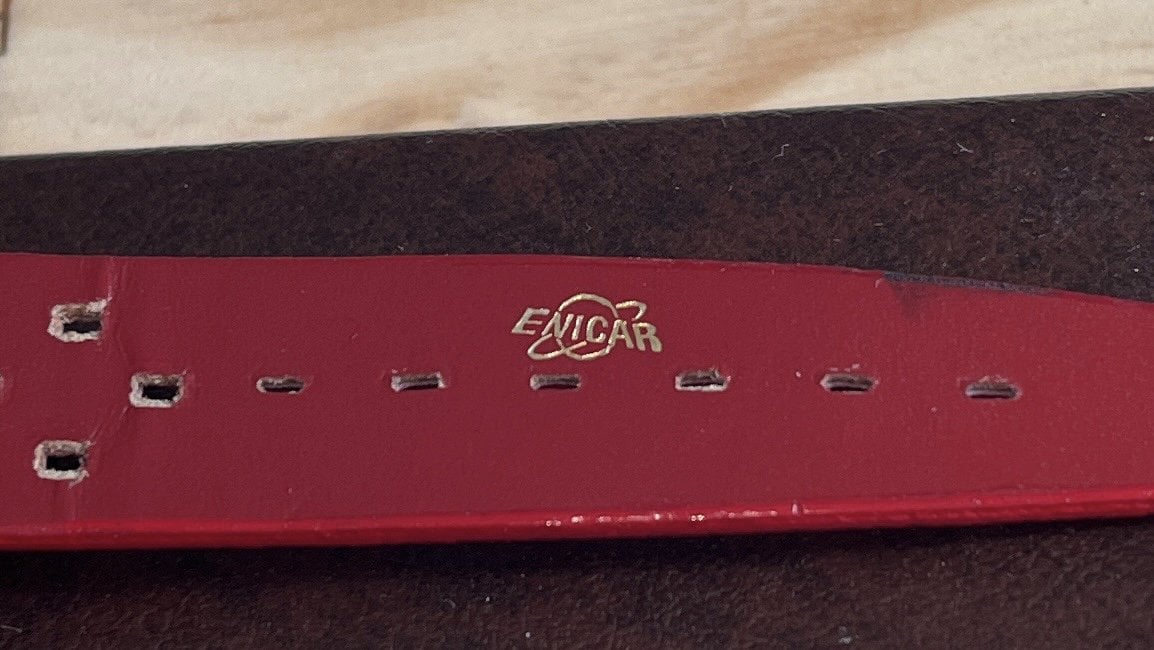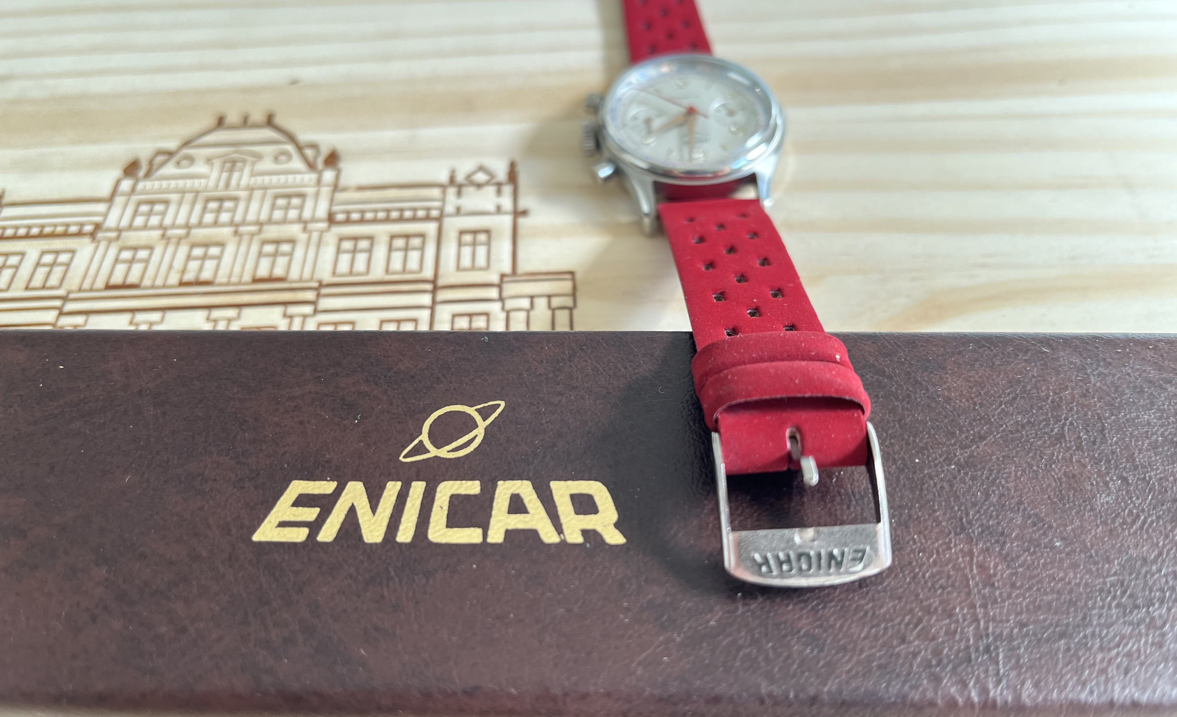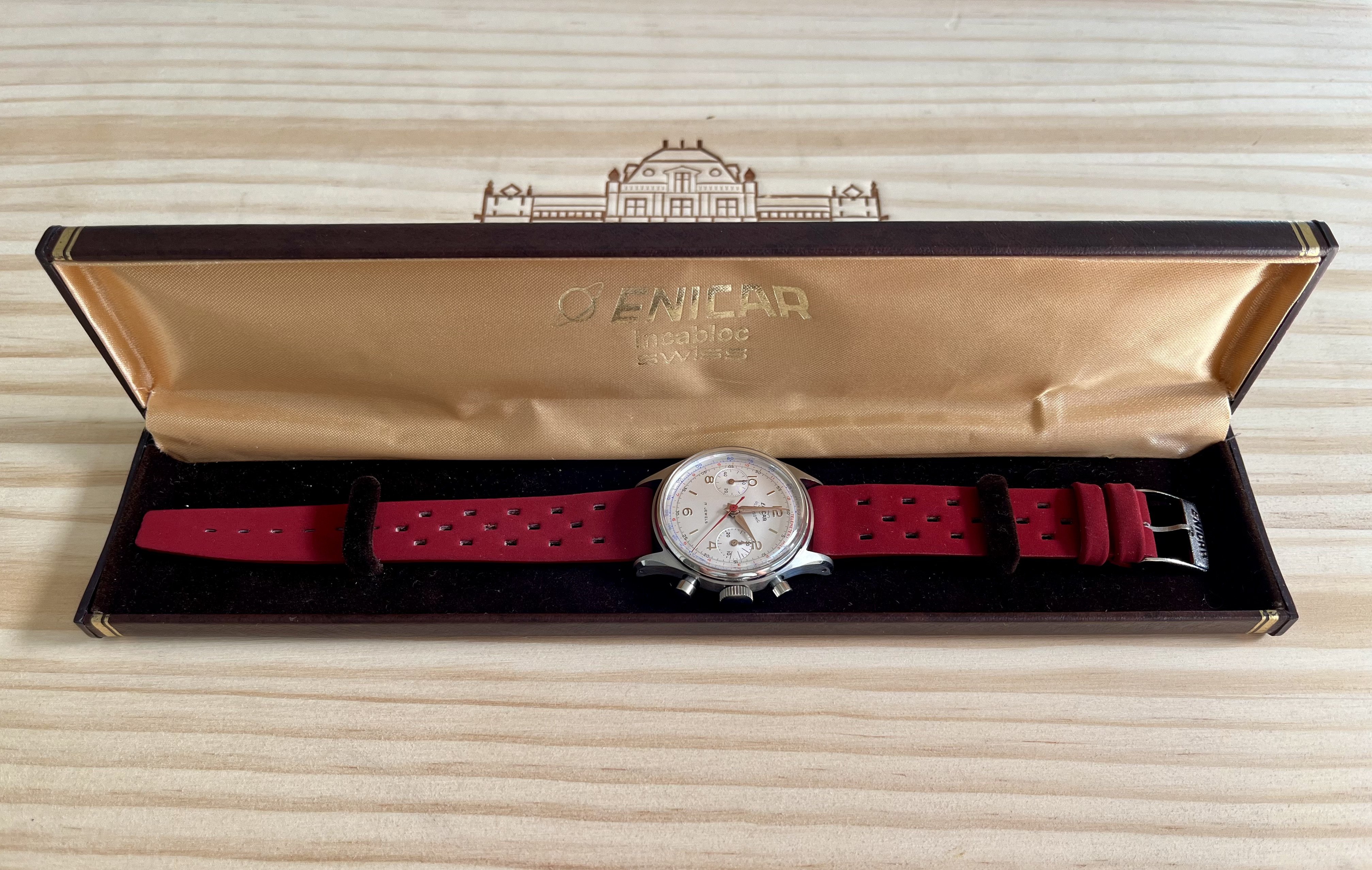 Accessories: Original Enicar box, red strap with soft velvet like texture that nicely matches the red chrono hand and red telemeter scale, and an Enicar buckle. I bought the entire set like this so nothing put together by me. The strap has signs of use. I personally never wore on the original strap, but used a aftermarket strap to preserve the original strap.