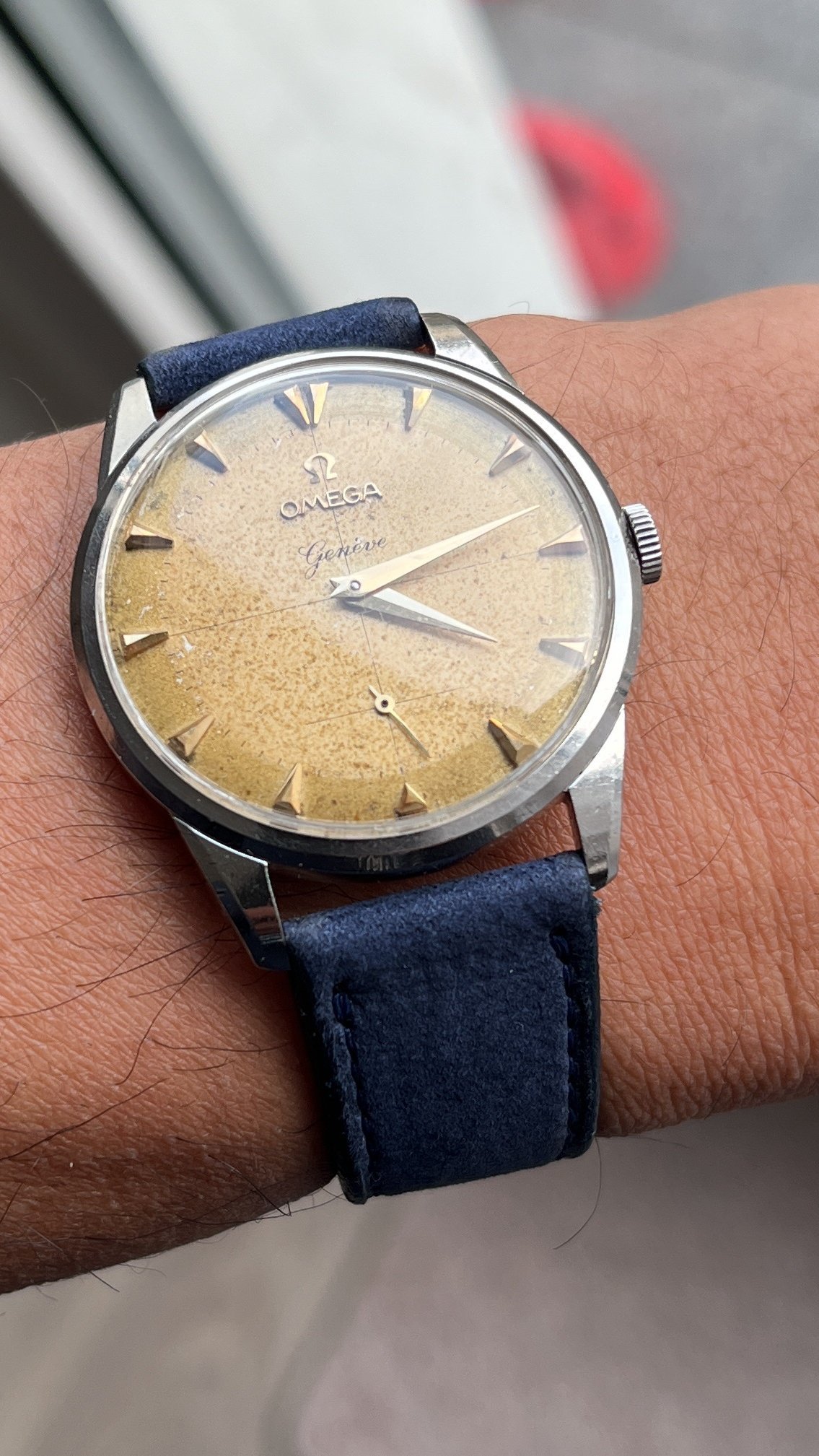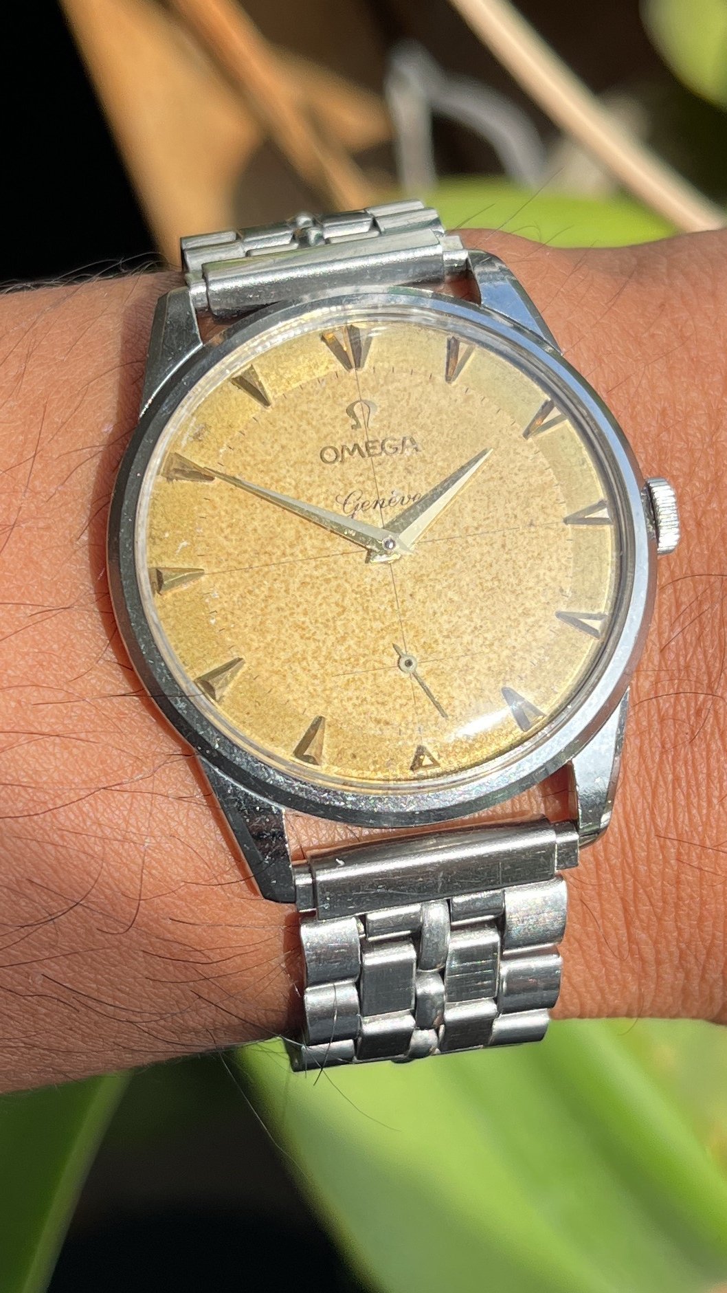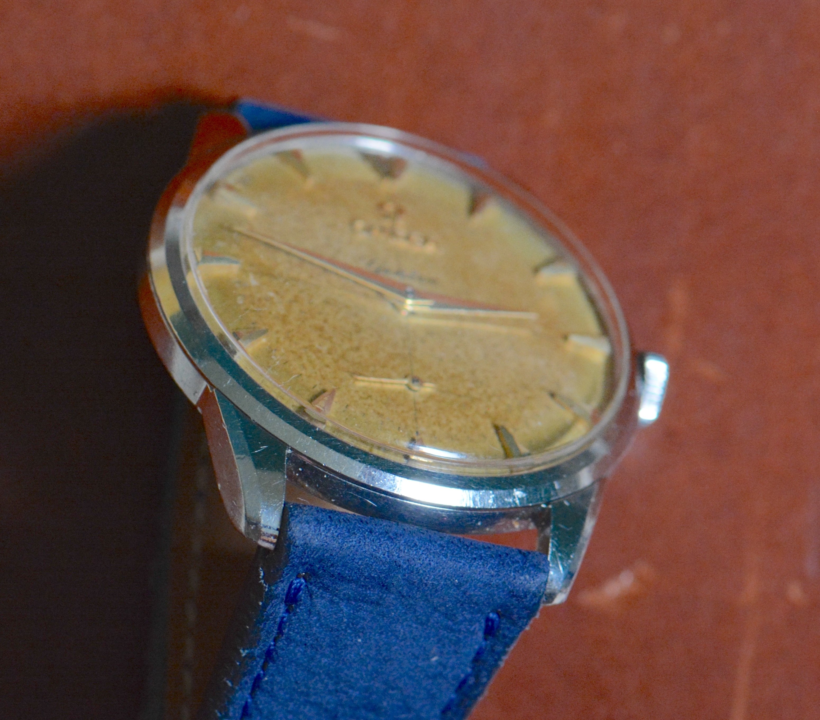 Dial: The dial has developed a strong, yet fairly evenly spread patina that really shines under sunlight. The clean gold colored, non-luminous hands and markers complement it very well. The true nature of the patina is hard to capture with the camera, so I added a lot of wrist shots.
