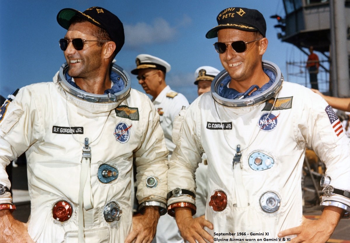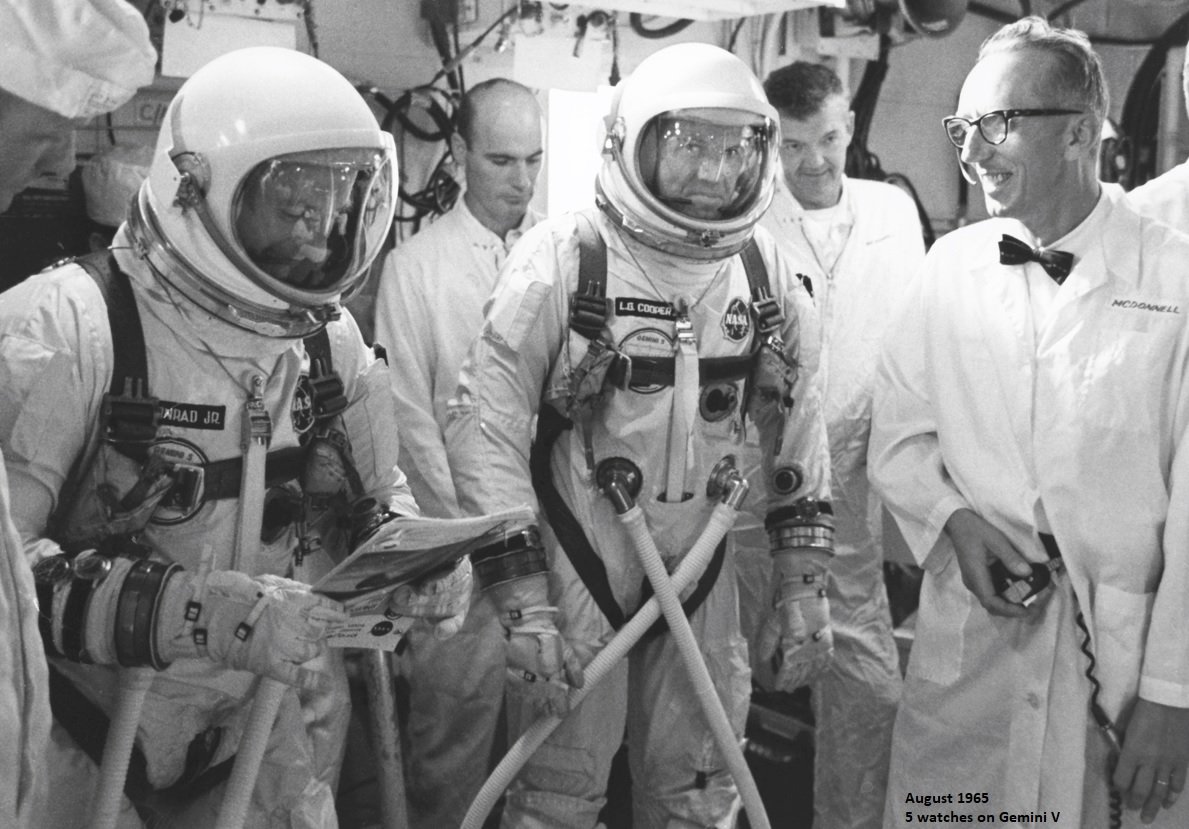 In August 1965, US Navy test pilot Charles "Pete" Conrad was the first NASA astronaut to wear an automatic wrist watch in space as he had chosen to wear his personal Glycine Airman automatic pilot watch during the Gemini V mission. The third manned Gemini spaceflight was intended as a long-duration simulation of an 8 days long Apollo flight... or as Pete Conrad called it post-flight " Eight Days in a Garbage Can ".