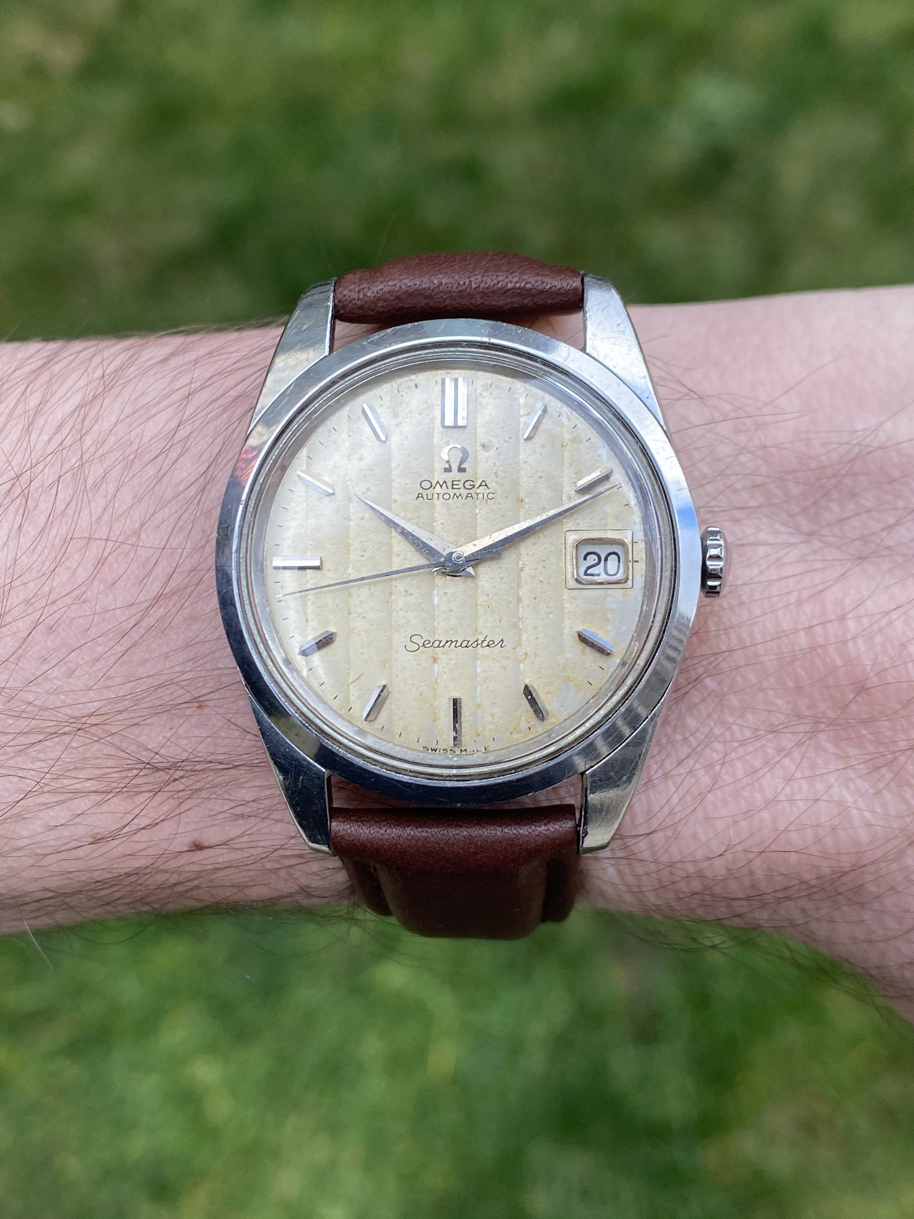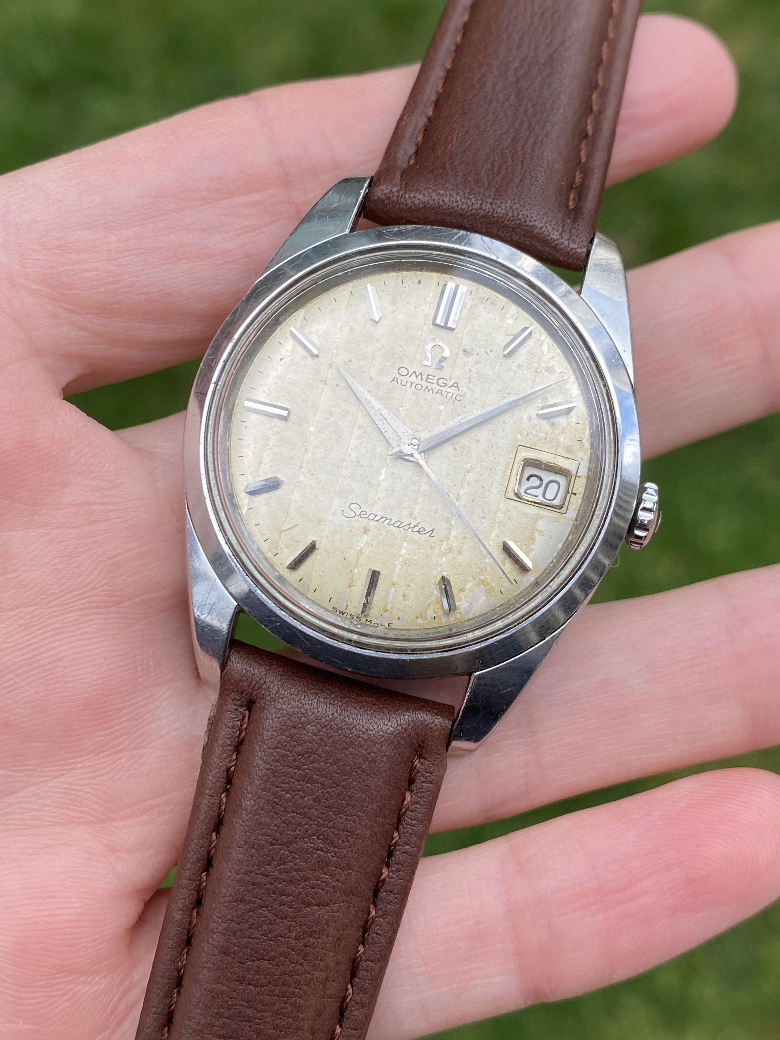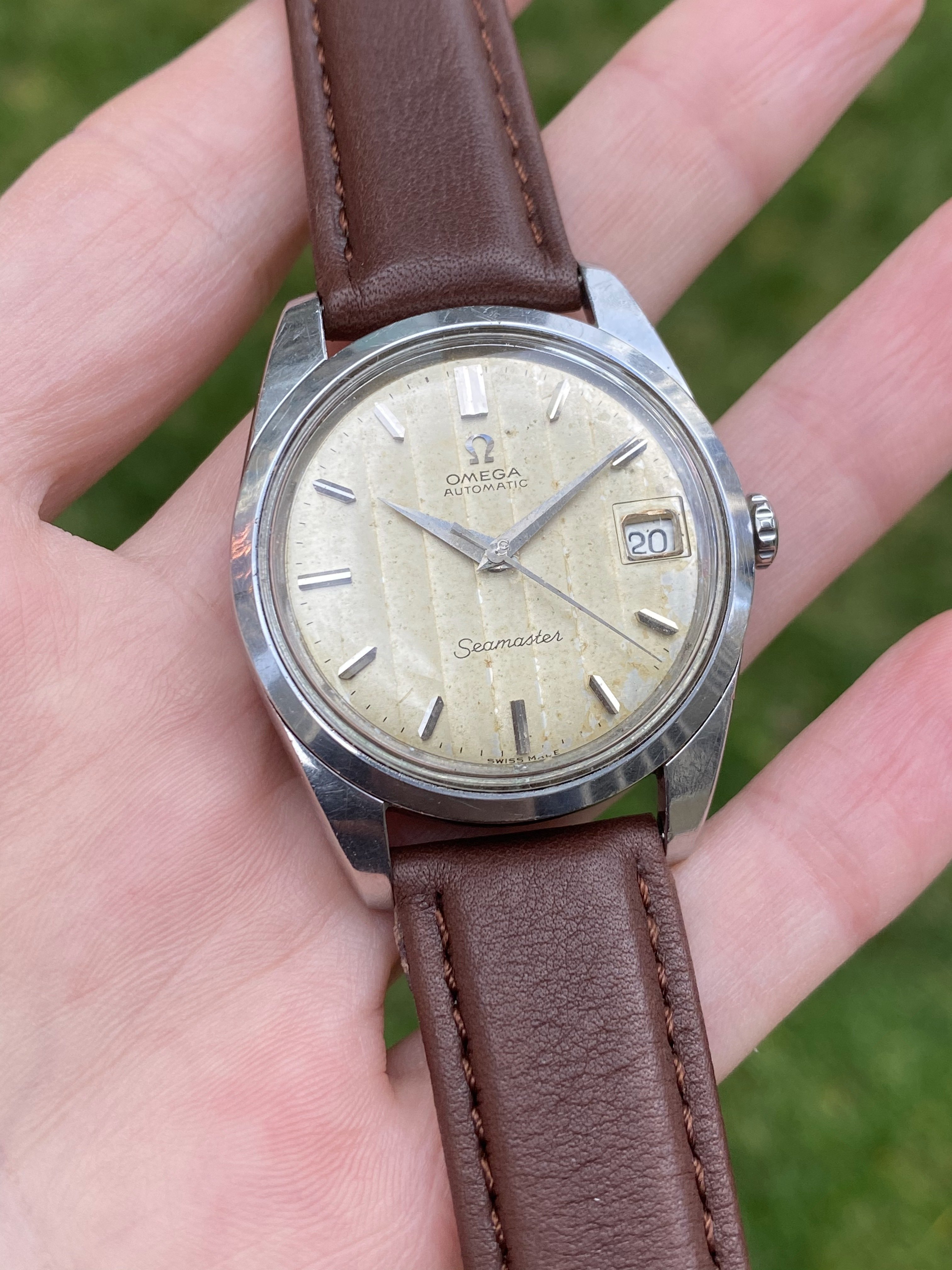 ·Up for sale is a nice, original 1965 Omega Seamaster 166.010 reference with an uncommon ribbon dial. The original dial has developed patina. The stainless steel case is in nice condition. The movement runs, winds, and sets well, but service history is unknown. Crystal and crown are signed. Please see below for more info, and don't hesitate to reach out if you have any questions.