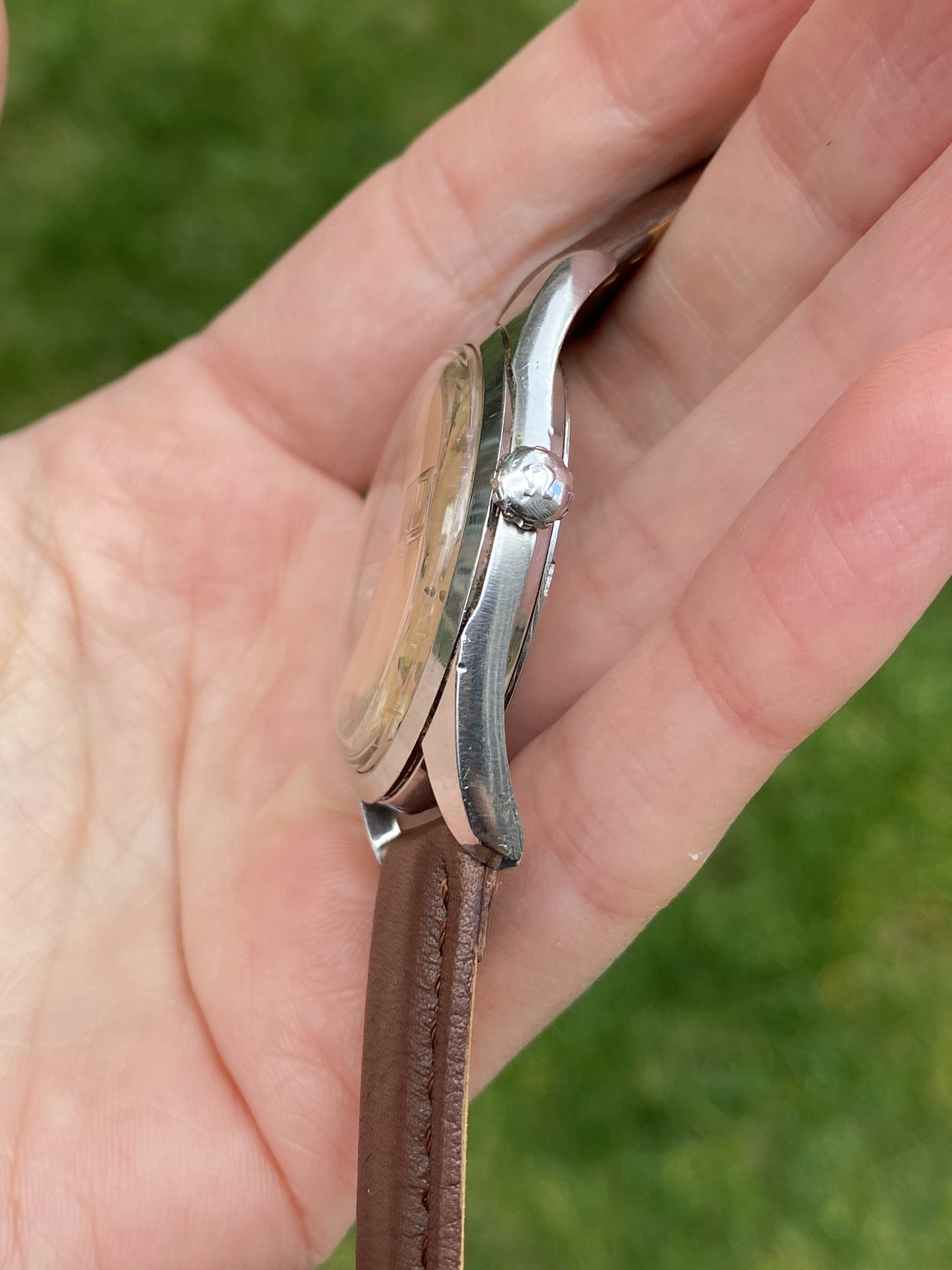 Strap/buckle: Comes on the 18mm brown leather strap and stainless steel buckle pictured. Edit: I also have a genuine vintage beads of rice bracelet if interested (extra cost).