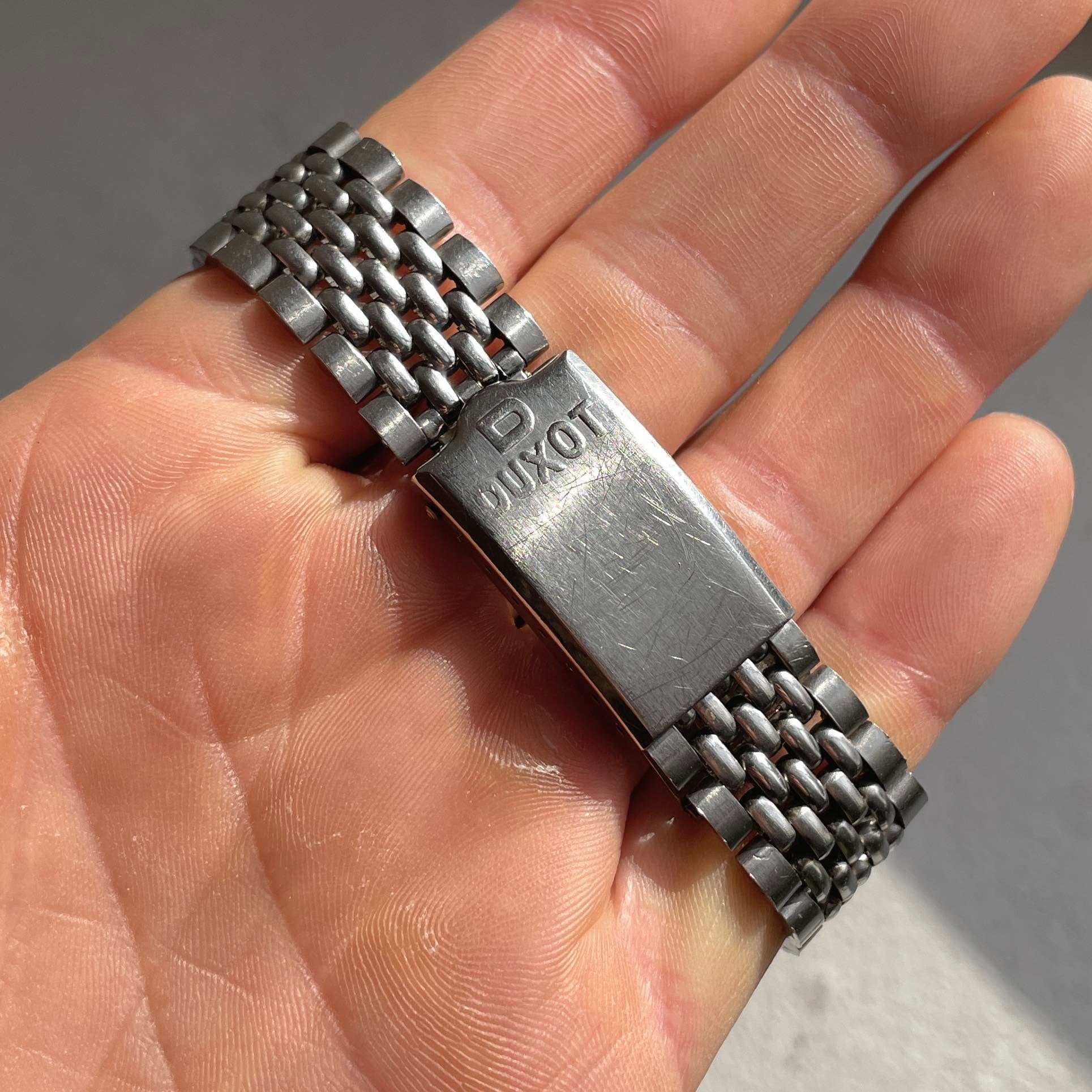 Case is 36mm excluding the original crown, screwed caseback. There is some scratches and some small dents but what I belive an unpolished case. This case is not those common generic skin diver cases you often find from the 60s and 70s (and also on other Duxots with this dial) but rather a well made peculiar design with sharp angeled chamfers.