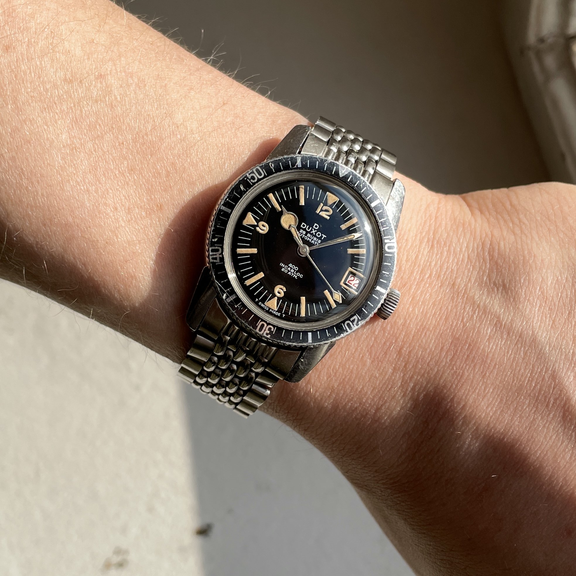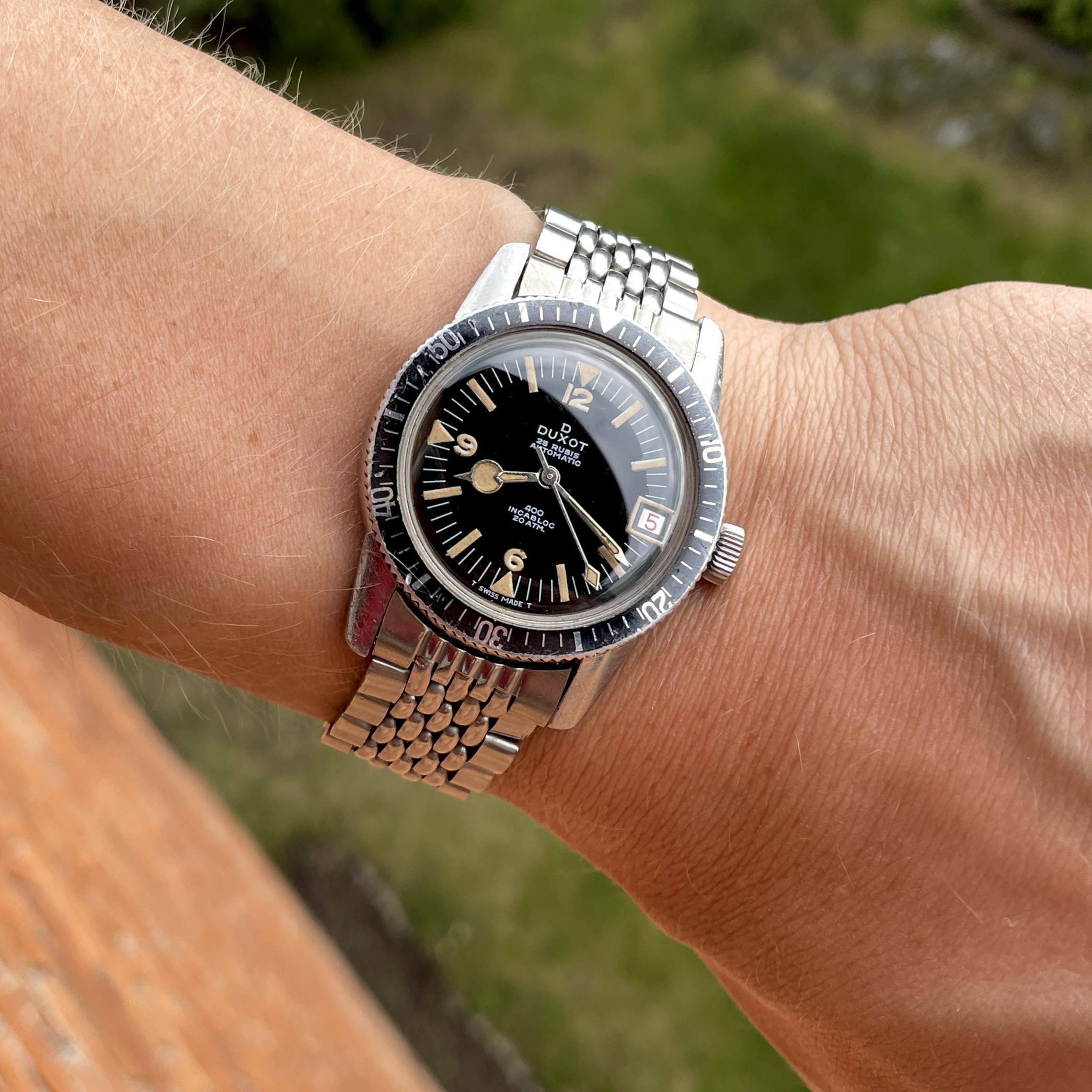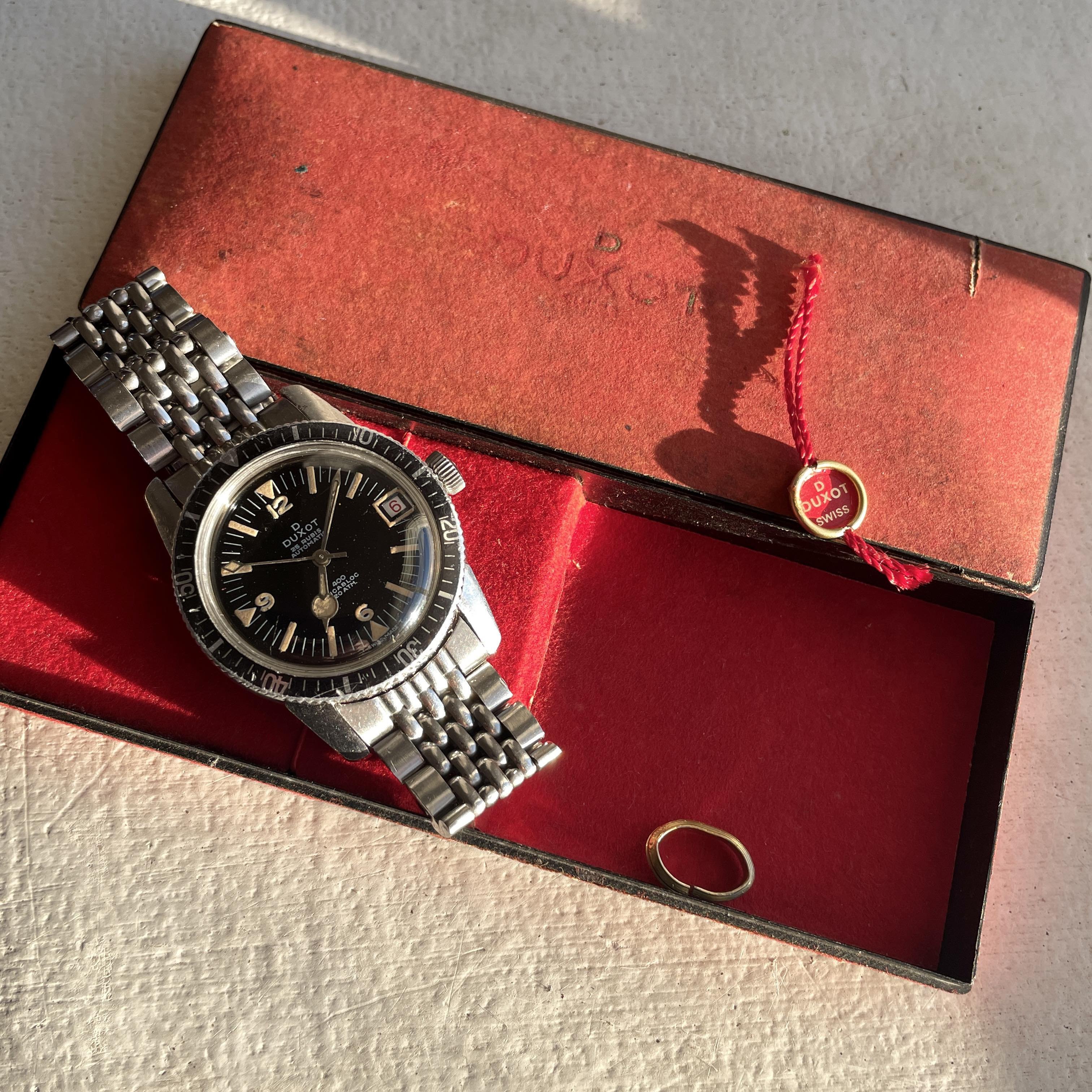 ·For sale is a Duxot diver from the 60s, all steel case and 20ATM waterproof. Stunning glossy black dial, aged lume, and a feature that is very uncommon - lumed date window 😁