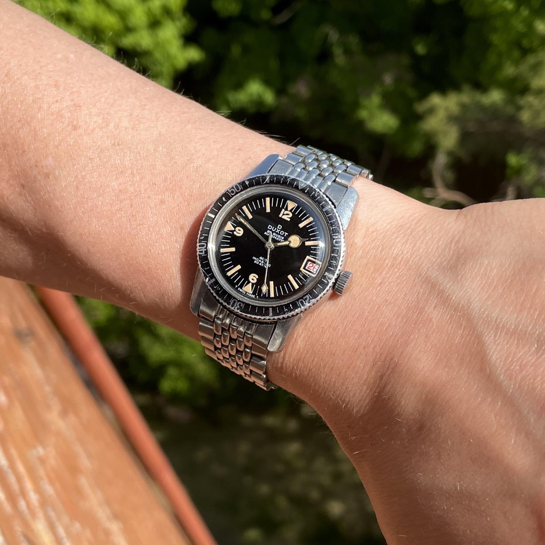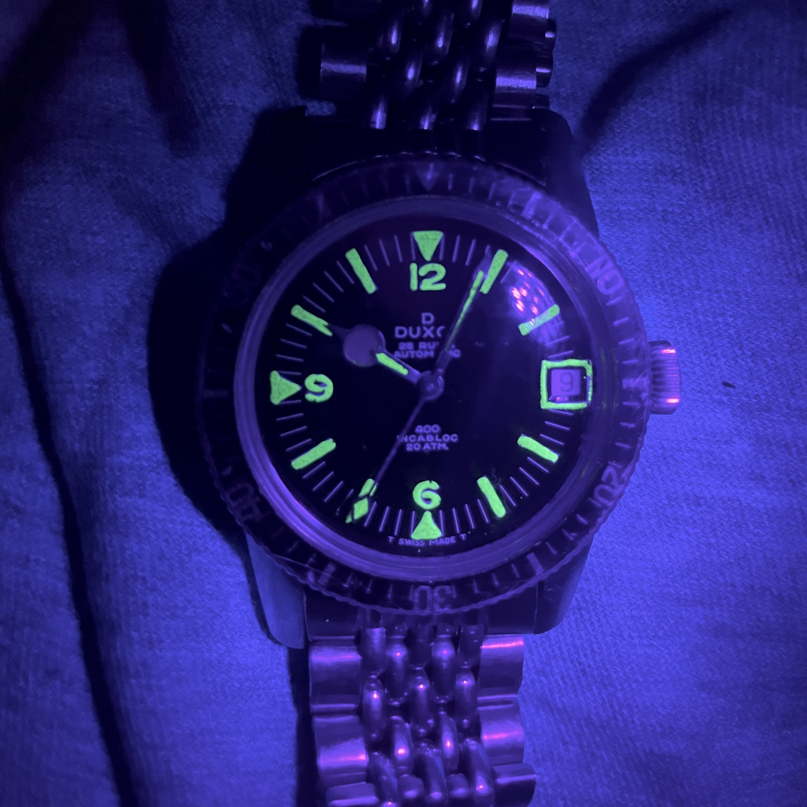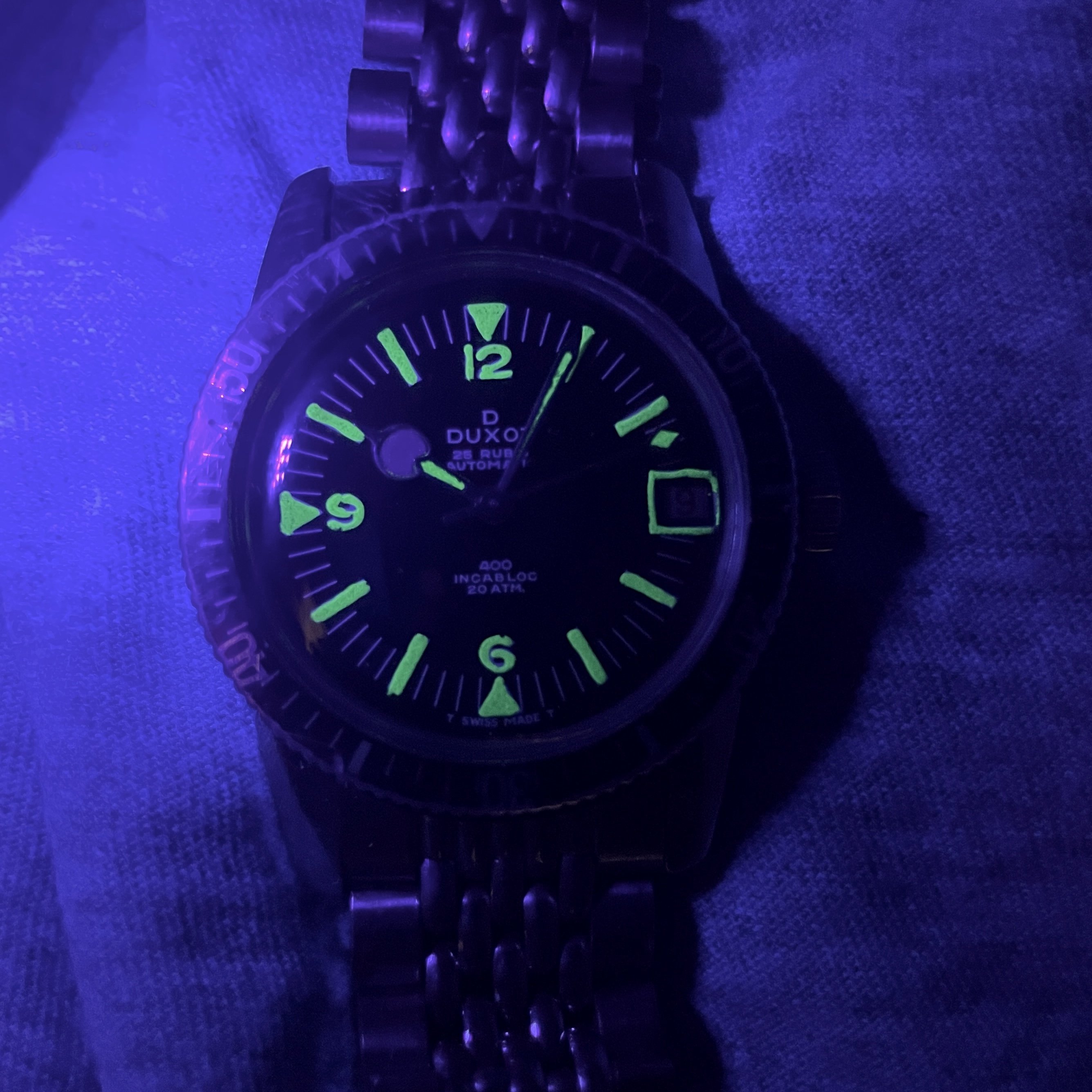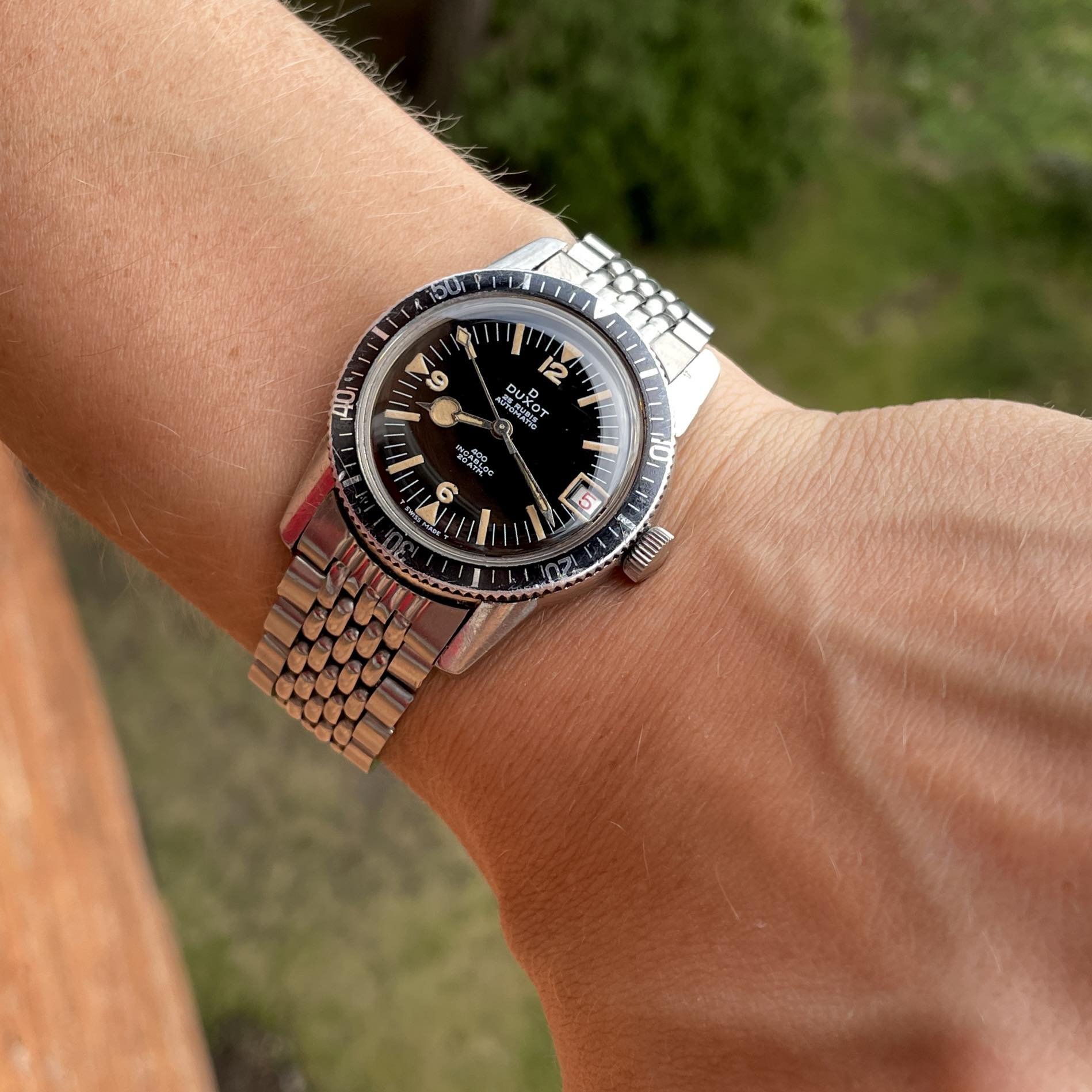 ·For sale is a Duxot diver from the 60s, all steel case and 20ATM waterproof. Stunning glossy black dial, aged lume, and a feature that is very uncommon - lumed date window 😁