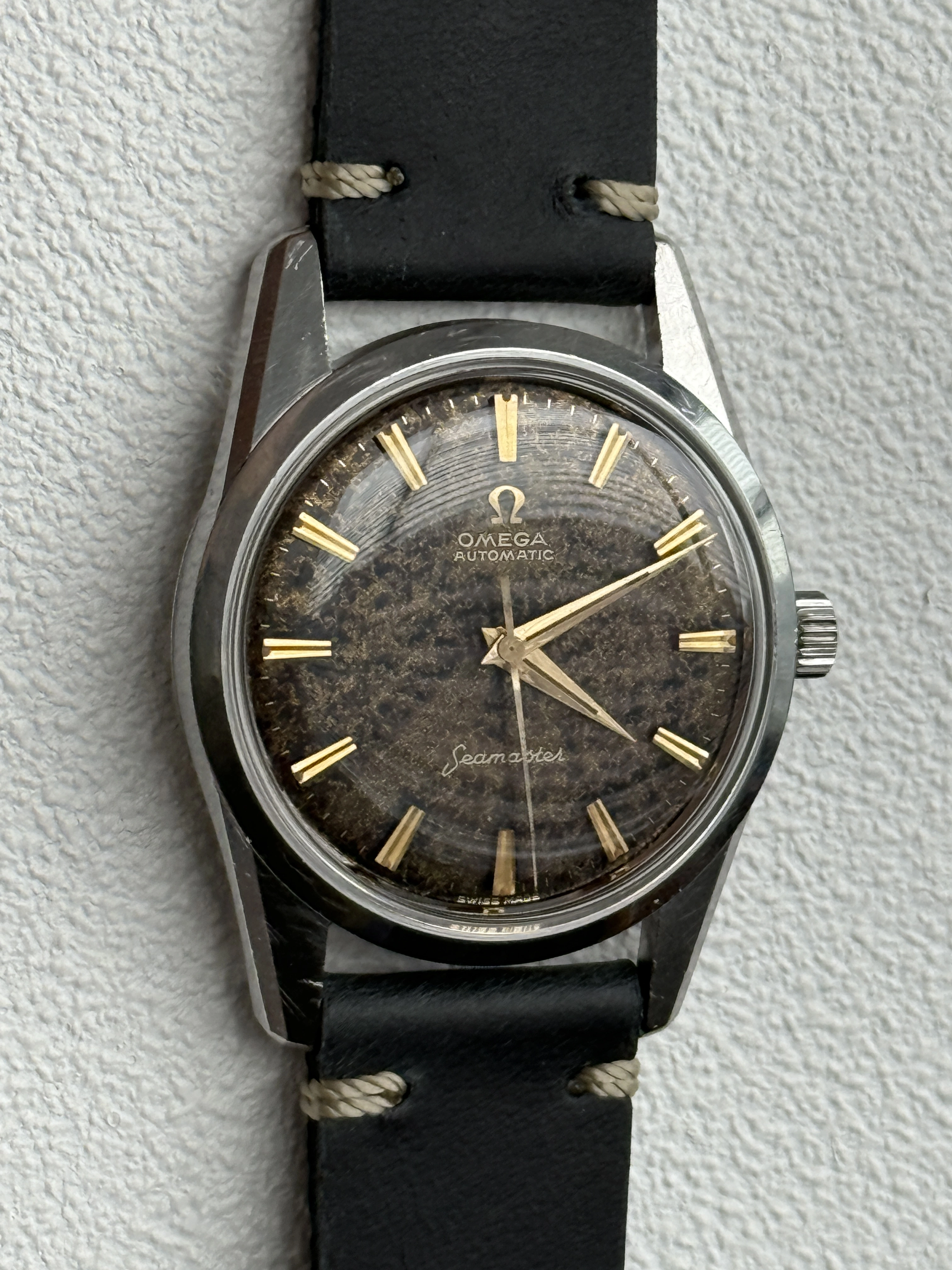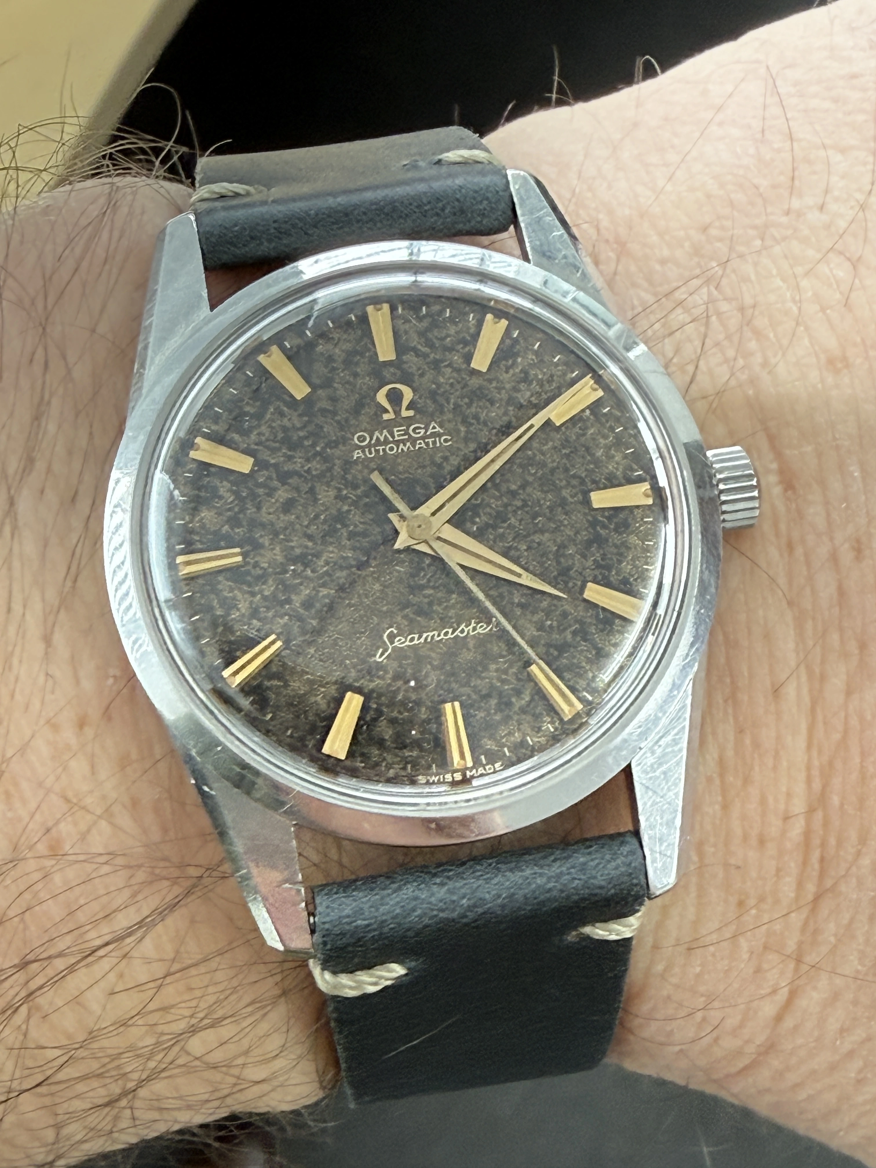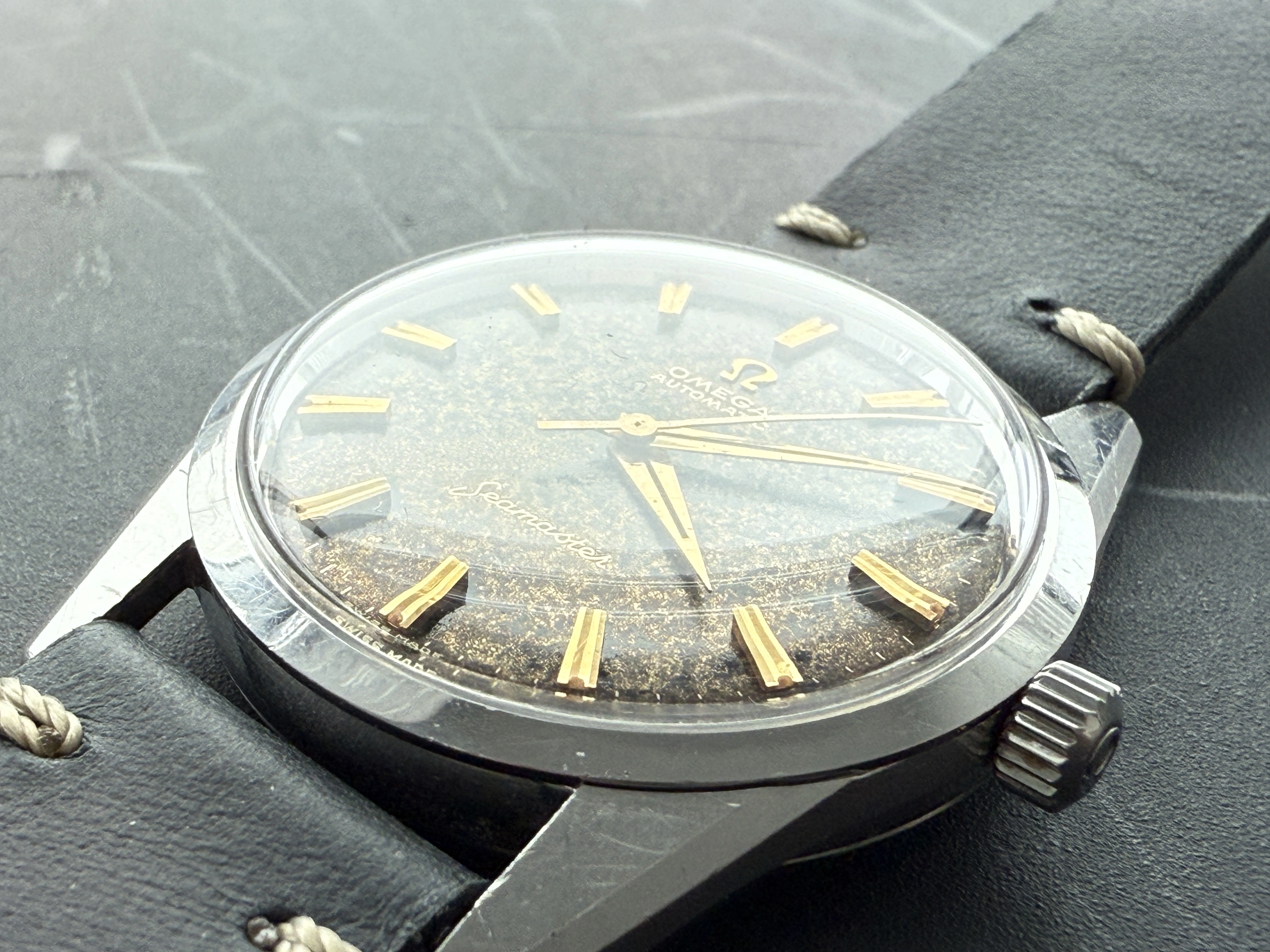 All original black/gilt dial 50s and 60s Omega are rare and often messed about. Indeed I have more than once advised noobs to avoid them like the plague. This one is clearly original but heavily patinated. Back in the day this is exactly the kind of watch which would have been routinely redialled. Maybe it was chucked in a drawer and forgotten about.