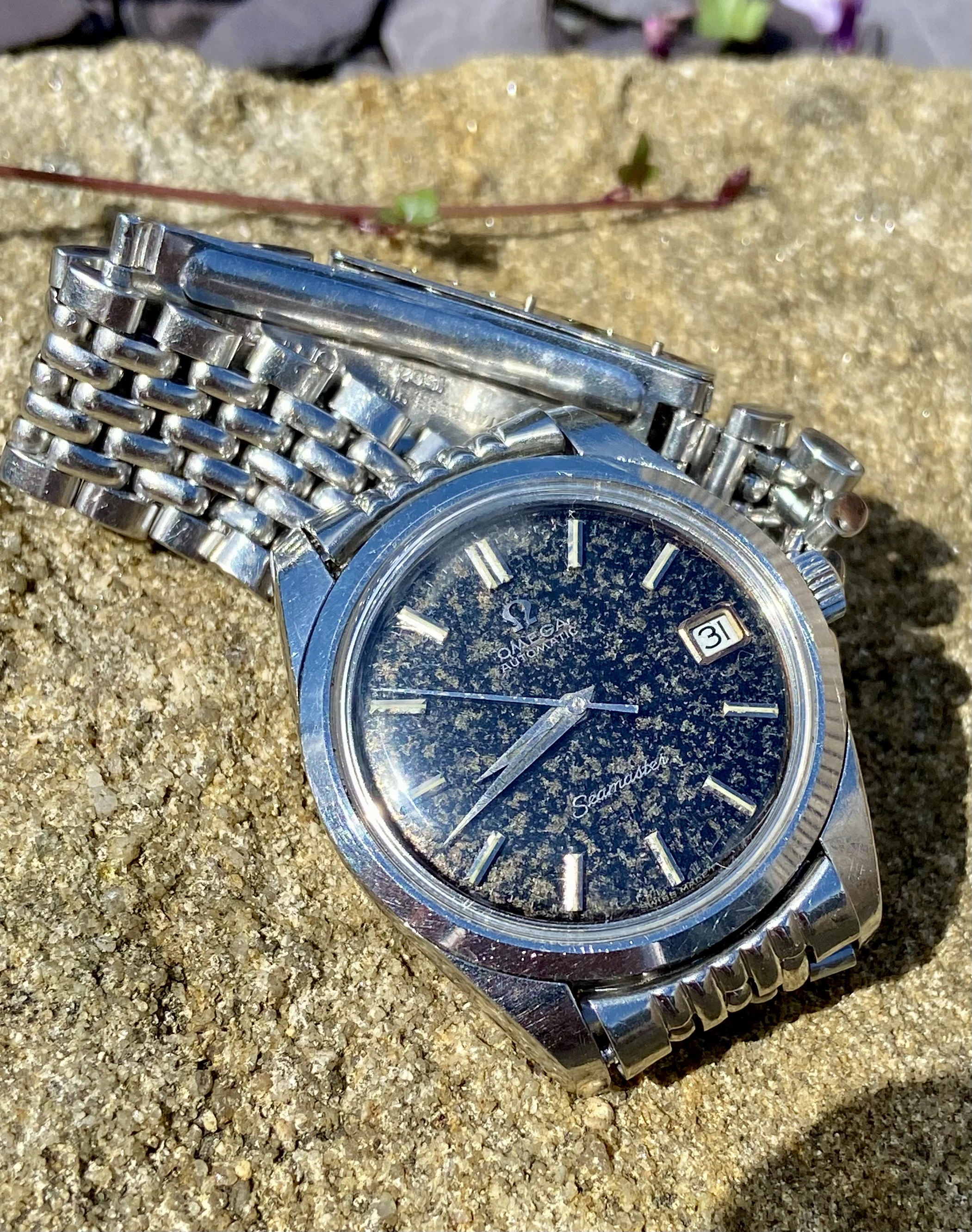What stands in its favour though is that where the black lacquer has broken down to a sort of mottled blue/grey, the brass substrate colour is coming through which works well with the gold markers and dial text. It changes colour and shade depending on the direction of light hitting it. Anyhoo I like it, but I would understand why some would prefer it glossy black and mint. More pics for your delectation or scorn.