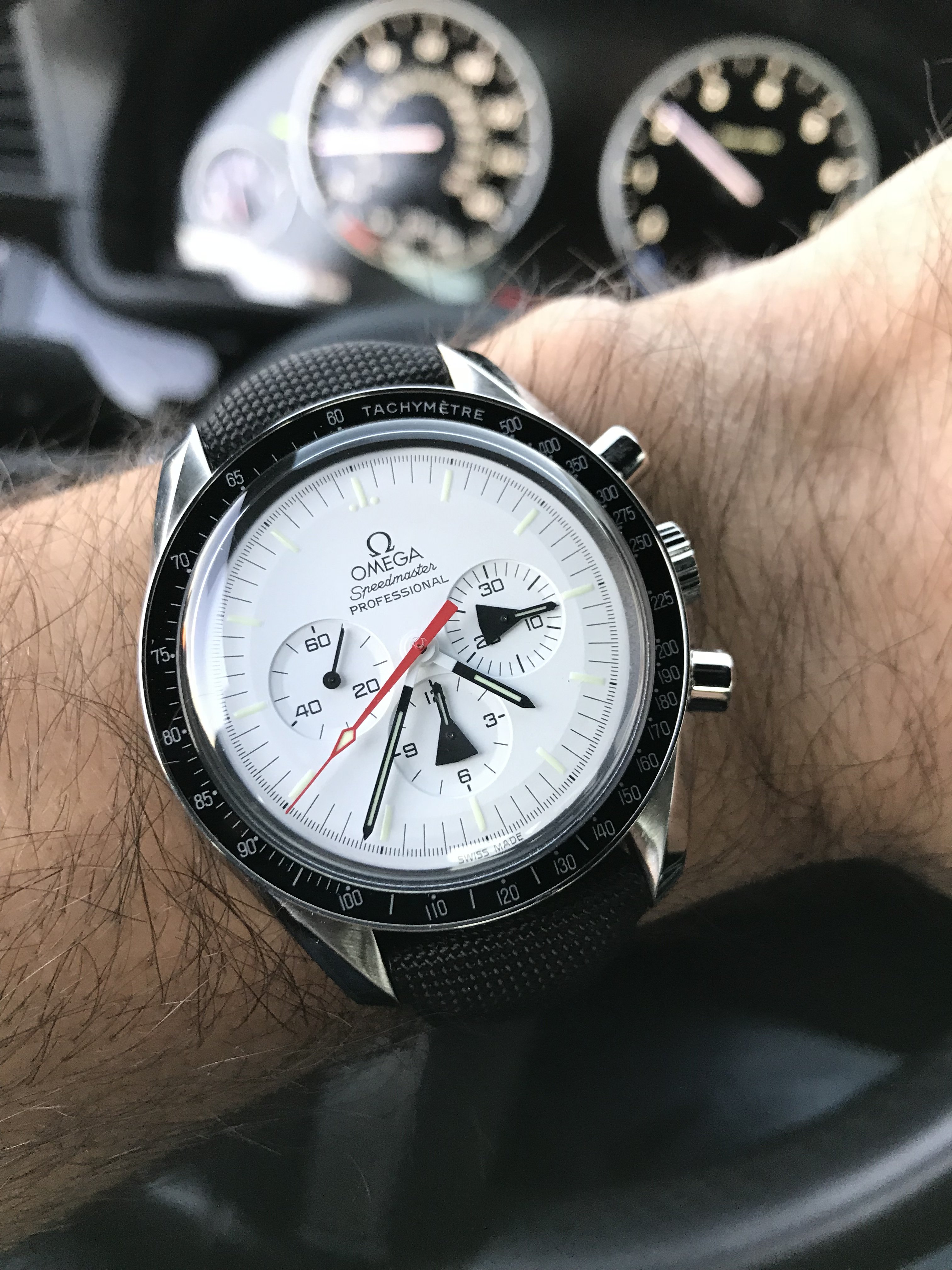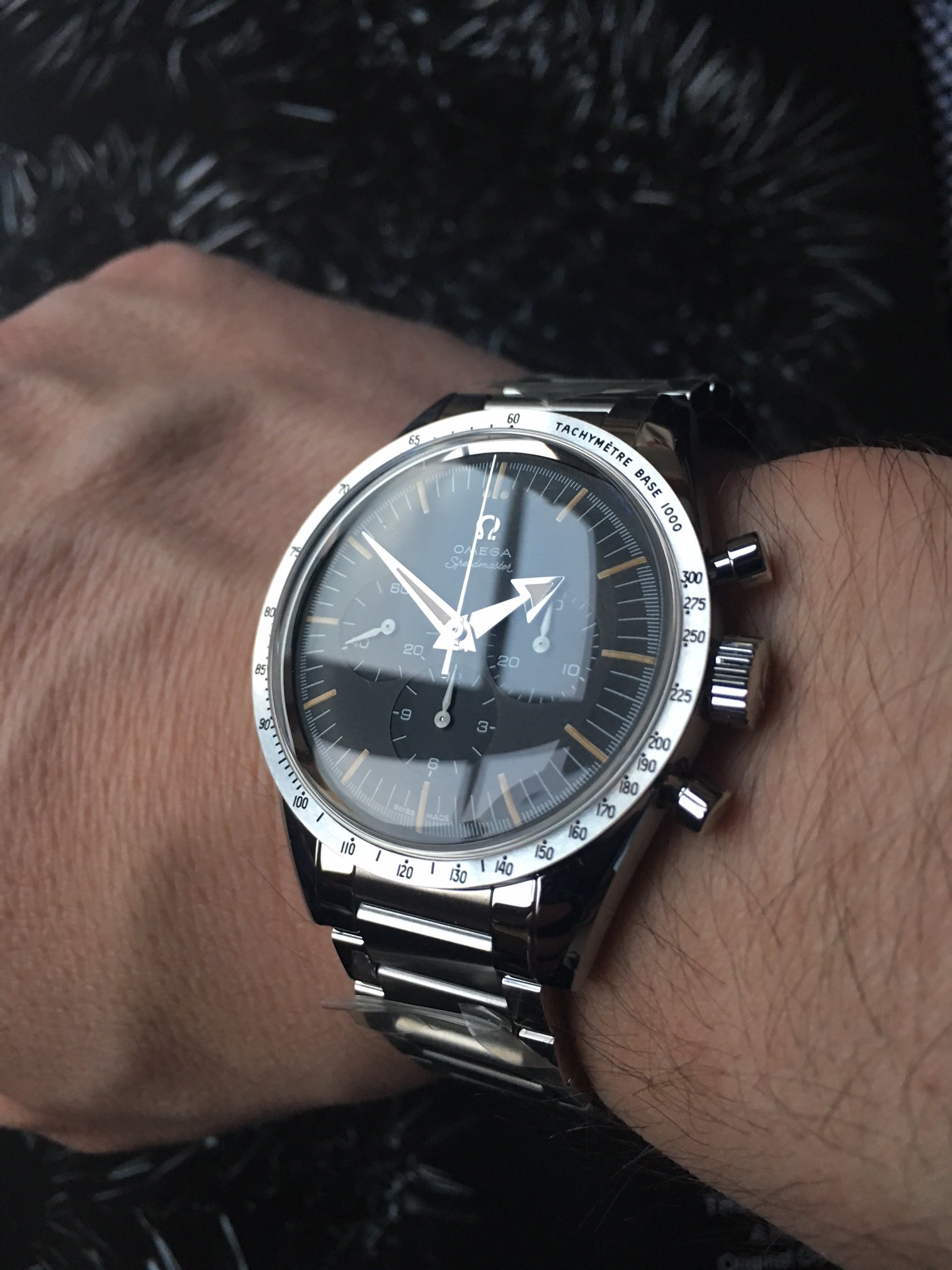 ·I picked up my Speedmaster 60th anniversary (0013/3557) together with my dad (he picked up his Speedy Tuesday) at Omega in Bienne and it is an amazing watch. I had one for review on Fratello Watches (here) a while ago, but I wore that one on the bracelet only (I didn't want to fiddle around with it too much, as it wasn't mine). The bracelet was my only concern about that watch, as the clasp is simply a bit too big (but otherwise fine imho). However, I changed it immediately to strap and that gives the watch an entirely different appeal (and feel). I love this piece, Omega did an excellent job. I got 4 (new) Speedmasters this year in my collection and I think this must be one of my favorites: the others being the Speedy Tuesday (of course), X-33 previously owned by an astronaut and the Speedmaster Tintin. It has been a nice year 😀