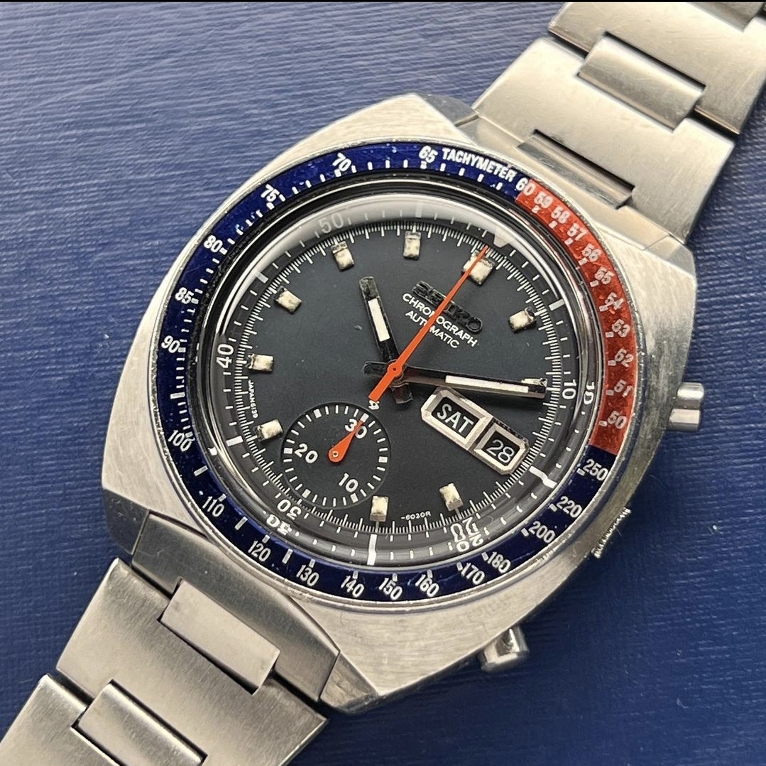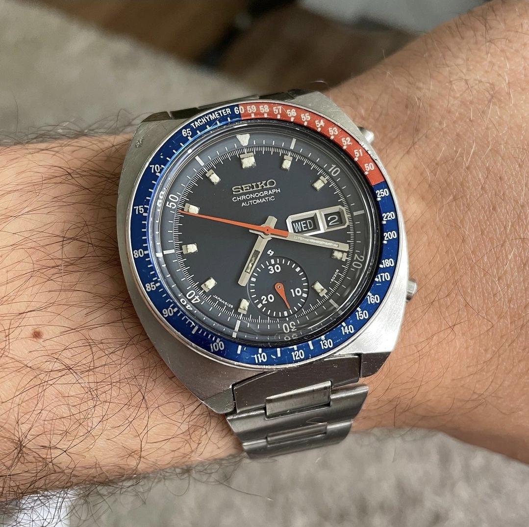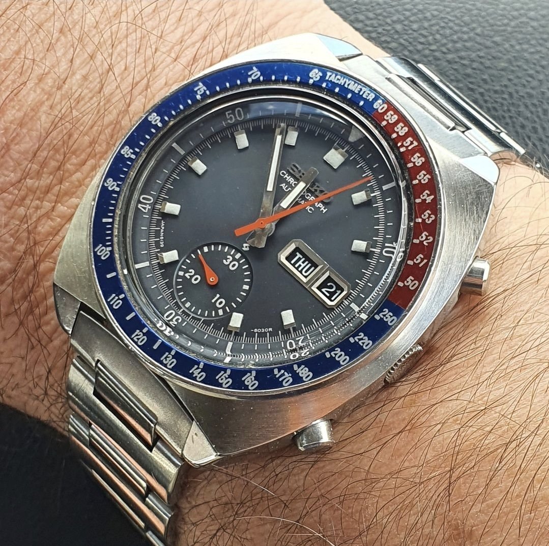 I am a newbie when it comes to vintage Seikos but I find some 6139 references awesome and have been wanting to add one to my collection for a while. This one, so far as I unterstood correctly, has a matching case with "Water Resistant", 17 jewel 6139B movement, and tapered bracelet, which are all consistent with the watch being from 1974, according to what I have been reading. The condition of the case and bracelet do please me with a nice sharp but used charm and character with a clean dial and hands with nicely coloured lume as well.