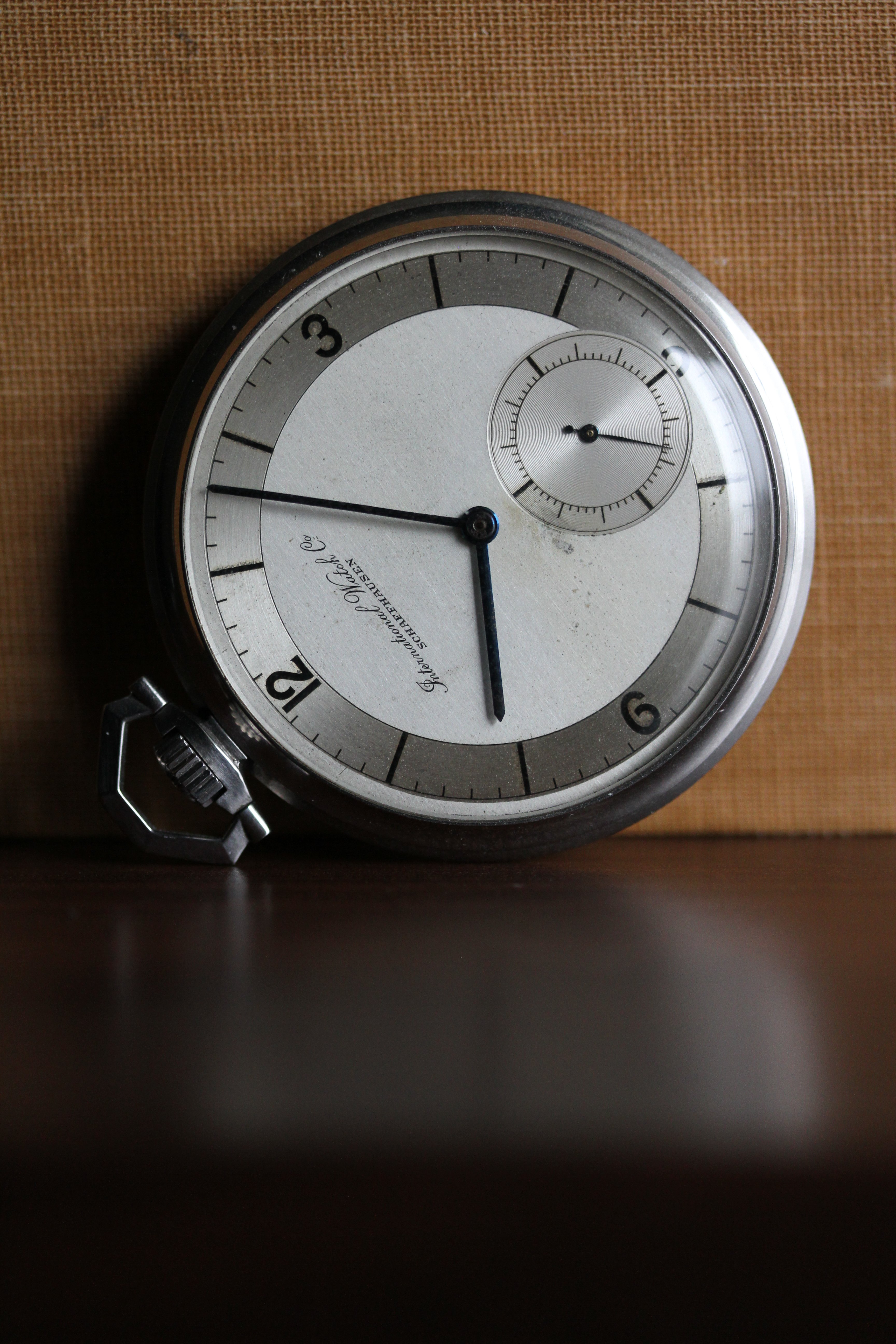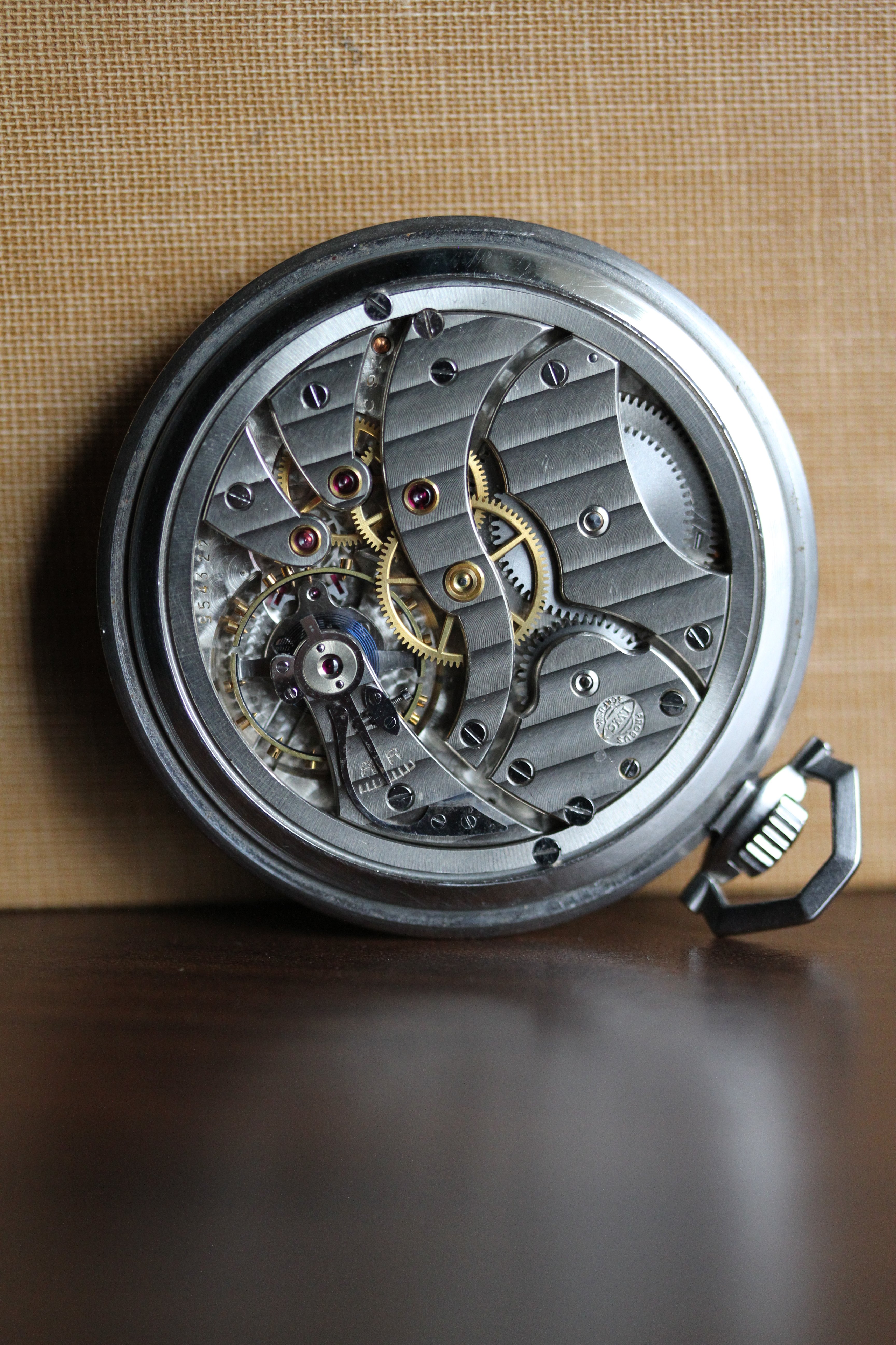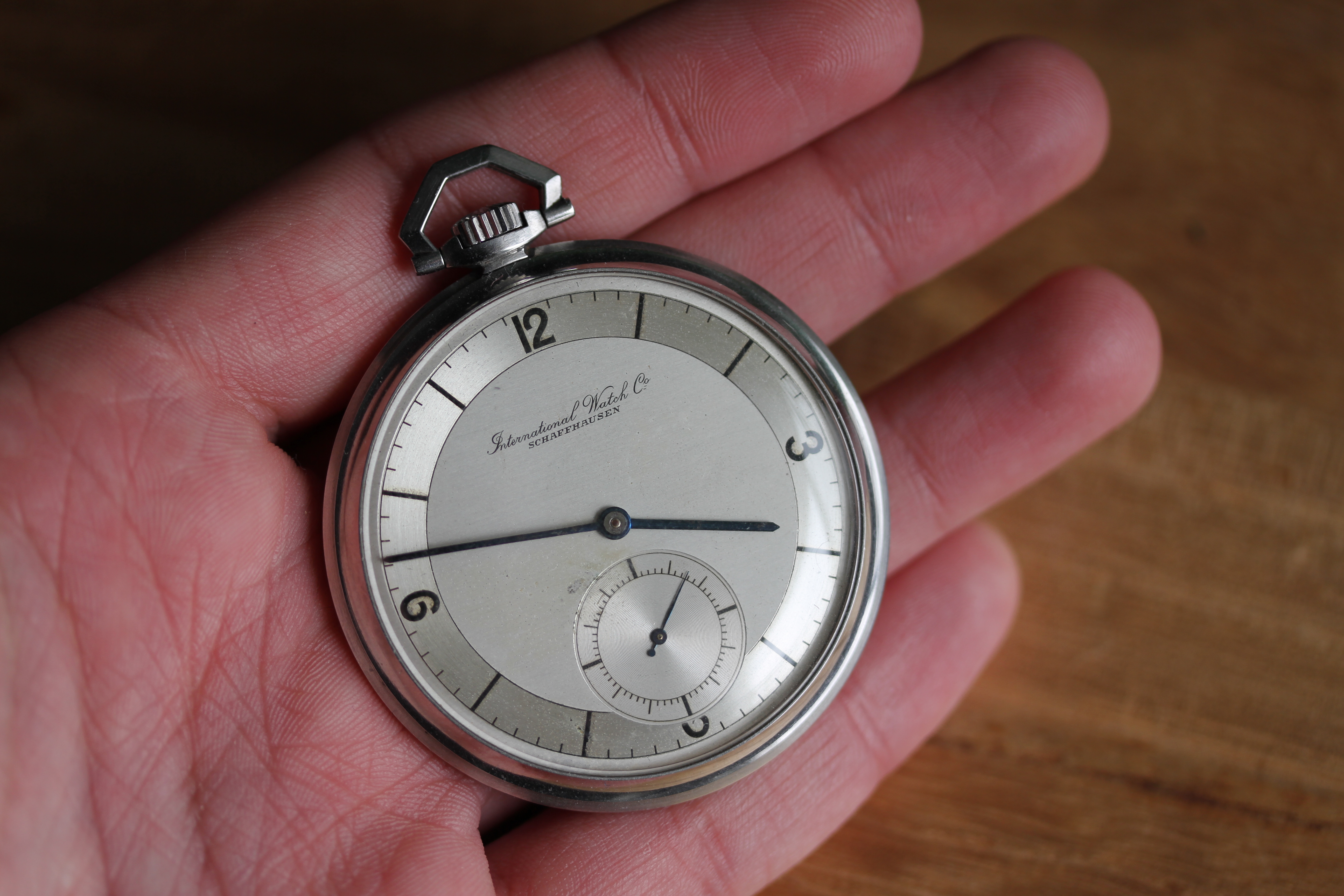 Here is a caliber 97 IWC watch in a stainless steel case. Lovely two-tone dial with some minor smudges. The serial number places it to the mid 1930's.