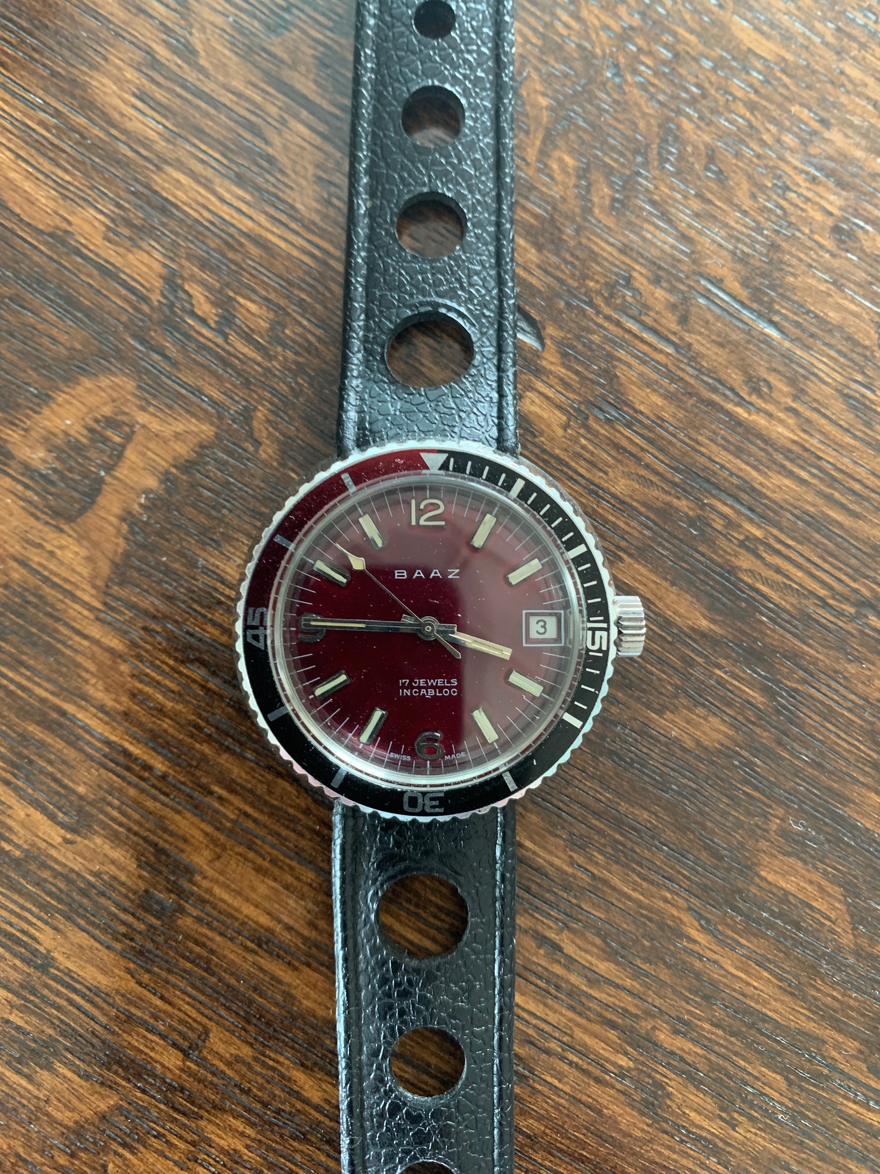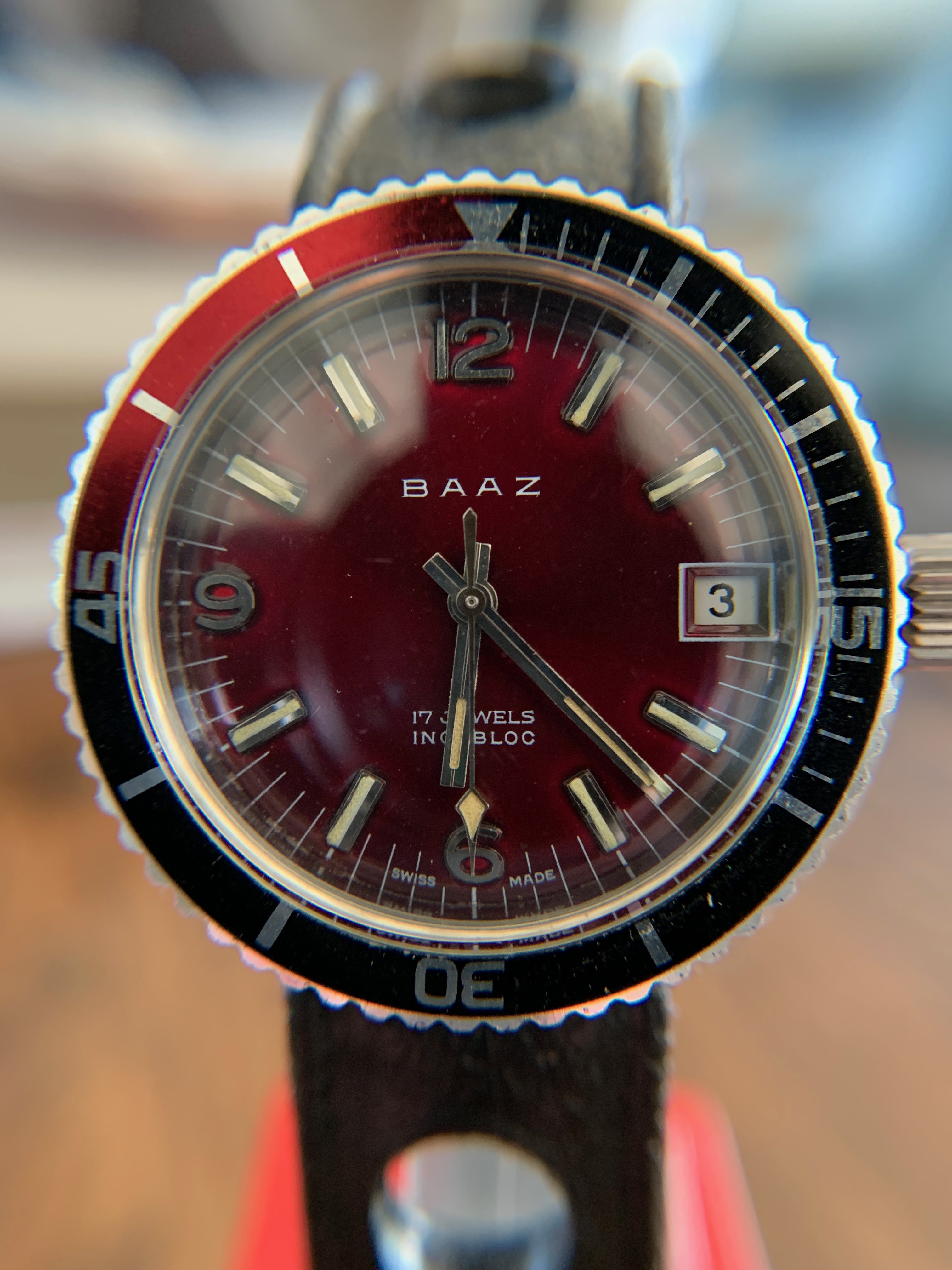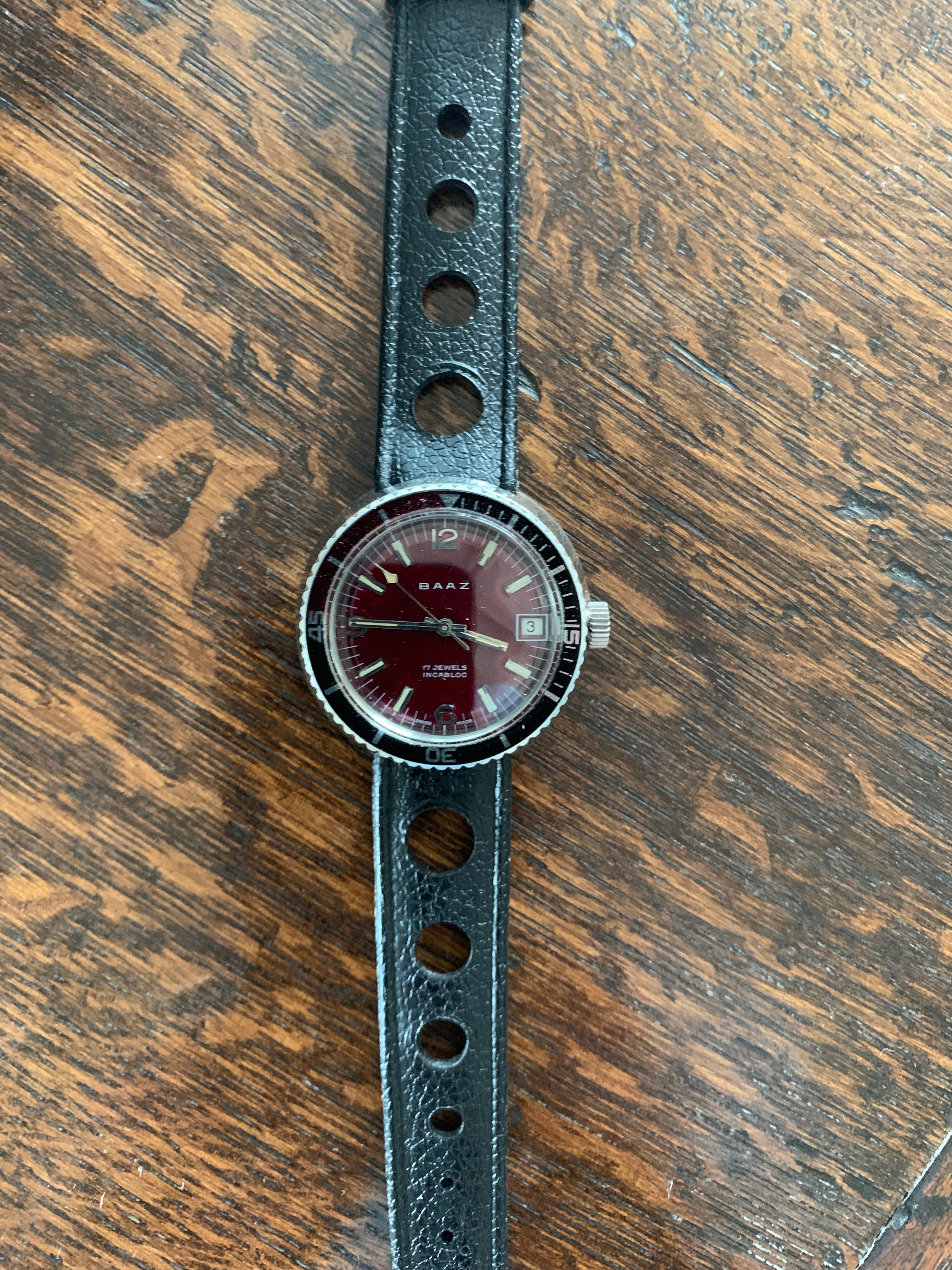 BAAZ watches were assembled in Wellington, NZ between the late-60's and early-80's from Swiss made parts (Watex Watch Co SA) with ETA movements. This was to avoid crippling import taxes which existed at the time on fully-built watches... This automatic example with date has a stunning deep burgundy dial with bezel colours/markings that work really well with the dial. The lume isn't tritium as holds the glow for some time. No service history but the watch keeps excellent time.