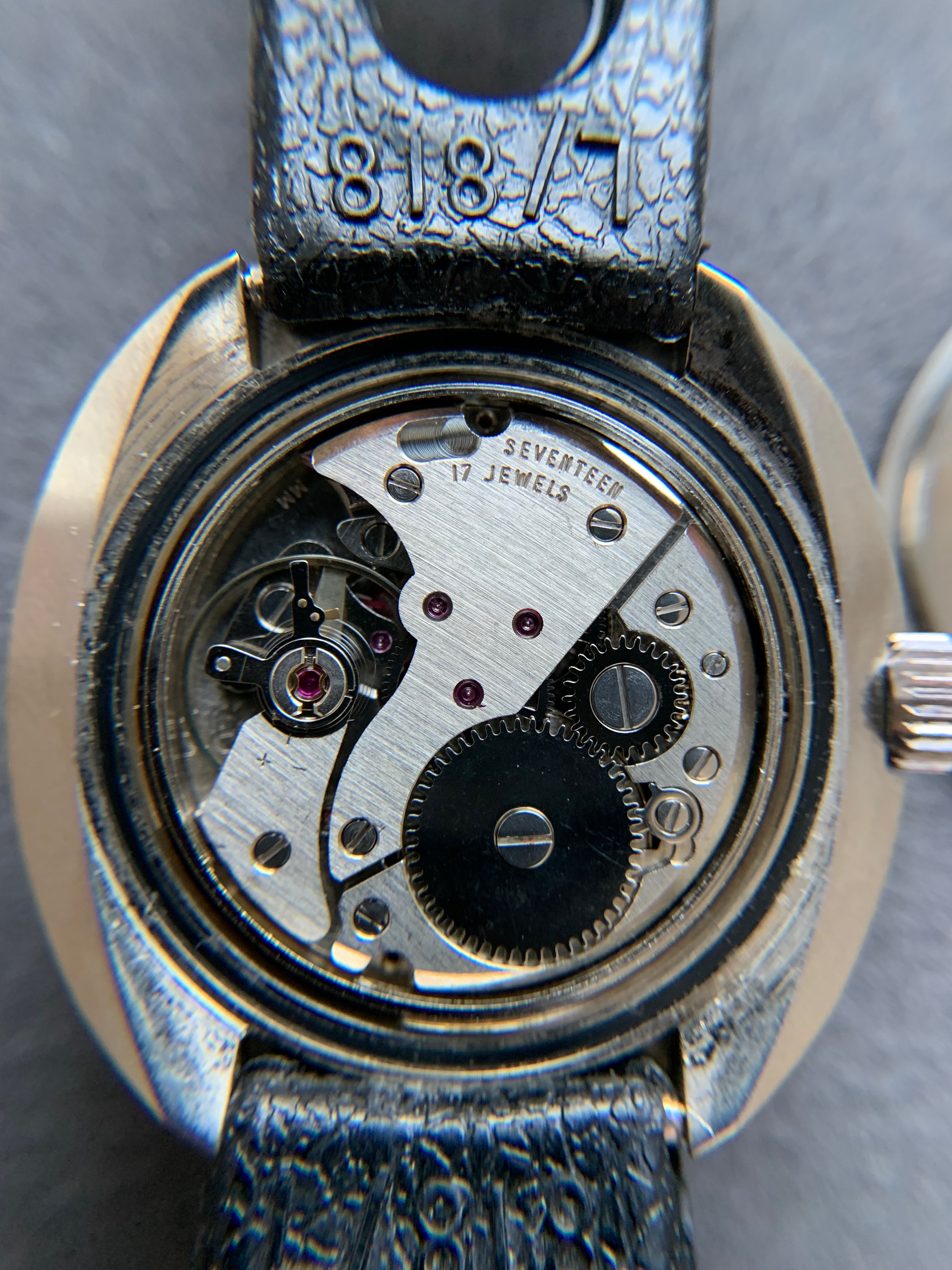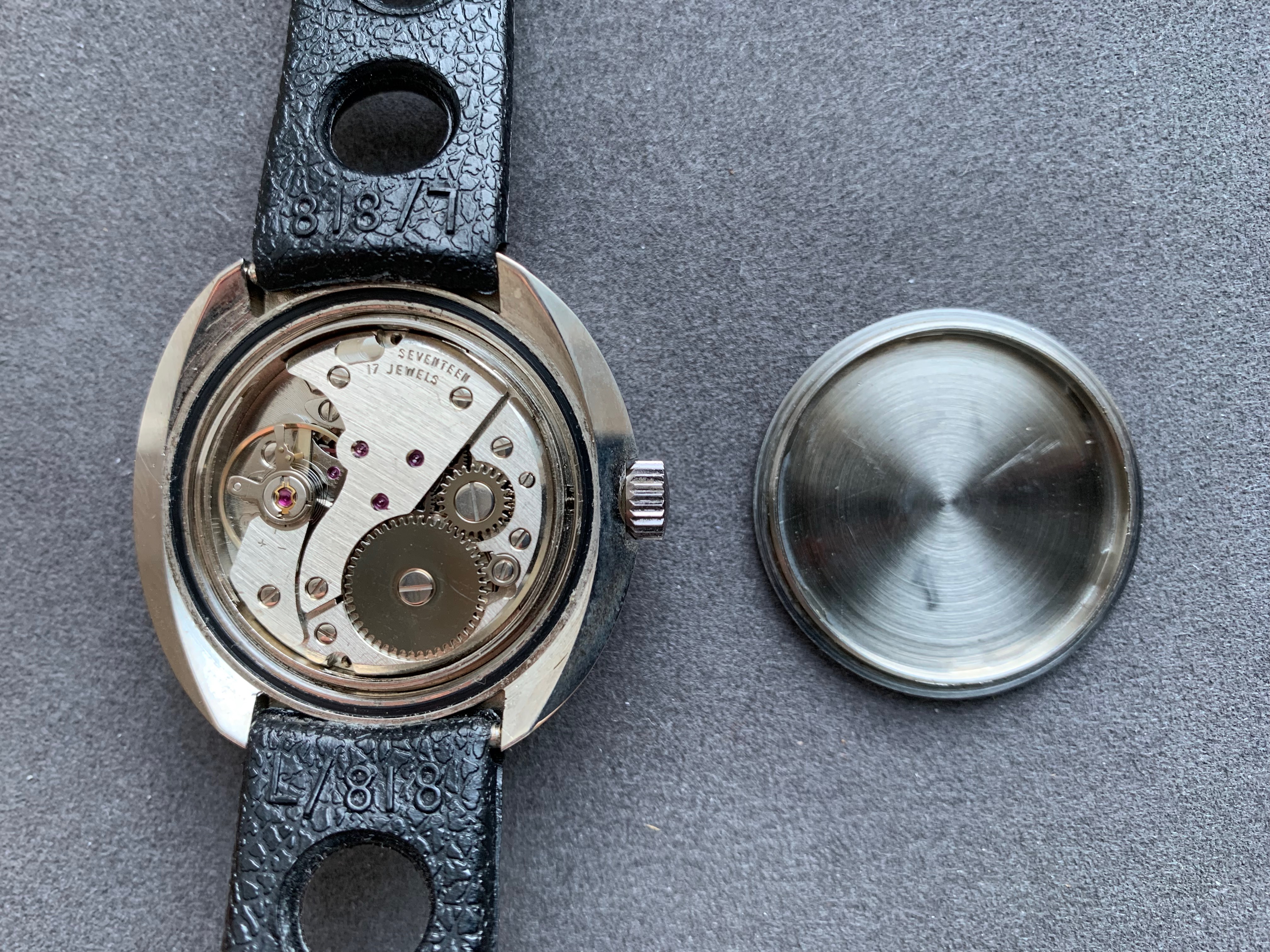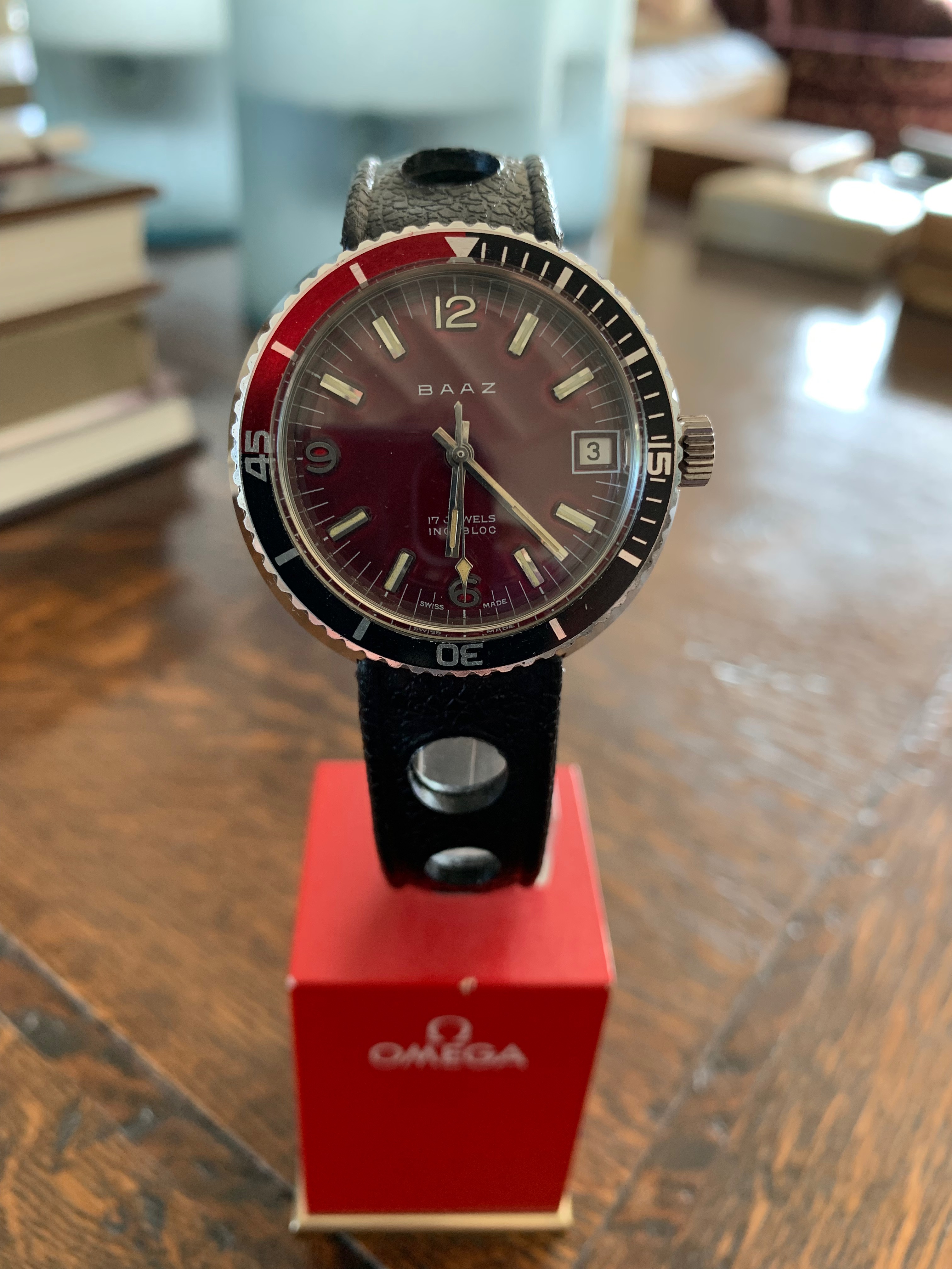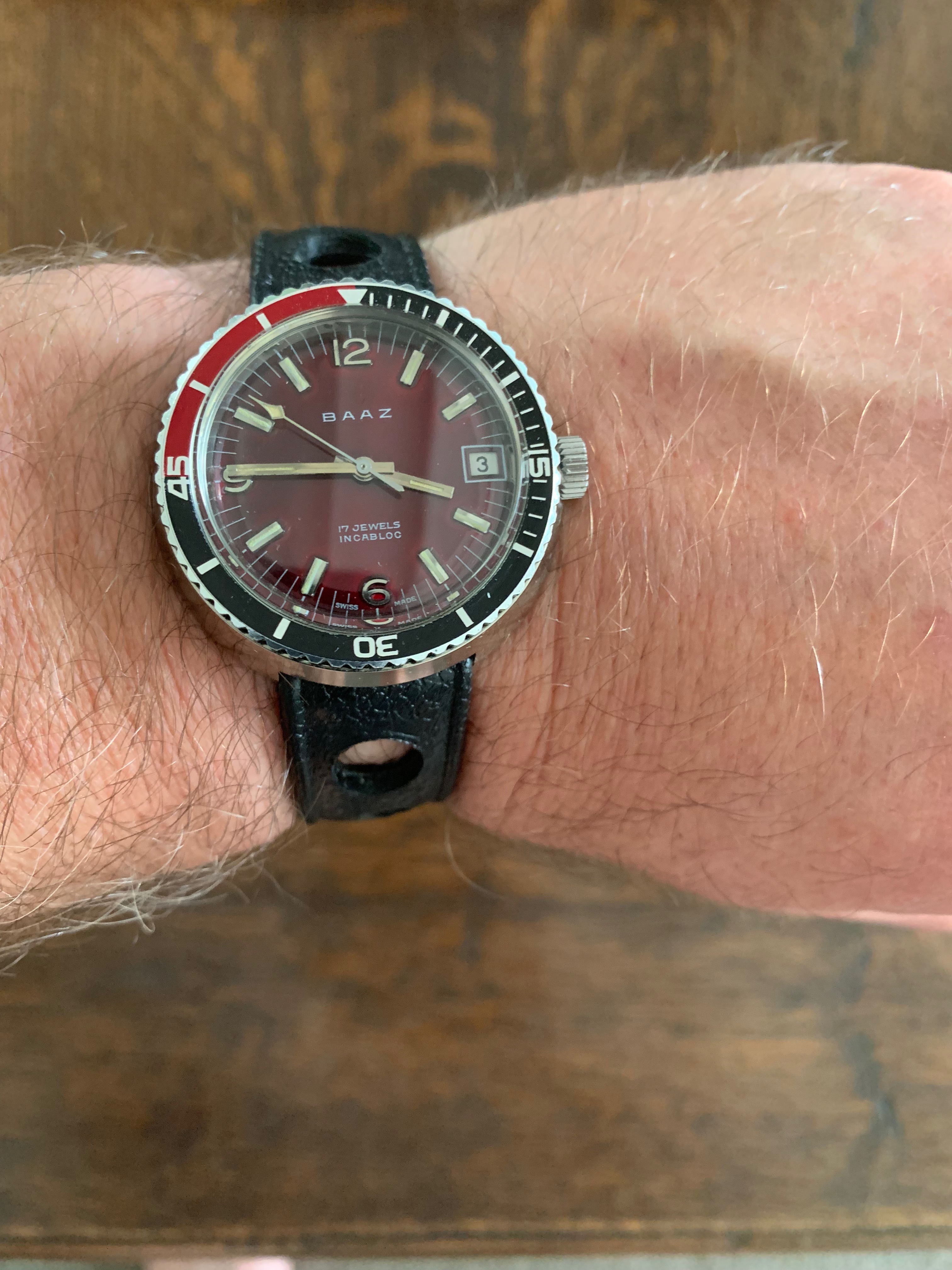 BAAZ watches were assembled in Wellington, NZ between the late-60's and early-80's from Swiss made parts (Watex Watch Co SA) with ETA movements. This was to avoid crippling import taxes which existed at the time on fully-built watches... This automatic example with date has a stunning deep burgundy dial with bezel colours/markings that work really well with the dial. The lume isn't tritium as holds the glow for some time. No service history but the watch keeps excellent time.