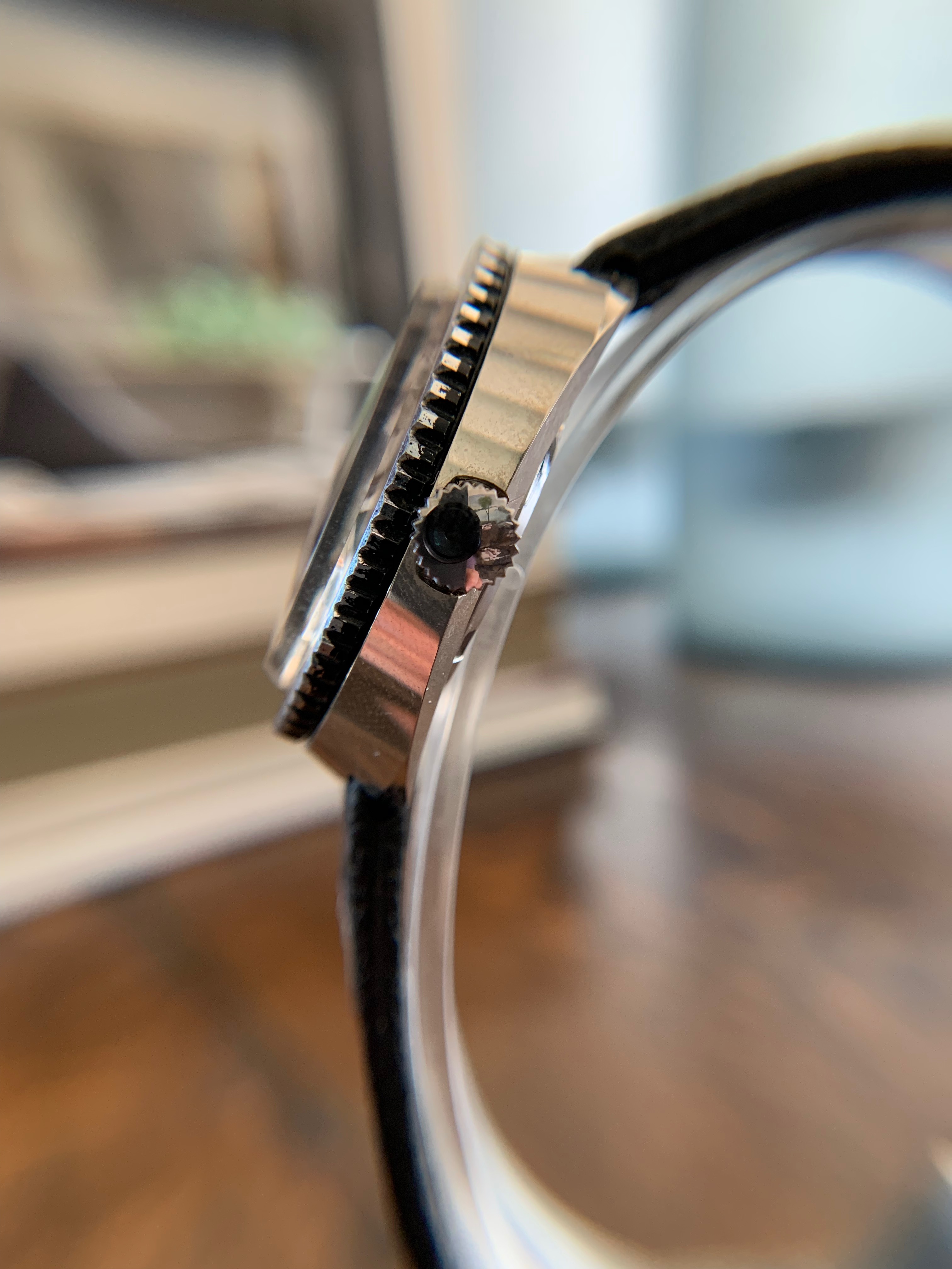 This 70's stainless steel diver has almost certainly never seen water - at least not with salt in it; it's in mint condition with unmarked hands, dial and bezel, and just a couple of tiny marks on the case.