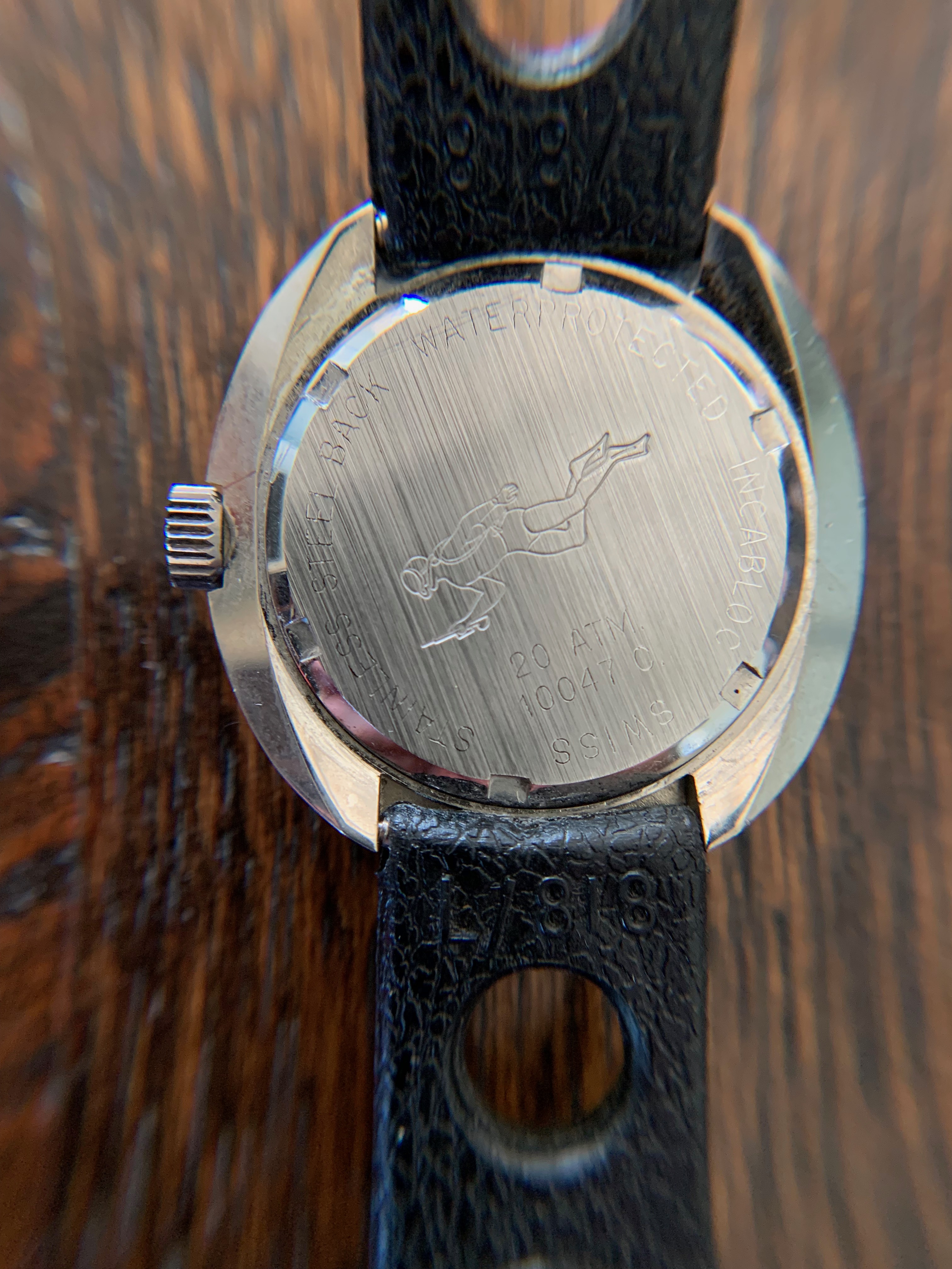 Case back is engraved with a diver/speargun combo. Outer bezel rotates easily. Claimed to be water resistant to 20 atmospheres...