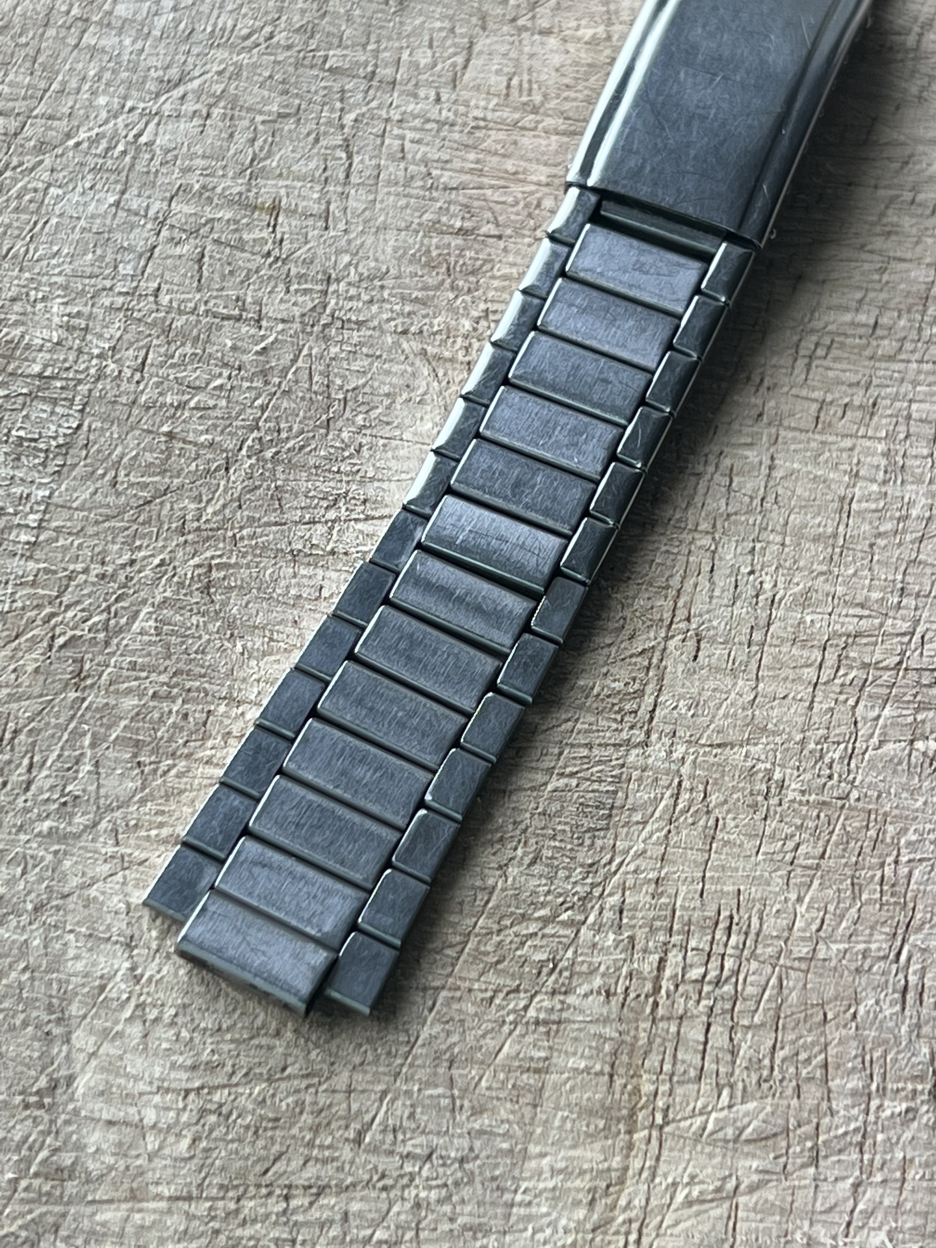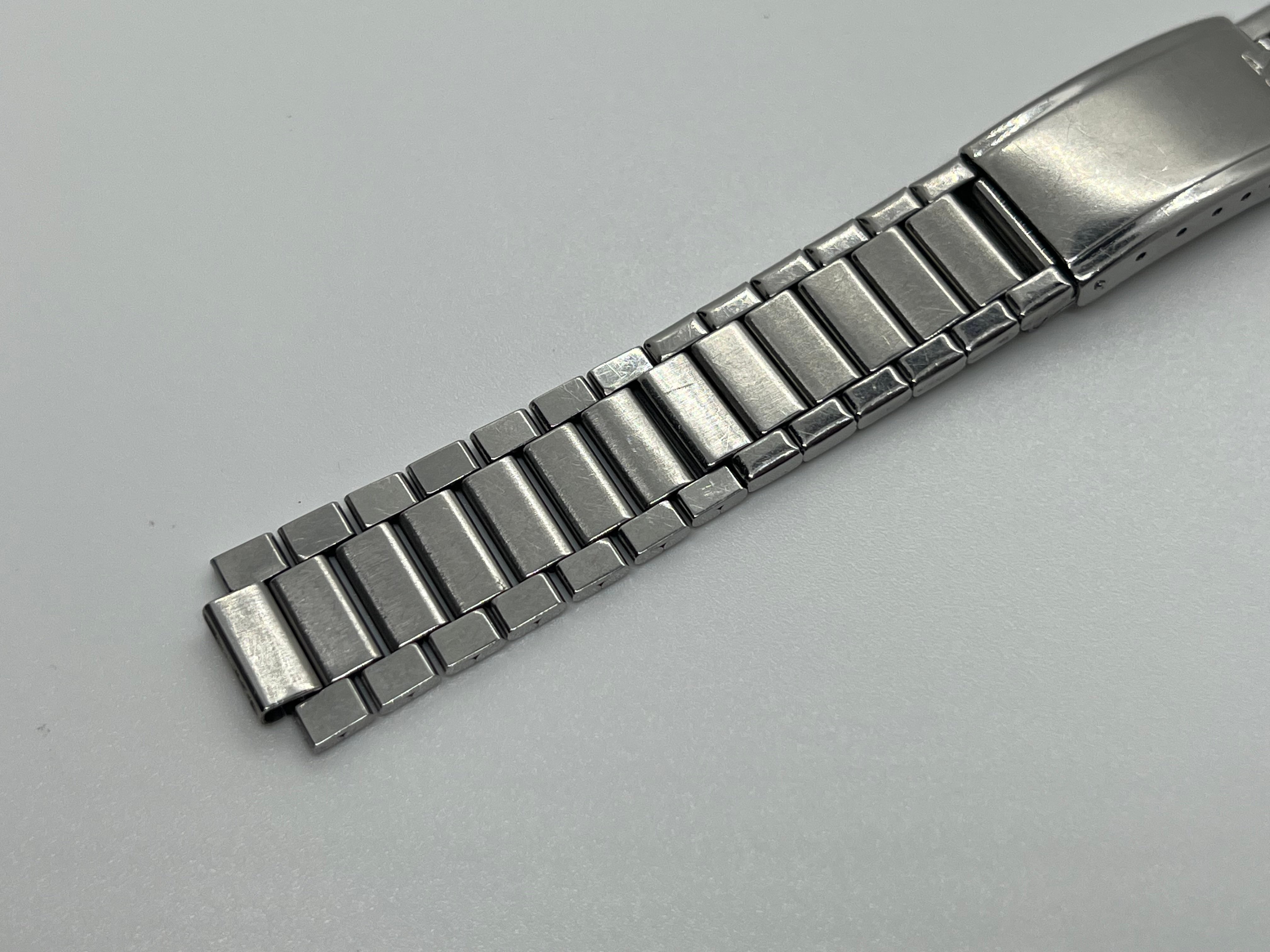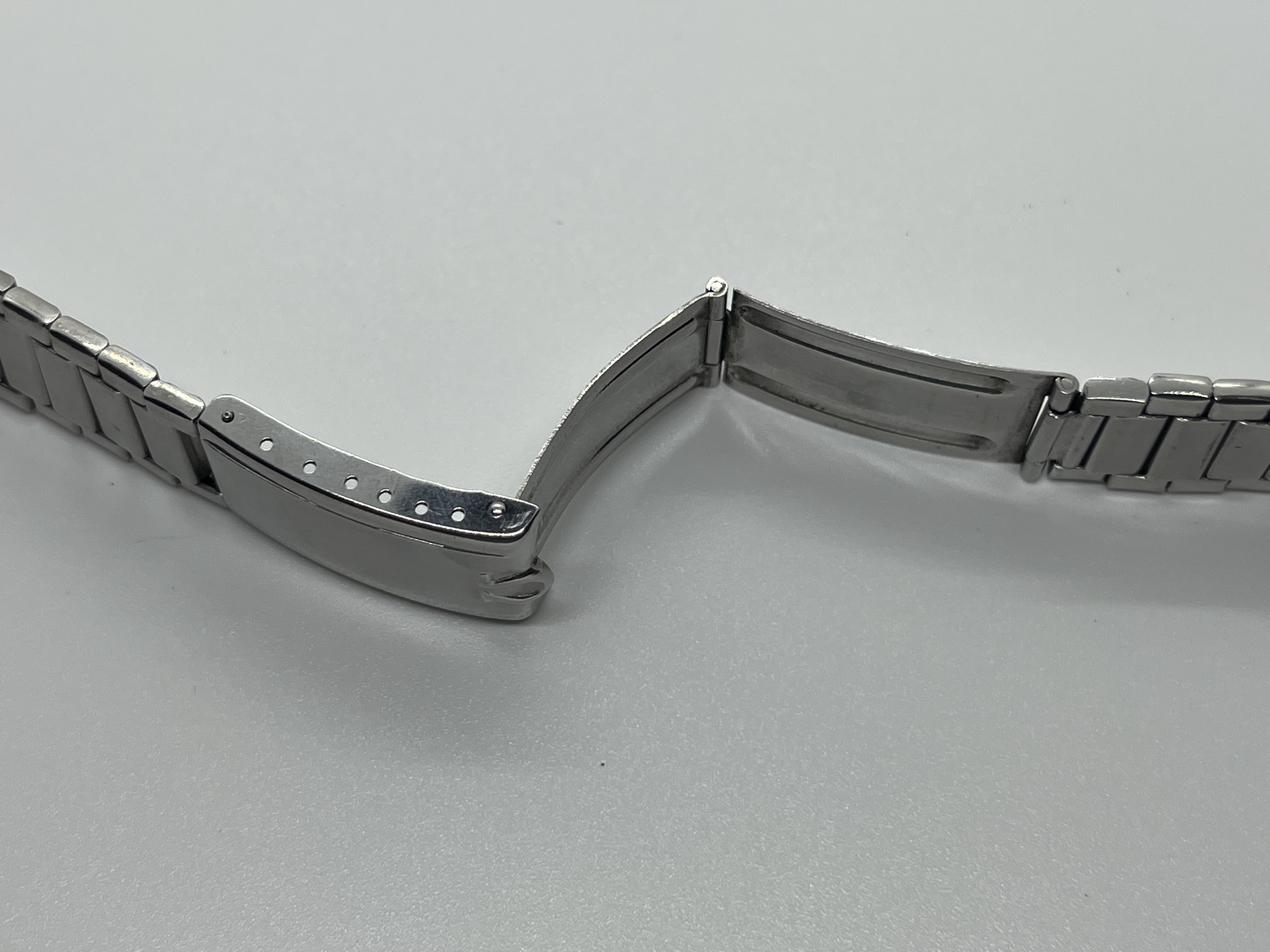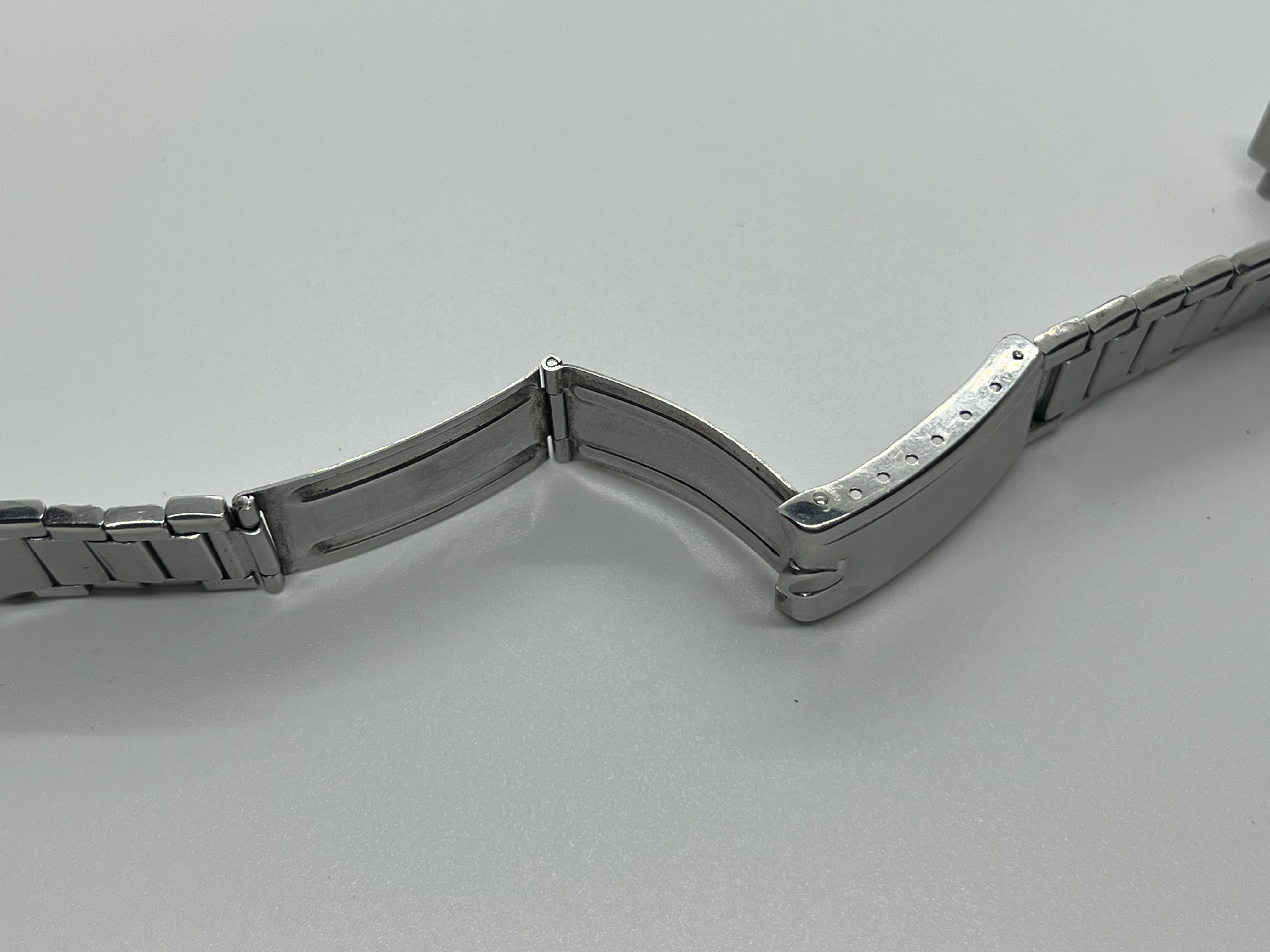 Produced in the 2nd quarter of 64, very nice condition. Clasp closes firmly, length of ~15.5cm. The original amount of 6+4 spring links. 2nd pictures shows maximum “bend” (=stretch). All flexi links work as they should, also shown in a picture. Brushing of the center links as a contrast to the outter ones intact, the expected scratches from >50 years, but nothing major.